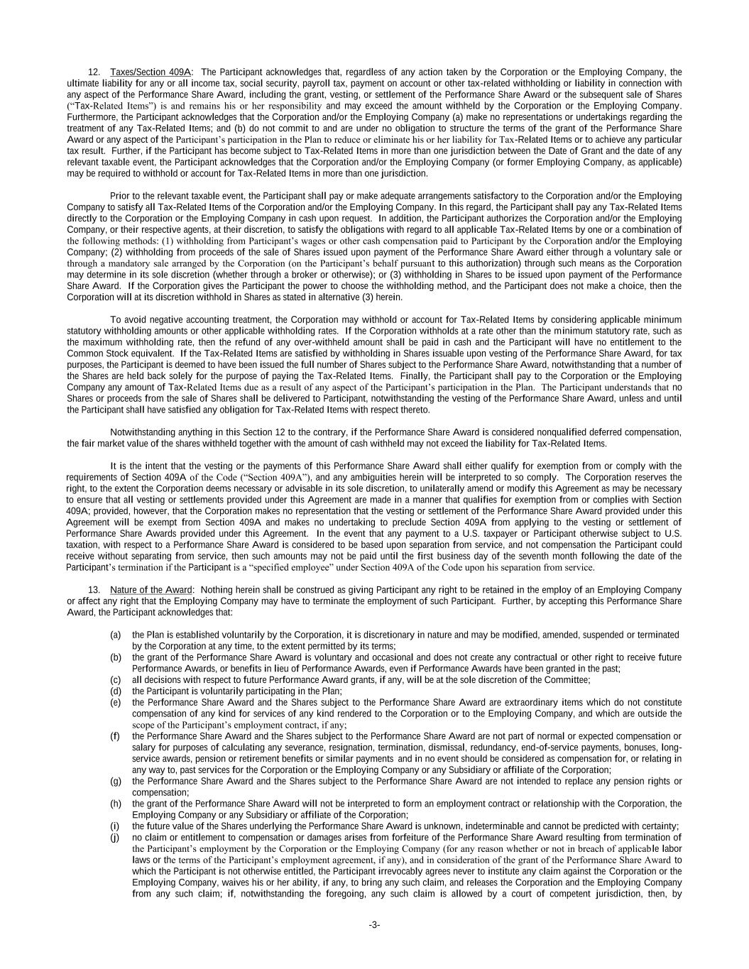 -3- 12. Taxes/Section 409A: The Participant acknowledges that, regardless of any action taken by the Corporation or the Employing Company, the ultimate liability for any or all income tax, social security, payroll tax, payment on account or other tax-related withholding or liability in connection with any aspect of the Performance Share Award, including the grant, vesting, or settlement of the Performance Share Award or the subsequent sale of Shares (“Tax-Related Items”) is and remains his or her responsibility and may exceed the amount withheld by the Corporation or the Employing Company. Furthermore, the Participant acknowledges that the Corporation and/or the Employing Company (a) make no representations or undertakings regarding the treatment of any Tax-Related Items; and (b) do not commit to and are under no obligation to structure the terms of the grant of the Performance Share Award or any aspect of the Participant’s participation in the Plan to reduce or eliminate his or her liability for Tax-Related Items or to achieve any particular tax result. Further, if the Participant has become subject to Tax-Related Items in more than one jurisdiction between the Date of Grant and the date of any relevant taxable event, the Participant acknowledges that the Corporation and/or the Employing Company (or former Employing Company, as applicable) may be required to withhold or account for Tax-Related Items in more than one jurisdiction. Prior to the relevant taxable event, the Participant shall pay or make adequate arrangements satisfactory to the Corporation and/or the Employing Company to satisfy all Tax-Related Items of the Corporation and/or the Employing Company. In this regard, the Participant shall pay any Tax-Related Items directly to the Corporation or the Employing Company in cash upon request. In addition, the Participant authorizes the Corporation and/or the Employing Company, or their respective agents, at their discretion, to satisfy the obligations with regard to all applicable Tax-Related Items by one or a combination of the following methods: (1) withholding from Participant’s wages or other cash compensation paid to Participant by the Corporation and/or the Employing Company; (2) withholding from proceeds of the sale of Shares issued upon payment of the Performance Share Award either through a voluntary sale or through a mandatory sale arranged by the Corporation (on the Participant’s behalf pursuant to this authorization) through such means as the Corporation may determine in its sole discretion (whether through a broker or otherwise); or (3) withholding in Shares to be issued upon payment of the Performance Share Award. If the Corporation gives the Participant the power to choose the withholding method, and the Participant does not make a choice, then the Corporation will at its discretion withhold in Shares as stated in alternative (3) herein. To avoid negative accounting treatment, the Corporation may withhold or account for Tax-Related Items by considering applicable minimum statutory withholding amounts or other applicable withholding rates. If the Corporation withholds at a rate other than the minimum statutory rate, such as the maximum withholding rate, then the refund of any over-withheld amount shall be paid in cash and the Participant will have no entitlement to the Common Stock equivalent. If the Tax-Related Items are satisfied by withholding in Shares issuable upon vesting of the Performance Share Award, for tax purposes, the Participant is deemed to have been issued the full number of Shares subject to the Performance Share Award, notwithstanding that a number of the Shares are held back solely for the purpose of paying the Tax-Related Items. Finally, the Participant shall pay to the Corporation or the Employing Company any amount of Tax-Related Items due as a result of any aspect of the Participant’s participation in the Plan. The Participant understands that no Shares or proceeds from the sale of Shares shall be delivered to Participant, notwithstanding the vesting of the Performance Share Award, unless and until the Participant shall have satisfied any obligation for Tax-Related Items with respect thereto. Notwithstanding anything in this Section 12 to the contrary, if the Performance Share Award is considered nonqualified deferred compensation, the fair market value of the shares withheld together with the amount of cash withheld may not exceed the liability for Tax-Related Items. It is the intent that the vesting or the payments of this Performance Share Award shall either qualify for exemption from or comply with the requirements of Section 409A of the Code (“Section 409A”), and any ambiguities herein will be interpreted to so comply. The Corporation reserves the right, to the extent the Corporation deems necessary or advisable in its sole discretion, to unilaterally amend or modify this Agreement as may be necessary to ensure that all vesting or settlements provided under this Agreement are made in a manner that qualifies for exemption from or complies with Section 409A; provided, however, that the Corporation makes no representation that the vesting or settlement of the Performance Share Award provided under this Agreement will be exempt from Section 409A and makes no undertaking to preclude Section 409A from applying to the vesting or settlement of Performance Share Awards provided under this Agreement. In the event that any payment to a U.S. taxpayer or Participant otherwise subject to U.S. taxation, with respect to a Performance Share Award is considered to be based upon separation from service, and not compensation the Participant could receive without separating from service, then such amounts may not be paid until the first business day of the seventh month following the date of the Participant’s termination if the Participant is a “specified employee” under Section 409A of the Code upon his separation from service. 13. Nature