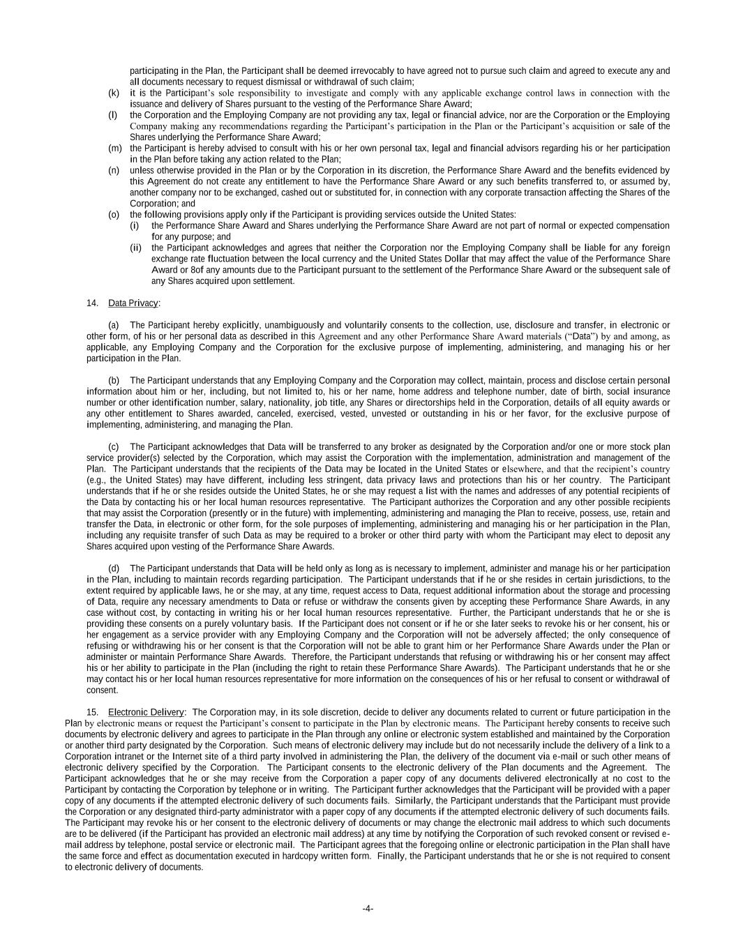 -4- participating in the Plan, the Participant shall be deemed irrevocably to have agreed not to pursue such claim and agreed to execute any and all documents necessary to request dismissal or withdrawal of such claim; (k) it is the Participant’s sole responsibility to investigate and comply with any applicable exchange control laws in connection with the issuance and delivery of Shares pursuant to the vesting of the Performance Share Award; (l) the Corporation and the Employing Company are not providing any tax, legal or financial advice, nor are the Corporation or the Employing Company making any recommendations regarding the Participant’s participation in the Plan or the Participant’s acquisition or sale of the Shares underlying the Performance Share Award; (m) the Participant is hereby advised to consult with his or her own personal tax, legal and financial advisors regarding his or her participation in the Plan before taking any action related to the Plan; (n) unless otherwise provided in the Plan or by the Corporation in its discretion, the Performance Share Award and the benefits evidenced by this Agreement do not create any entitlement to have the Performance Share Award or any such benefits transferred to, or assumed by, another company nor to be exchanged, cashed out or substituted for, in connection with any corporate transaction affecting the Shares of the Corporation; and (o) the following provisions apply only if the Participant is providing services outside the United States: (i) the Performance Share Award and Shares underlying the Performance Share Award are not part of normal or expected compensation for any purpose; and (ii) the Participant acknowledges and agrees that neither the Corporation nor the Employing Company shall be liable for any foreign exchange rate fluctuation between the local currency and the United States Dollar that may affect the value of the Performance Share Award or 8of any amounts due to the Participant pursuant to the settlement of the Performance Share Award or the subsequent sale of any Shares acquired upon settlement. 14. Data Privacy: (a) The Participant hereby explicitly, unambiguously and voluntarily consents to the collection, use, disclosure and transfer, in electronic or other form, of his or her personal data as described in this Agreement and any other Performance Share Award materials (“Data”) by and among, as applicable, any Employing Company and the Corporation for the exclusive purpose of implementing, administering, and managing his or her participation in the Plan. (b) The Participant understands that any Employing Company and the Corporation may collect, maintain, process and disclose certain personal information about him or her, including, but not limited to, his or her name, home address and telephone number, date of birth, social insurance number or other identification number, salary, nationality, job title, any Shares or directorships held in the Corporation, details of all equity awards or any other entitlement to Shares awarded, canceled, exercised, vested, unvested or outstanding in his or her favor, for the exclusive purpose of implementing, administering, and managing the Plan. (c) The Participant acknowledges that Data will be transferred to any broker as designated by the Corporation and/or one or more stock plan service provider(s) selected by the Corporation, which may assist the Corporation with the implementation, administration and management of the Plan. The Participant understands that the recipients of the Data may be located in the United States or elsewhere, and that the recipient’s country (e.g., the United States) may have different, including less stringent, data privacy laws and protections than his or her country. The Participant understands that if he or she resides outside the United States, he or she may request a list with the names and addresses of any potential recipients of the Data by contacting his or her local human resources representative. The Participant authorizes the Corporation and any other possible recipients that may assist the Corporation (presently or in the future) with implementing, administering and managing the Plan to receive, possess, use, retain and transfer the Data, in electronic or other form, for the sole purposes of implementing, administering and managing his or her participation in the Plan, including any requisite transfer of such Data as may be required to a broker or other third party with whom the Participant may elect to deposit any Shares acquired upon vesting of the Performance Share Awards. (d) The Participant understands that Data will be held only as long as is necessary to implement, administer and manage his or her participation in the Plan, including to maintain records regarding participation. The Participant understands that if he or she resides in certain jurisdictions, to the extent required by applicable laws, he or she may, at any time, request access to Data, request additional information about the storage and processing of Data, require any necessary amendments to Data or refuse or withdraw the consents given by accepting these Performance Share Awards, in any case without cost, by contacting in writing his or her local human resources representative. Further, the Participant understands that he or she is providing these consents on a purely voluntary basis. If the Participant does not consent or if he or she later seeks to revoke his or her consent, his or her engagement as a service provider with any Employing Company and the Corporation will not be adversely affected; the only consequence of refusing or withdrawing his or her consent is that the Corporation will not be able to grant him or her Performance Share Awards under the Plan or administer or maintain Performance Share Awards. Therefore, the Participant understands that refusing or withdrawing his or her consent may affect his or her ability to participate in the Plan (in