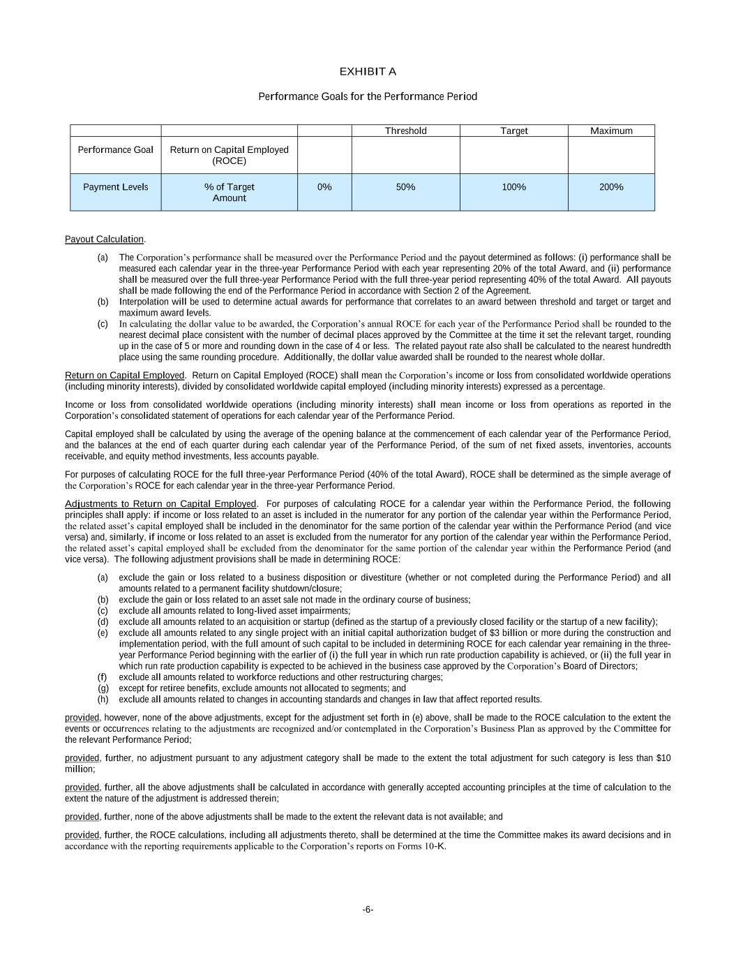 -6- EXHIBIT A Performance Goals for the Performance Period Threshold Target Maximum Performance Goal Return on Capital Employed (ROCE) Payment Levels % of Target Amount 0% 50% 100% 200% Payout Calculation. (a) The Corporation’s performance shall be measured over the Performance Period and the payout determined as follows: (i) performance shall be measured each calendar year in the three-year Performance Period with each year representing 20% of the total Award, and (ii) performance shall be measured over the full three-year Performance Period with the full three-year period representing 40% of the total Award. All payouts shall be made following the end of the Performance Period in accordance with Section 2 of the Agreement. (b) Interpolation will be used to determine actual awards for performance that correlates to an award between threshold and target or target and maximum award levels. (c) In calculating the dollar value to be awarded, the Corporation’s annual ROCE for each year of the Performance Period shall be rounded to the nearest decimal place consistent with the number of decimal places approved by the Committee at the time it set the relevant target, rounding up in the case of 5 or more and rounding down in the case of 4 or less. The related payout rate also shall be calculated to the nearest hundredth place using the same rounding procedure. Additionally, the dollar value awarded shall be rounded to the nearest whole dollar. Return on Capital Employed. Return on Capital Employed (ROCE) shall mean the Corporation’s income or loss from consolidated worldwide operations (including minority interests), divided by consolidated worldwide capital employed (including minority interests) expressed as a percentage. Income or loss from consolidated worldwide operations (including minority interests) shall mean income or loss from operations as reported in the Corporation’s consolidated statement of operations for each calendar year of the Performance Period. Capital employed shall be calculated by using the average of the opening balance at the commencement of each calendar year of the Performance Period, and the balances at the end of each quarter during each calendar year of the Performance Period, of the sum of net fixed assets, inventories, accounts receivable, and equity method investments, less accounts payable. For purposes of calculating ROCE for the full three-year Performance Period (40% of the total Award), ROCE shall be determined as the simple average of the Corporation’s ROCE for each calendar year in the three-year Performance Period. Adjustments to Return on Capital Employed. For purposes of calculating ROCE for a calendar year within the Performance Period, the following principles shall apply: if income or loss related to an asset is included in the numerator for any portion of the calendar year within the Performance Period, the related asset’s capital employed shall be included in the denominator for the same portion of the calendar year within the Performance Period (and vice versa) and, similarly, if income or loss related to an asset is excluded from the numerator for any portion of the calendar year within the Performance Period, the related asset’s capital employed shall be excluded from the denominator for the same portion of the calendar year within the Performance Period (and vice versa). The following adjustment provisions shall be made in determining ROCE: (a) exclude the gain or loss related to a business disposition or divestiture (whether or not completed during the Performance Period) and all amounts related to a permanent facility shutdown/closure; (b) exclude the gain or loss related to an asset sale not made in the ordinary course of business; (c) exclude all amounts related to long-lived asset impairments; (d) exclude all amounts related to an acquisition or startup (defined as the startup of a previously closed facility or the startup of a new facility); (e) exclude all amounts related to any single project with an initial capital authorization budget of $3 billion or more during the construction and implementation period, with the full amount of such capital to be included in determining ROCE for each calendar year remaining in the three- year Performance Period beginning with the earlier of (i) the full year in which run rate production capability is achieved, or (ii) the full year in which run rate production capability is expected to be achieved in the business case approved by the Corporation’s Board of Directors; (f) exclude all amounts related to workforce reductions and other restructuring charges; (g) except for retiree benefits, exclude amounts not allocated to segments; and (h) exclude all amounts related to changes in accounting standards and changes in law that affect reported results. provided, however, none of the above adjustments, except for the adjustment set forth in (e) above, shall be made to the ROCE calculation to the extent the events or occurrences relating to the adjustments are recognized and/or contemplated in the Corporation’s Business Plan as approved by the Committee for the relevant Performance Period; provided, further, no adjustment pursuant to any adjustment category shall be made to the extent the total adjustment for such category is less than $10 million; provided, further, all the above adjustments shall be calculated in accordance with generally accepted accounting principles at the time of calculation to the extent the nature of the adjustment is addressed therein; provided, further, none of the above adjustments shall be made to the extent the relevant data is not available; and provided, further, the ROCE calculations, including all adjustments thereto, shall be determined at the time the Committee makes its award decisions and in accordance with the reporting requirements applicable to the Corporation’s reports on Forms 10-K.