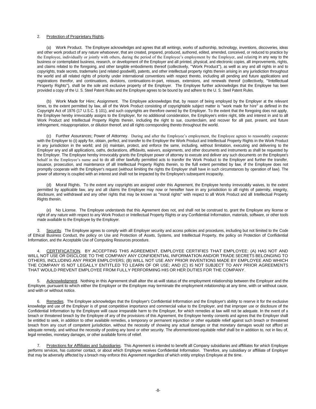 -8- 2. Protection of Proprietary Rights. (a) Work Product. The Employee acknowledges and agrees that all writings, works of authorship, technology, inventions, discoveries, ideas and other work product of any nature whatsoever, that are created, prepared, produced, authored, edited, amended, conceived, or reduced to practice by the Employee, individually or jointly with others, during the period of the Employee’s employment by the Employer, and relating in any way to the business or contemplated business, research, or development of the Employer and all printed, physical, and electronic copies, all improvements, rights, and claims related to the foregoing, and other tangible embodiments thereof (collectively, "Work Product"), as well as any and all rights in and to copyrights, trade secrets, trademarks (and related goodwill), patents, and other intellectual property rights therein arising in any jurisdiction throughout the world and all related rights of priority under international conventions with respect thereto, including all pending and future applications and registrations therefor, and continuations, divisions, continuations-in-part, reissues, extensions, and renewals thereof (collectively, "Intellectual Property Rights"), shall be the sole and exclusive property of the Employer. The Employee further acknowledges that the Employee has been provided a copy of the U. S. Steel Patent Rules and the Employee agrees to be bound by and adhere to the U. S. Steel Patent Rules. (b) Work Made for Hire; Assignment. The Employee acknowledges that, by reason of being employed by the Employer at the relevant times, to the extent permitted by law, all of the Work Product consisting of copyrightable subject matter is "work made for hire" as defined in the Copyright Act of 1976 (17 U.S.C. § 101), and such copyrights are therefore owned by the Employer. To the extent that the foregoing does not apply, the Employee hereby irrevocably assigns to the Employer, for no additional consideration, the Employee's entire right, title and interest in and to all Work Product and Intellectual Property Rights therein, including the right to sue, counterclaim, and recover for all past, present, and future infringement, misappropriation, or dilution thereof, and all rights corresponding thereto throughout the world. (c) Further Assurances; Power of Attorney. During and after the Employee’s employment, the Employee agrees to reasonably cooperate with the Employer to (i) apply for, obtain, perfect, and transfer to the Employer the Work Product and Intellectual Property Rights in the Work Product in any jurisdiction in the world; and (ii) maintain, protect, and enforce the same, including, without limitation, executing and delivering to the Employer any and all applications, oaths, declarations, affidavits, waivers, assignments, and other documents and instruments as shall be requested by the Employer. The Employee hereby irrevocably grants the Employer power of attorney to execute and deliver any such documents on the Employee's behalf in the Employee’s name and to do all other lawfully permitted acts to transfer the Work Product to the Employer and further the transfer, issuance, prosecution, and maintenance of all Intellectual Property Rights therein, to the full extent permitted by law, if the Employee does not promptly cooperate with the Employer's request (without limiting the rights the Employer shall have in such circumstances by operation of law). The power of attorney is coupled with an interest and shall not be impacted by the Employee's subsequent incapacity. (d) Moral Rights. To the extent any copyrights are assigned under this Agreement, the Employee hereby irrevocably waives, to the extent permitted by applicable law, any and all claims the Employee may now or hereafter have in any jurisdiction to all rights of paternity, integrity, disclosure, and withdrawal and any other rights that may be known as "moral rights" with respect to all Work Product and all Intellectual Property Rights therein. (e) No License. The Employee understands that this Agreement does not, and shall not be construed to, grant the Employee any license or right of any nature with respect to any Work Product or Intellectual Property Rights or any Confidential Information, materials, software, or other tools made available to the Employee by the Employer. 3. Security. The Employee agrees to comply with all Employer security and access policies and procedures, including but not limited to the Code of Ethical Business Conduct, the policy on Use and Protection of Assets, Systems, and Intellectual Property, the policy on Protection of Confidential Information, and the Acceptable Use of Computing Resources procedure. 4. CERTIFICATION. BY ACCEPTING THIS AGREEMENT, EMPLOYEE CERTIFIES THAT EMPLOYEE: (A) HAS NOT AND WILL NOT USE OR DISCLOSE TO THE COMPANY ANY CONFIDENTIAL INFORMATION AND/OR TRADE SECRETS BELONGING TO OTHERS, INCLUDING ANY PRIOR EMPLOYERS; (B) WILL NOT USE ANY PRIOR INVENTIONS MADE BY EMPLOYEE AND WHICH THE COMPANY IS NOT LEGALLY ENTITLED TO LEARN OF OR USE; AND (C) IS NOT SUBJECT TO ANY PRIOR AGREEMENTS THAT WOULD PREVENT EMPLOYEE FROM FULLY PERFORMING HIS OR HER DUTIES FOR THE COMPANY. 5. Acknowledgment. Nothing in this Agreement shall alter the at-will status of the employment relationship between the Employer and the Employee, pursuant to which either the Employer or the Employee may terminate the employment relationship at any time, with or without cause, and with or without notice. 6. Remedies. The Employee acknowledges that the Employer's Confidential Information and the Employer's ability to reserve it for the exclusive knowledge and use of the Employer is of great competitive importance and commercial value to the Employer, and that improper use or disclosure of the Confidential Information by the Employee will cause irreparable harm to the Employer, for which remedies at law will not be adequate. In the event o
