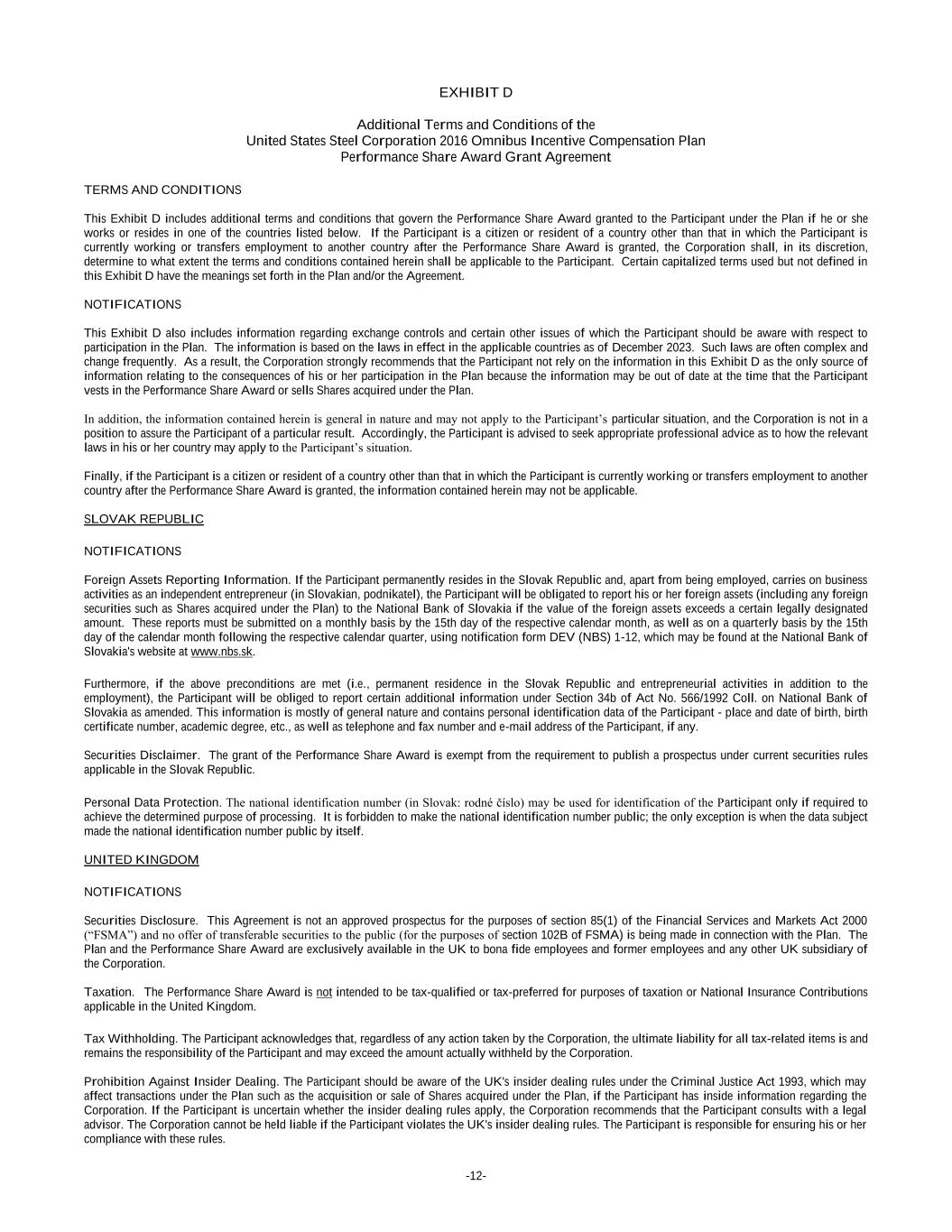 -12- EXHIBIT D Additional Terms and Conditions of the United States Steel Corporation 2016 Omnibus Incentive Compensation Plan Performance Share Award Grant Agreement TERMS AND CONDITIONS This Exhibit D includes additional terms and conditions that govern the Performance Share Award granted to the Participant under the Plan if he or she works or resides in one of the countries listed below. If the Participant is a citizen or resident of a country other than that in which the Participant is currently working or transfers employment to another country after the Performance Share Award is granted, the Corporation shall, in its discretion, determine to what extent the terms and conditions contained herein shall be applicable to the Participant. Certain capitalized terms used but not defined in this Exhibit D have the meanings set forth in the Plan and/or the Agreement. NOTIFICATIONS This Exhibit D also includes information regarding exchange controls and certain other issues of which the Participant should be aware with respect to participation in the Plan. The information is based on the laws in effect in the applicable countries as of December 2023. Such laws are often complex and change frequently. As a result, the Corporation strongly recommends that the Participant not rely on the information in this Exhibit D as the only source of information relating to the consequences of his or her participation in the Plan because the information may be out of date at the time that the Participant vests in the Performance Share Award or sells Shares acquired under the Plan. In addition, the information contained herein is general in nature and may not apply to the Participant’s particular situation, and the Corporation is not in a position to assure the Participant of a particular result. Accordingly, the Participant is advised to seek appropriate professional advice as to how the relevant laws in his or her country may apply to the Participant’s situation. Finally, if the Participant is a citizen or resident of a country other than that in which the Participant is currently working or transfers employment to another country after the Performance Share Award is granted, the information contained herein may not be applicable. SLOVAK REPUBLIC NOTIFICATIONS Foreign Assets Reporting Information. If the Participant permanently resides in the Slovak Republic and, apart from being employed, carries on business activities as an independent entrepreneur (in Slovakian, podnikatel), the Participant will be obligated to report his or her foreign assets (including any foreign securities such as Shares acquired under the Plan) to the National Bank of Slovakia if the value of the foreign assets exceeds a certain legally designated amount. These reports must be submitted on a monthly basis by the 15th day of the respective calendar month, as well as on a quarterly basis by the 15th day of the calendar month following the respective calendar quarter, using notification form DEV (NBS) 1-12, which may be found at the National Bank of Slovakia's website at www.nbs.sk. Furthermore, if the above preconditions are met (i.e., permanent residence in the Slovak Republic and entrepreneurial activities in addition to the employment), the Participant will be obliged to report certain additional information under Section 34b of Act No. 566/1992 Coll. on National Bank of Slovakia as amended. This information is mostly of general nature and contains personal identification data of the Participant - place and date of birth, birth certificate number, academic degree, etc., as well as telephone and fax number and e-mail address of the Participant, if any. Securities Disclaimer. The grant of the Performance Share Award is exempt from the requirement to publish a prospectus under current securities rules applicable in the Slovak Republic. Personal Data Protection. The national identification number (in Slovak: rodné číslo) may be used for identification of the Participant only if required to achieve the determined purpose of processing. It is forbidden to make the national identification number public; the only exception is when the data subject made the national identification number public by itself. UNITED KINGDOM NOTIFICATIONS Securities Disclosure. This Agreement is not an approved prospectus for the purposes of section 85(1) of the Financial Services and Markets Act 2000 (“FSMA”) and no offer of transferable securities to the public (for the purposes of section 102B of FSMA) is being made in connection with the Plan. The Plan and the Performance Share Award are exclusively available in the UK to bona fide employees and former employees and any other UK subsidiary of the Corporation. Taxation. The Performance Share Award is not intended to be tax-qualified or tax-preferred for purposes of taxation or National Insurance Contributions applicable in the United Kingdom. Tax Withholding. The Participant acknowledges that, regardless of any action taken by the Corporation, the ultimate liability for all tax-related items is and remains the responsibility of the Participant and may exceed the amount actually withheld by the Corporation. Prohibition Against Insider Dealing. The Participant should be aware of the UK's insider dealing rules under the Criminal Justice Act 1993, which may affect transactions under the Plan such as the acquisition or sale of Shares acquired under the Plan, if the Participant has inside information regarding the Corporation. If the Participant is uncertain whether the insider dealing rules apply, the Corporation recommends that the Participant consults with a legal advisor. The Corporation cannot be held liable if the Participant violates the UK's insider dealing rules. The Participant is responsible for ensuring his or her compliance with these rules.