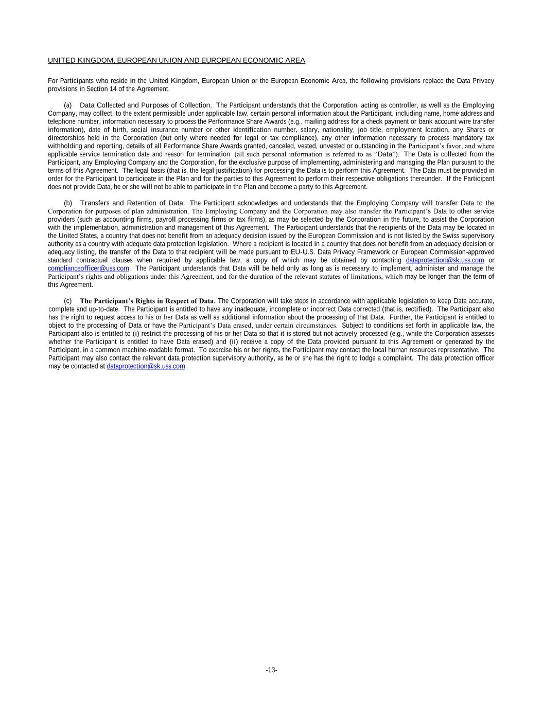 -13- UNITED KINGDOM, EUROPEAN UNION AND EUROPEAN ECONOMIC AREA For Participants who reside in the United Kingdom, European Union or the European Economic Area, the following provisions replace the Data Privacy provisions in Section 14 of the Agreement. (a) Data Collected and Purposes of Collection. The Participant understands that the Corporation, acting as controller, as well as the Employing Company, may collect, to the extent permissible under applicable law, certain personal information about the Participant, including name, home address and telephone number, information necessary to process the Performance Share Awards (e.g., mailing address for a check payment or bank account wire transfer information), date of birth, social insurance number or other identification number, salary, nationality, job title, employment location, any Shares or directorships held in the Corporation (but only where needed for legal or tax compliance), any other information necessary to process mandatory tax withholding and reporting, details of all Performance Share Awards granted, canceled, vested, unvested or outstanding in the Participant’s favor, and where applicable service termination date and reason for termination (all such personal information is referred to as “Data”). The Data is collected from the Participant, any Employing Company and the Corporation, for the exclusive purpose of implementing, administering and managing the Plan pursuant to the terms of this Agreement. The legal basis (that is, the legal justification) for processing the Data is to perform this Agreement. The Data must be provided in order for the Participant to participate in the Plan and for the parties to this Agreement to perform their respective obligations thereunder. If the Participant does not provide Data, he or she will not be able to participate in the Plan and become a party to this Agreement. (b) Transfers and Retention of Data. The Participant acknowledges and understands that the Employing Company will transfer Data to the Corporation for purposes of plan administration. The Employing Company and the Corporation may also transfer the Participant’s Data to other service providers (such as accounting firms, payroll processing firms or tax firms), as may be selected by the Corporation in the future, to assist the Corporation with the implementation, administration and management of this Agreement. The Participant understands that the recipients of the Data may be located in the United States, a country that does not benefit from an adequacy decision issued by the European Commission and is not listed by the Swiss supervisory authority as a country with adequate data protection legislation. Where a recipient is located in a country that does not benefit from an adequacy decision or adequacy listing, the transfer of the Data to that recipient will be made pursuant to EU-U.S. Data Privacy Framework or European Commission-approved standard contractual clauses when required by applicable law, a copy of which may be obtained by contacting dataprotection@sk.uss.com or complianceofficer@uss.com. The Participant understands that Data will be held only as long as is necessary to implement, administer and manage the Participant’s rights and obligations under this Agreement, and for the duration of the relevant statutes of limitations, which may be longer than the term of this Agreement. (c) The Participant’s Rights in Respect of Data. The Corporation will take steps in accordance with applicable legislation to keep Data accurate, complete and up-to-date. The Participant is entitled to have any inadequate, incomplete or incorrect Data corrected (that is, rectified). The Participant also has the right to request access to his or her Data as well as additional information about the processing of that Data. Further, the Participant is entitled to object to the processing of Data or have the Participant’s Data erased, under certain circumstances. Subject to conditions set forth in applicable law, the Participant also is entitled to (i) restrict the processing of his or her Data so that it is stored but not actively processed (e.g., while the Corporation assesses whether the Participant is entitled to have Data erased) and (ii) receive a copy of the Data provided pursuant to this Agreement or generated by the Participant, in a common machine-readable format. To exercise his or her rights, the Participant may contact the local human resources representative. The Participant may also contact the relevant data protection supervisory authority, as he or she has the right to lodge a complaint. The data protection officer may be contacted at dataprotection@sk.uss.com.