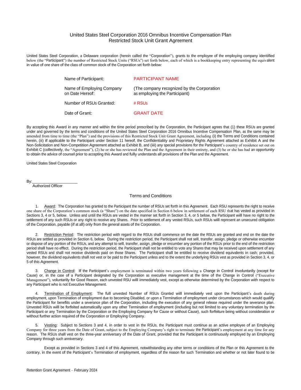 Retention Grant Agreement – February 2024 United States Steel Corporation 2016 Omnibus Incentive Compensation Plan Restricted Stock Unit Grant Agreement United States Steel Corporation, a Delaware corporation (herein called the “Corporation”), grants to the employee of the employing company identified below (the “Participant”) the number of Restricted Stock Units (“RSUs”) set forth below, each of which is a bookkeeping entry representing the equivalent in value of one share of the class of common stock of the Corporation set forth below: Name of Participant: PARTICIPANT NAME Name of Employing Company (The company recognized by the Corporation on Date Hereof: as employing the Participant) Number of RSUs Granted: # RSUs Date of Grant: GRANT DATE By accepting this Award in any manner and within the time period prescribed by the Corporation, the Participant agrees that (1) these RSUs are granted under and governed by the terms and conditions of the United States Steel Corporation 2016 Omnibus Incentive Compensation Plan, as the same may be amended from time to time (the “Plan”) and the provisions of this Restricted Stock Unit Grant Agreement, including (i) the Terms and Conditions contained herein, (ii) if applicable to the Participant under Section 11 hereof, the Confidentiality and Proprietary Rights Agreement attached as Exhibit A and the Non-Solicitation and Non-Competition Agreement attached as Exhibit B, and (iii) any special provisions for the Participant’s country of residence set out on Exhibit C (collectively, the “Agreement”), (2) he or she has reviewed the Plan and the Agreement in their entirety, and (3) he or she has had an opportunity to obtain the advice of counsel prior to accepting this Award and fully understands all provisions of the Plan and the Agreement. United States Steel Corporation By:_______________________ Authorized Officer Terms and Conditions 1. Award: The Corporation has granted to the Participant the number of RSUs set forth in this Agreement. Each RSU represents the right to receive one share of the Corporation’s common stock (a “Share”) on the date specified in Section 6 below in settlement of each RSU that has vested as provided in Sections 3, 4 or 5, below. Unless and until the RSUs are vested in the manner set forth in Section 3, 4, or 5 below, the Participant will have no right to the settlement of any such RSUs or any right to receive any Shares. Prior to settlement of any vested RSUs, such RSUs will represent an unsecured obligation of the Corporation, payable (if at all) only from the general assets of the Corporation. 2. Restriction Period: The restriction period with regard to the RSUs shall commence on the date the RSUs are granted and end on the date the RSUs are settled as provided in Section 6, below. During the restriction period, the Participant shall not sell, transfer, assign, pledge or otherwise encumber or dispose of any portion of the RSUs, and any attempt to sell, transfer, assign, pledge or encumber any portion of the RSUs prior to the end of the restriction period shall have no effect. During the restriction period, the Participant shall not be entitled to vote any Shares that may be received upon settlement of any vested RSUs and shall not receive dividends paid on those Shares. The Participant shall be entitled to receive dividend equivalents in cash; provided, however, the dividend equivalents shall not vest or be paid to the Participant unless and to the extent the underlying RSUs vest as provided in Section 3, 4, or 5 of this Agreement. 3. Change in Control: If the Participant’s employment is terminated within two years following a Change in Control involuntarily (except for Cause) or, in the case of a Participant designated by the Corporation as executive management at the time of the Change in Control (“Executive Management”), voluntarily for Good Reason, each unvested RSU will immediately vest, except as otherwise determined by the Corporation with respect to any Participant who is not Executive Management. 4. Termination of Employment: The full unvested Number of RSUs Granted will immediately vest upon the Participant’s death during employment, upon Termination of employment due to becoming Disabled, or upon a Termination of employment under circumstances which would qualify the Participant for benefits under a severance plan of the Corporation, including the execution of any general release required under the severance plan. Unvested RSUs will be forfeited automatically upon any other Termination of employment (including but not limited to any voluntary termination by the Participant or any Termination by the Corporation or the Employing Company for Cause or without Cause), such forfeiture being without consideration or without further action required of the Corporation or Employing Company. 5. Vesting: Subject to Sections 3 and 4, in order to vest in the RSUs, the Participant must continue as an active employee of an Employing Company for three years from the Date of Grant, subject to the Employing Company’s right to terminate the Participant’s employment at any time for any reason. The RSUs shall vest on the three-year anniversary of the Date of Grant, provided that the Participant is continuously employed by an Employing Company through such anniversary. Except as provided in Sections 3 and 4 of this Agreement, notwithstanding any other terms or conditions of the Plan or this Agreement to the contrary, in the event of the Participant’s Termination of employment, regardless of the reason for such Termination and whether or not later found to be