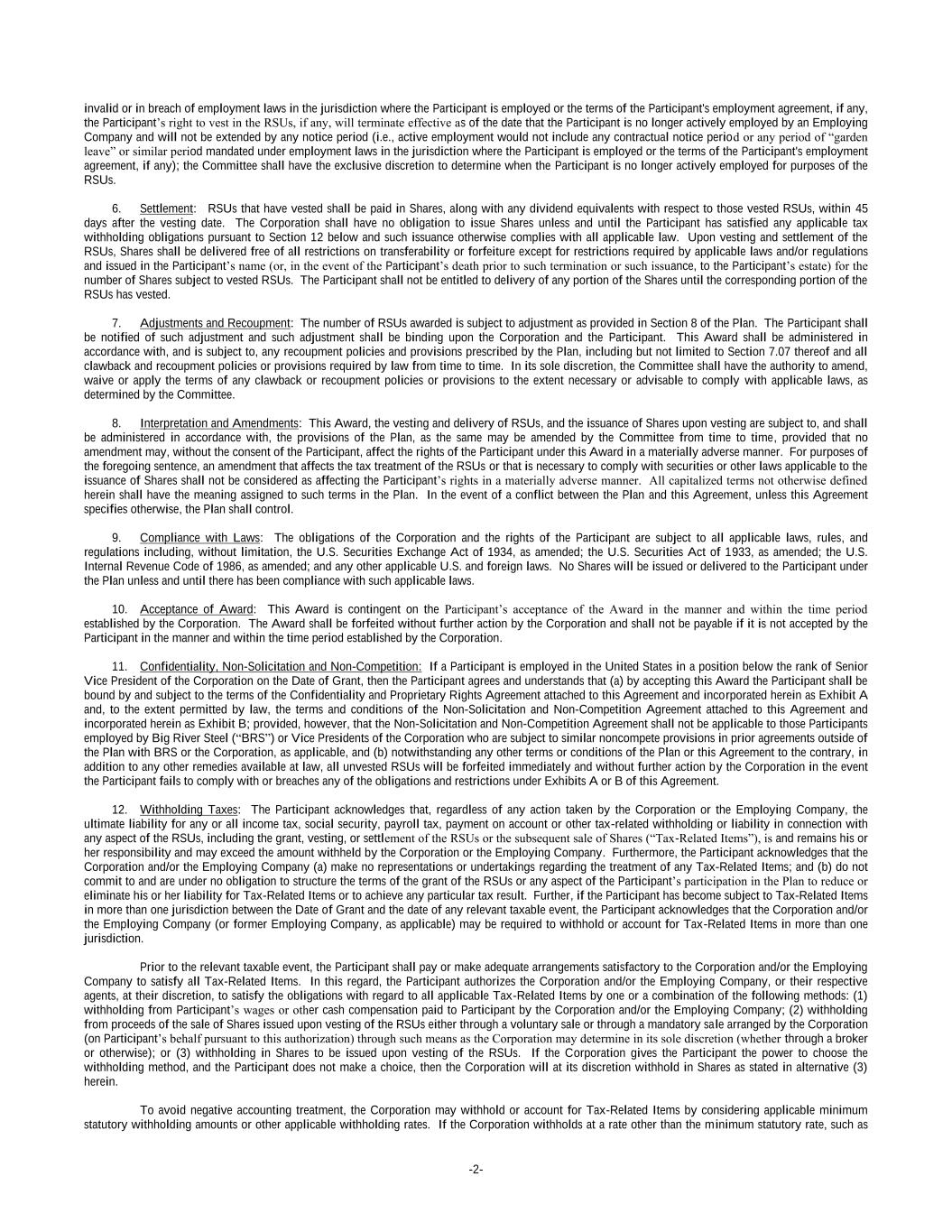 -2- invalid or in breach of employment laws in the jurisdiction where the Participant is employed or the terms of the Participant's employment agreement, if any, the Participant’s right to vest in the RSUs, if any, will terminate effective as of the date that the Participant is no longer actively employed by an Employing Company and will not be extended by any notice period (i.e., active employment would not include any contractual notice period or any period of “garden leave” or similar period mandated under employment laws in the jurisdiction where the Participant is employed or the terms of the Participant's employment agreement, if any); the Committee shall have the exclusive discretion to determine when the Participant is no longer actively employed for purposes of the RSUs. 6. Settlement: RSUs that have vested shall be paid in Shares, along with any dividend equivalents with respect to those vested RSUs, within 45 days after the vesting date. The Corporation shall have no obligation to issue Shares unless and until the Participant has satisfied any applicable tax withholding obligations pursuant to Section 12 below and such issuance otherwise complies with all applicable law. Upon vesting and settlement of the RSUs, Shares shall be delivered free of all restrictions on transferability or forfeiture except for restrictions required by applicable laws and/or regulations and issued in the Participant’s name (or, in the event of the Participant’s death prior to such termination or such issuance, to the Participant’s estate) for the number of Shares subject to vested RSUs. The Participant shall not be entitled to delivery of any portion of the Shares until the corresponding portion of the RSUs has vested. 7. Adjustments and Recoupment: The number of RSUs awarded is subject to adjustment as provided in Section 8 of the Plan. The Participant shall be notified of such adjustment and such adjustment shall be binding upon the Corporation and the Participant. This Award shall be administered in accordance with, and is subject to, any recoupment policies and provisions prescribed by the Plan, including but not limited to Section 7.07 thereof and all clawback and recoupment policies or provisions required by law from time to time. In its sole discretion, the Committee shall have the authority to amend, waive or apply the terms of any clawback or recoupment policies or provisions to the extent necessary or advisable to comply with applicable laws, as determined by the Committee. 8. Interpretation and Amendments: This Award, the vesting and delivery of RSUs, and the issuance of Shares upon vesting are subject to, and shall be administered in accordance with, the provisions of the Plan, as the same may be amended by the Committee from time to time, provided that no amendment may, without the consent of the Participant, affect the rights of the Participant under this Award in a materially adverse manner. For purposes of the foregoing sentence, an amendment that affects the tax treatment of the RSUs or that is necessary to comply with securities or other laws applicable to the issuance of Shares shall not be considered as affecting the Participant’s rights in a materially adverse manner. All capitalized terms not otherwise defined herein shall have the meaning assigned to such terms in the Plan. In the event of a conflict between the Plan and this Agreement, unless this Agreement specifies otherwise, the Plan shall control. 9. Compliance with Laws: The obligations of the Corporation and the rights of the Participant are subject to all applicable laws, rules, and regulations including, without limitation, the U.S. Securities Exchange Act of 1934, as amended; the U.S. Securities Act of 1933, as amended; the U.S. Internal Revenue Code of 1986, as amended; and any other applicable U.S. and foreign laws. No Shares will be issued or delivered to the Participant under the Plan unless and until there has been compliance with such applicable laws. 10. Acceptance of Award: This Award is contingent on the Participant’s acceptance of the Award in the manner and within the time period established by the Corporation. The Award shall be forfeited without further action by the Corporation and shall not be payable if it is not accepted by the Participant in the manner and within the time period established by the Corporation. 11. Confidentiality, Non-Solicitation and Non-Competition: If a Participant is employed in the United States in a position below the rank of Senior Vice President of the Corporation on the Date of Grant, then the Participant agrees and understands that (a) by accepting this Award the Participant shall be bound by and subject to the terms of the Confidentiality and Proprietary Rights Agreement attached to this Agreement and incorporated herein as Exhibit A and, to the extent permitted by law, the terms and conditions of the Non-Solicitation and Non-Competition Agreement attached to this Agreement and incorporated herein as Exhibit B; provided, however, that the Non-Solicitation and Non-Competition Agreement shall not be applicable to those Participants employed by Big River Steel (“BRS”) or Vice Presidents of the Corporation who are subject to similar noncompete provisions in prior agreements outside of the Plan with BRS or the Corporation, as applicable, and (b) notwithstanding any other terms or conditions of the Plan or this Agreement to the contrary, in addition to any other remedies available at law, all unvested RSUs will be forfeited immediately and without further action by the Corporation in the event the Participant fails to comply with or breaches any of the obligations and restrictions under Exhibits A or B of this Agreement. 12. Withholding Taxes: The Participant acknowledges that, regardless of any action taken by the Corporation or the Employing Company, the ultimate liability for any or all income tax, social security, payroll tax, payment on account or other 