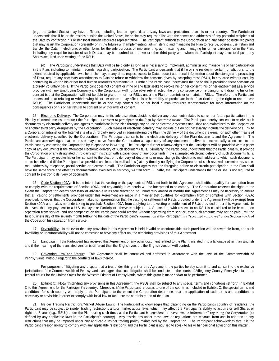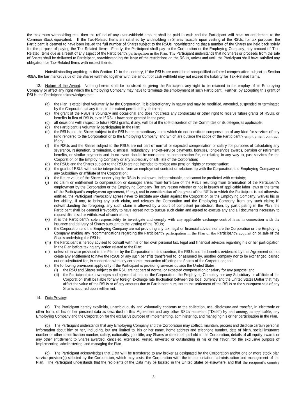 -3- the maximum withholding rate, then the refund of any over-withheld amount shall be paid in cash and the Participant will have no entitlement to the Common Stock equivalent. If the Tax-Related Items are satisfied by withholding in Shares issuable upon vesting of the RSUs, for tax purposes, the Participant is deemed to have been issued the full number of Shares subject to the RSUs, notwithstanding that a number of the Shares are held back solely for the purpose of paying the Tax-Related Items. Finally, the Participant shall pay to the Corporation or the Employing Company, any amount of Tax- Related Items due as a result of any aspect of the Participant’s participation in the Plan. The Participant understands that no Shares or proceeds from the sale of Shares shall be delivered to Participant, notwithstanding the lapse of the restrictions on the RSUs, unless and until the Participant shall have satisfied any obligation for Tax-Related Items with respect thereto. Notwithstanding anything in this Section 12 to the contrary, if the RSUs are considered nonqualified deferred compensation subject to Section 409A, the fair market value of the Shares withheld together with the amount of cash withheld may not exceed the liability for Tax-Related Items. 13. Nature of the Award: Nothing herein shall be construed as giving the Participant any right to be retained in the employ of an Employing Company or affect any right which the Employing Company may have to terminate the employment of such Participant. Further, by accepting this grant of RSUs, the Participant acknowledges that: (a) the Plan is established voluntarily by the Corporation, it is discretionary in nature and may be modified, amended, suspended or terminated by the Corporation at any time, to the extent permitted by its terms; (b) the grant of the RSUs is voluntary and occasional and does not create any contractual or other right to receive future grants of RSUs, or benefits in lieu of RSUs, even if RSUs have been granted in the past; (c) all decisions with respect to future RSU grants, if any, will be at the sole discretion of the Committee or its delegee, as applicable; (d) the Participant is voluntarily participating in the Plan; (e) the RSUs and the Shares subject to the RSUs are extraordinary items which do not constitute compensation of any kind for services of any kind rendered to the Corporation or to the Employing Company, and which are outside the scope of the Participant’s employment contract, if any; (f) the RSUs and the Shares subject to the RSUs are not part of normal or expected compensation or salary for purposes of calculating any severance, resignation, termination, dismissal, redundancy, end-of-service payments, bonuses, long-service awards, pension or retirement benefits, or similar payments and in no event should be considered as compensation for, or relating in any way to, past services for the Corporation or the Employing Company or any Subsidiary or affiliate of the Corporation; (g) the RSUs and the Shares subject to the RSUs are not intended to replace any pension rights or compensation; (h) the grant of RSUs will not be interpreted to form an employment contract or relationship with the Corporation, the Employing Company or any Subsidiary or affiliate of the Corporation; (i) the future value of the Shares underlying the RSUs is unknown, indeterminable, and cannot be predicted with certainty; (j) no claim or entitlement to compensation or damages arises from forfeiture of the RSUs resulting from termination of the Participant’s employment by the Corporation or the Employing Company (for any reason whether or not in breach of applicable labor laws or the terms of the Participant’s employment agreement, if any), and in consideration of the grant of the RSUs to which the Participant is not otherwise entitled, the Participant irrevocably agrees never to institute any claim against the Corporation or the Employing Company, waives his or her ability, if any, to bring any such claim, and releases the Corporation and the Employing Company from any such claim; if, notwithstanding the foregoing, any such claim is allowed by a court of competent jurisdiction, then, by participating in the Plan, the Participant shall be deemed irrevocably to have agreed not to pursue such claim and agreed to execute any and all documents necessary to request dismissal or withdrawal of such claim; (k) it is the Participant’s sole responsibility to investigate and comply with any applicable exchange control laws in connection with the issuance and delivery of Shares pursuant to the vesting of the RSUs; (l) the Corporation and the Employing Company are not providing any tax, legal or financial advice, nor are the Corporation or the Employing Company making any recommendations regarding the Participant’s participation in the Plan or the Participant’s acquisition or sale of the Shares underlying the RSUs; (m) the Participant is hereby advised to consult with his or her own personal tax, legal and financial advisors regarding his or her participation in the Plan before taking any action related to the Plan; (n) unless otherwise provided in the Plan or by the Corporation in its discretion, the RSUs and the benefits evidenced by this Agreement do not create any entitlement to have the RSUs or any such benefits transferred to, or assumed by, another company nor to be exchanged, cashed out or substituted for, in connection with any corporate transaction affecting the Shares of the Corporation; and (o) the following provisions apply only if the Participant is providing services outside the United States: (i) the RSU and Shares subject to the RSU are not part of normal or expected compensation or salary for any purpose; and (ii) the Participant acknowledges and agrees that neither the Corporation, the Employing Company nor any Subsidiary or affiliate of the Corporation shall be liable for any foreign exchange rate fluctuation between the