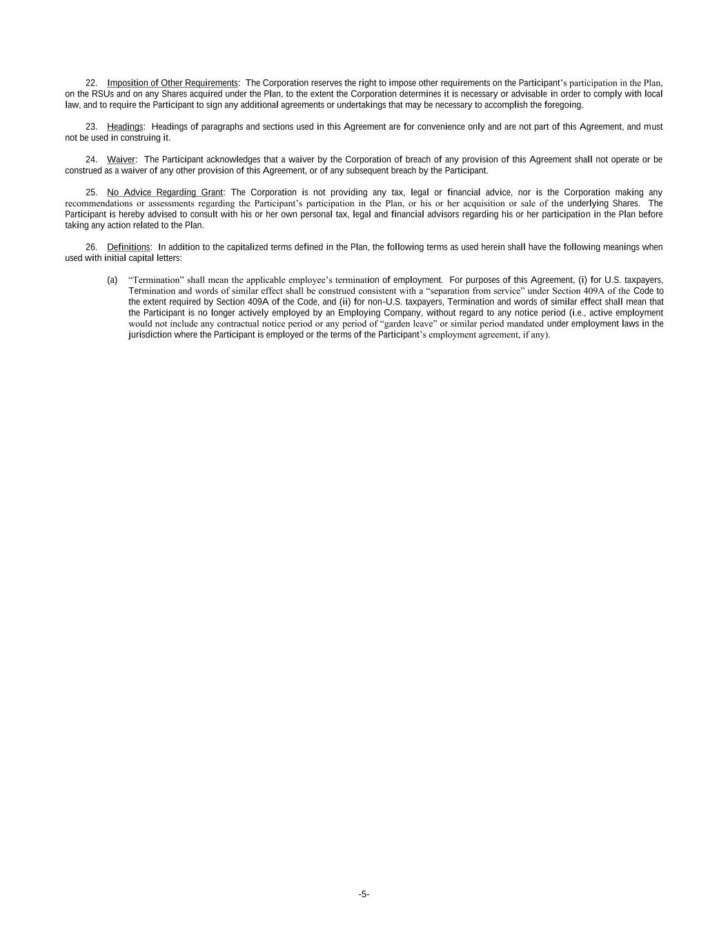-5- 22. Imposition of Other Requirements: The Corporation reserves the right to impose other requirements on the Participant’s participation in the Plan, on the RSUs and on any Shares acquired under the Plan, to the extent the Corporation determines it is necessary or advisable in order to comply with local law, and to require the Participant to sign any additional agreements or undertakings that may be necessary to accomplish the foregoing. 23. Headings: Headings of paragraphs and sections used in this Agreement are for convenience only and are not part of this Agreement, and must not be used in construing it. 24. Waiver: The Participant acknowledges that a waiver by the Corporation of breach of any provision of this Agreement shall not operate or be construed as a waiver of any other provision of this Agreement, or of any subsequent breach by the Participant. 25. No Advice Regarding Grant: The Corporation is not providing any tax, legal or financial advice, nor is the Corporation making any recommendations or assessments regarding the Participant’s participation in the Plan, or his or her acquisition or sale of the underlying Shares. The Participant is hereby advised to consult with his or her own personal tax, legal and financial advisors regarding his or her participation in the Plan before taking any action related to the Plan. 26. Definitions: In addition to the capitalized terms defined in the Plan, the following terms as used herein shall have the following meanings when used with initial capital letters: (a) “Termination” shall mean the applicable employee’s termination of employment. For purposes of this Agreement, (i) for U.S. taxpayers, Termination and words of similar effect shall be construed consistent with a “separation from service” under Section 409A of the Code to the extent required by Section 409A of the Code, and (ii) for non-U.S. taxpayers, Termination and words of similar effect shall mean that the Participant is no longer actively employed by an Employing Company, without regard to any notice period (i.e., active employment would not include any contractual notice period or any period of “garden leave” or similar period mandated under employment laws in the jurisdiction where the Participant is employed or the terms of the Participant’s employment agreement, if any).