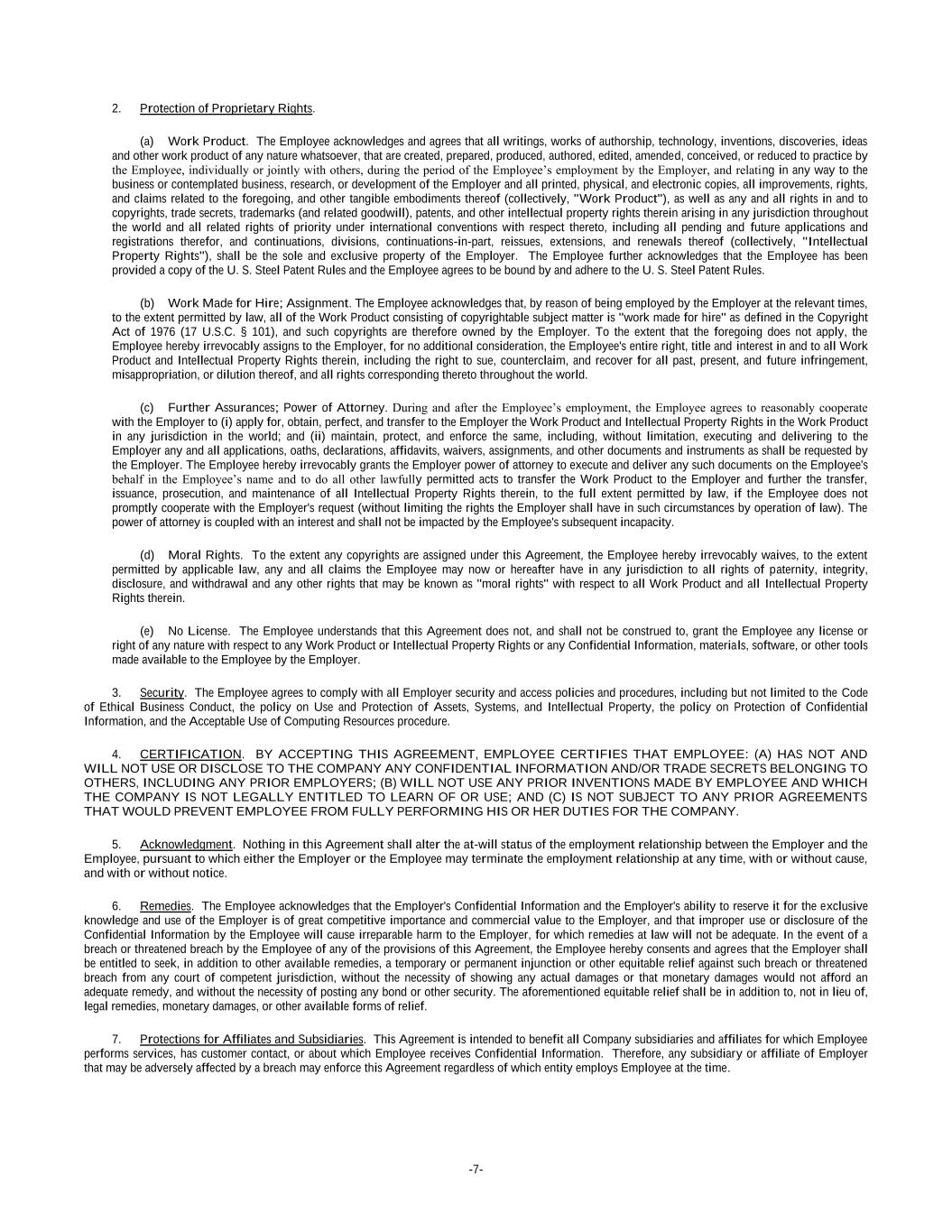 -7- 2. Protection of Proprietary Rights. (a) Work Product. The Employee acknowledges and agrees that all writings, works of authorship, technology, inventions, discoveries, ideas and other work product of any nature whatsoever, that are created, prepared, produced, authored, edited, amended, conceived, or reduced to practice by the Employee, individually or jointly with others, during the period of the Employee’s employment by the Employer, and relating in any way to the business or contemplated business, research, or development of the Employer and all printed, physical, and electronic copies, all improvements, rights, and claims related to the foregoing, and other tangible embodiments thereof (collectively, "Work Product"), as well as any and all rights in and to copyrights, trade secrets, trademarks (and related goodwill), patents, and other intellectual property rights therein arising in any jurisdiction throughout the world and all related rights of priority under international conventions with respect thereto, including all pending and future applications and registrations therefor, and continuations, divisions, continuations-in-part, reissues, extensions, and renewals thereof (collectively, "Intellectual Property Rights"), shall be the sole and exclusive property of the Employer. The Employee further acknowledges that the Employee has been provided a copy of the U. S. Steel Patent Rules and the Employee agrees to be bound by and adhere to the U. S. Steel Patent Rules. (b) Work Made for Hire; Assignment. The Employee acknowledges that, by reason of being employed by the Employer at the relevant times, to the extent permitted by law, all of the Work Product consisting of copyrightable subject matter is "work made for hire" as defined in the Copyright Act of 1976 (17 U.S.C. § 101), and such copyrights are therefore owned by the Employer. To the extent that the foregoing does not apply, the Employee hereby irrevocably assigns to the Employer, for no additional consideration, the Employee's entire right, title and interest in and to all Work Product and Intellectual Property Rights therein, including the right to sue, counterclaim, and recover for all past, present, and future infringement, misappropriation, or dilution thereof, and all rights corresponding thereto throughout the world. (c) Further Assurances; Power of Attorney. During and after the Employee’s employment, the Employee agrees to reasonably cooperate with the Employer to (i) apply for, obtain, perfect, and transfer to the Employer the Work Product and Intellectual Property Rights in the Work Product in any jurisdiction in the world; and (ii) maintain, protect, and enforce the same, including, without limitation, executing and delivering to the Employer any and all applications, oaths, declarations, affidavits, waivers, assignments, and other documents and instruments as shall be requested by the Employer. The Employee hereby irrevocably grants the Employer power of attorney to execute and deliver any such documents on the Employee's behalf in the Employee’s name and to do all other lawfully permitted acts to transfer the Work Product to the Employer and further the transfer, issuance, prosecution, and maintenance of all Intellectual Property Rights therein, to the full extent permitted by law, if the Employee does not promptly cooperate with the Employer's request (without limiting the rights the Employer shall have in such circumstances by operation of law). The power of attorney is coupled with an interest and shall not be impacted by the Employee's subsequent incapacity. (d) Moral Rights. To the extent any copyrights are assigned under this Agreement, the Employee hereby irrevocably waives, to the extent permitted by applicable law, any and all claims the Employee may now or hereafter have in any jurisdiction to all rights of paternity, integrity, disclosure, and withdrawal and any other rights that may be known as "moral rights" with respect to all Work Product and all Intellectual Property Rights therein. (e) No License. The Employee understands that this Agreement does not, and shall not be construed to, grant the Employee any license or right of any nature with respect to any Work Product or Intellectual Property Rights or any Confidential Information, materials, software, or other tools made available to the Employee by the Employer. 3. Security. The Employee agrees to comply with all Employer security and access policies and procedures, including but not limited to the Code of Ethical Business Conduct, the policy on Use and Protection of Assets, Systems, and Intellectual Property, the policy on Protection of Confidential Information, and the Acceptable Use of Computing Resources procedure. 4. CERTIFICATION. BY ACCEPTING THIS AGREEMENT, EMPLOYEE CERTIFIES THAT EMPLOYEE: (A) HAS NOT AND WILL NOT USE OR DISCLOSE TO THE COMPANY ANY CONFIDENTIAL INFORMATION AND/OR TRADE SECRETS BELONGING TO OTHERS, INCLUDING ANY PRIOR EMPLOYERS; (B) WILL NOT USE ANY PRIOR INVENTIONS MADE BY EMPLOYEE AND WHICH THE COMPANY IS NOT LEGALLY ENTITLED TO LEARN OF OR USE; AND (C) IS NOT SUBJECT TO ANY PRIOR AGREEMENTS THAT WOULD PREVENT EMPLOYEE FROM FULLY PERFORMING HIS OR HER DUTIES FOR THE COMPANY. 5. Acknowledgment. Nothing in this Agreement shall alter the at-will status of the employment relationship between the Employer and the Employee, pursuant to which either the Employer or the Employee may terminate the employment relationship at any time, with or without cause, and with or without notice. 6. Remedies. The Employee acknowledges that the Employer's Confidential Information and the Employer's ability to reserve it for the exclusive knowledge and use of the Employer is of great competitive importance and commercial value to the Employer, and that improper use or disclosure of the Confidential Information by the Employee will cause irreparable harm to the Employer, for which remedies at law will not be adequate. In the event o