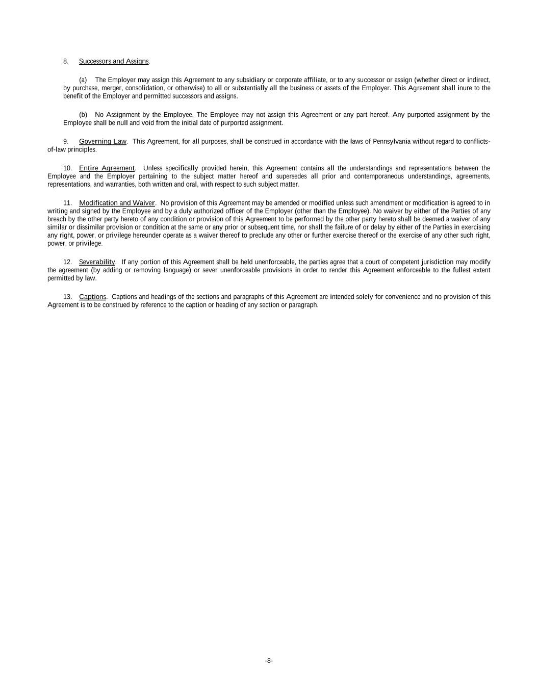 -8- 8. Successors and Assigns. (a) The Employer may assign this Agreement to any subsidiary or corporate affiliate, or to any successor or assign (whether direct or indirect, by purchase, merger, consolidation, or otherwise) to all or substantially all the business or assets of the Employer. This Agreement shall inure to the benefit of the Employer and permitted successors and assigns. (b) No Assignment by the Employee. The Employee may not assign this Agreement or any part hereof. Any purported assignment by the Employee shall be null and void from the initial date of purported assignment. 9. Governing Law. This Agreement, for all purposes, shall be construed in accordance with the laws of Pennsylvania without regard to conflicts- of-law principles. 10. Entire Agreement. Unless specifically provided herein, this Agreement contains all the understandings and representations between the Employee and the Employer pertaining to the subject matter hereof and supersedes all prior and contemporaneous understandings, agreements, representations, and warranties, both written and oral, with respect to such subject matter. 11. Modification and Waiver. No provision of this Agreement may be amended or modified unless such amendment or modification is agreed to in writing and signed by the Employee and by a duly authorized officer of the Employer (other than the Employee). No waiver by either of the Parties of any breach by the other party hereto of any condition or provision of this Agreement to be performed by the other party hereto shall be deemed a waiver of any similar or dissimilar provision or condition at the same or any prior or subsequent time, nor shall the failure of or delay by either of the Parties in exercising any right, power, or privilege hereunder operate as a waiver thereof to preclude any other or further exercise thereof or the exercise of any other such right, power, or privilege. 12. Severability. If any portion of this Agreement shall be held unenforceable, the parties agree that a court of competent jurisdiction may modify the agreement (by adding or removing language) or sever unenforceable provisions in order to render this Agreement enforceable to the fullest extent permitted by law. 13. Captions. Captions and headings of the sections and paragraphs of this Agreement are intended solely for convenience and no provision of this Agreement is to be construed by reference to the caption or heading of any section or paragraph.