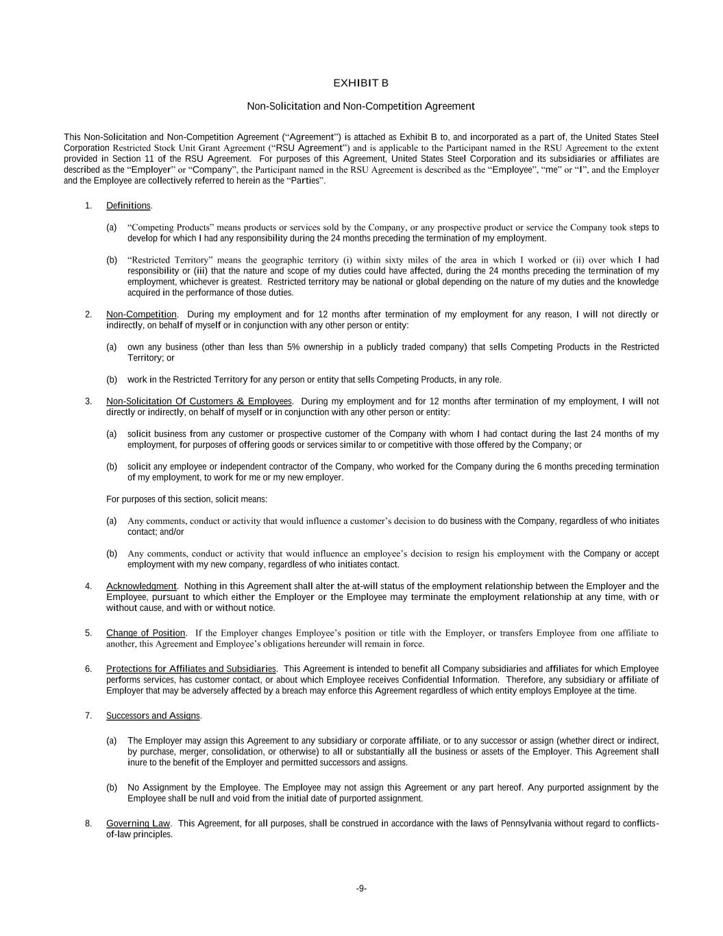 -9- EXHIBIT B Non-Solicitation and Non-Competition Agreement This Non-Solicitation and Non-Competition Agreement (“Agreement”) is attached as Exhibit B to, and incorporated as a part of, the United States Steel Corporation Restricted Stock Unit Grant Agreement (“RSU Agreement”) and is applicable to the Participant named in the RSU Agreement to the extent provided in Section 11 of the RSU Agreement. For purposes of this Agreement, United States Steel Corporation and its subsidiaries or affiliates are described as the “Employer” or “Company”, the Participant named in the RSU Agreement is described as the “Employee”, “me” or “I”, and the Employer and the Employee are collectively referred to herein as the “Parties”. 1. Definitions. (a) “Competing Products” means products or services sold by the Company, or any prospective product or service the Company took steps to develop for which I had any responsibility during the 24 months preceding the termination of my employment. (b) “Restricted Territory” means the geographic territory (i) within sixty miles of the area in which I worked or (ii) over which I had responsibility or (iii) that the nature and scope of my duties could have affected, during the 24 months preceding the termination of my employment, whichever is greatest. Restricted territory may be national or global depending on the nature of my duties and the knowledge acquired in the performance of those duties. 2. Non-Competition. During my employment and for 12 months after termination of my employment for any reason, I will not directly or indirectly, on behalf of myself or in conjunction with any other person or entity: (a) own any business (other than less than 5% ownership in a publicly traded company) that sells Competing Products in the Restricted Territory; or (b) work in the Restricted Territory for any person or entity that sells Competing Products, in any role. 3. Non-Solicitation Of Customers & Employees. During my employment and for 12 months after termination of my employment, I will not directly or indirectly, on behalf of myself or in conjunction with any other person or entity: (a) solicit business from any customer or prospective customer of the Company with whom I had contact during the last 24 months of my employment, for purposes of offering goods or services similar to or competitive with those offered by the Company; or (b) solicit any employee or independent contractor of the Company, who worked for the Company during the 6 months preceding termination of my employment, to work for me or my new employer. For purposes of this section, solicit means: (a) Any comments, conduct or activity that would influence a customer’s decision to do business with the Company, regardless of who initiates contact; and/or (b) Any comments, conduct or activity that would influence an employee’s decision to resign his employment with the Company or accept employment with my new company, regardless of who initiates contact. 4. Acknowledgment. Nothing in this Agreement shall alter the at-will status of the employment relationship between the Employer and the Employee, pursuant to which either the Employer or the Employee may terminate the employment relationship at any time, with or without cause, and with or without notice. 5. Change of Position. If the Employer changes Employee’s position or title with the Employer, or transfers Employee from one affiliate to another, this Agreement and Employee’s obligations hereunder will remain in force. 6. Protections for Affiliates and Subsidiaries. This Agreement is intended to benefit all Company subsidiaries and affiliates for which Employee performs services, has customer contact, or about which Employee receives Confidential Information. Therefore, any subsidiary or affiliate of Employer that may be adversely affected by a breach may enforce this Agreement regardless of which entity employs Employee at the time. 7. Successors and Assigns. (a) The Employer may assign this Agreement to any subsidiary or corporate affiliate, or to any successor or assign (whether direct or indirect, by purchase, merger, consolidation, or otherwise) to all or substantially all the business or assets of the Employer. This Agreement shall inure to the benefit of the Employer and permitted successors and assigns. (b) No Assignment by the Employee. The Employee may not assign this Agreement or any part hereof. Any purported assignment by the Employee shall be null and void from the initial date of purported assignment. 8. Governing Law. This Agreement, for all purposes, shall be construed in accordance with the laws of Pennsylvania without regard to conflicts- of-law principles.