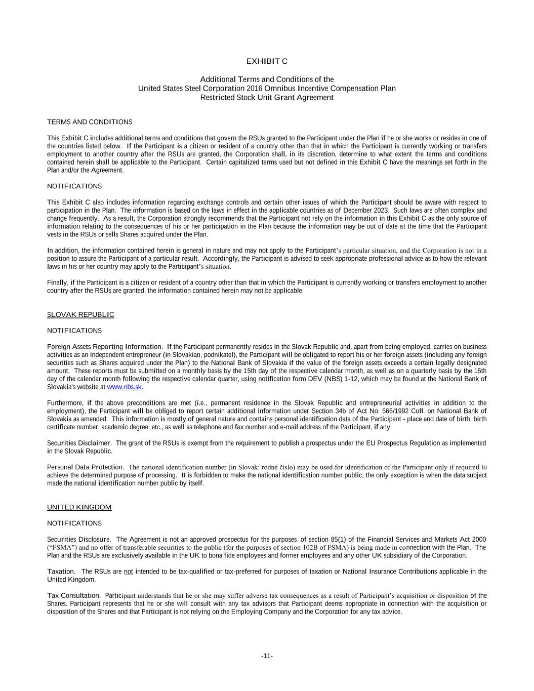 -11- EXHIBIT C Additional Terms and Conditions of the United States Steel Corporation 2016 Omnibus Incentive Compensation Plan Restricted Stock Unit Grant Agreement TERMS AND CONDITIONS This Exhibit C includes additional terms and conditions that govern the RSUs granted to the Participant under the Plan if he or she works or resides in one of the countries listed below. If the Participant is a citizen or resident of a country other than that in which the Participant is currently working or transfers employment to another country after the RSUs are granted, the Corporation shall, in its discretion, determine to what extent the terms and conditions contained herein shall be applicable to the Participant. Certain capitalized terms used but not defined in this Exhibit C have the meanings set forth in the Plan and/or the Agreement. NOTIFICATIONS This Exhibit C also includes information regarding exchange controls and certain other issues of which the Participant should be aware with respect to participation in the Plan. The information is based on the laws in effect in the applicable countries as of December 2023. Such laws are often complex and change frequently. As a result, the Corporation strongly recommends that the Participant not rely on the information in this Exhibit C as the only source of information relating to the consequences of his or her participation in the Plan because the information may be out of date at the time that the Participant vests in the RSUs or sells Shares acquired under the Plan. In addition, the information contained herein is general in nature and may not apply to the Participant’s particular situation, and the Corporation is not in a position to assure the Participant of a particular result. Accordingly, the Participant is advised to seek appropriate professional advice as to how the relevant laws in his or her country may apply to the Participant’s situation. Finally, if the Participant is a citizen or resident of a country other than that in which the Participant is currently working or transfers employment to another country after the RSUs are granted, the information contained herein may not be applicable. SLOVAK REPUBLIC NOTIFICATIONS Foreign Assets Reporting Information. If the Participant permanently resides in the Slovak Republic and, apart from being employed, carries on business activities as an independent entrepreneur (in Slovakian, podnikatel), the Participant will be obligated to report his or her foreign assets (including any foreign securities such as Shares acquired under the Plan) to the National Bank of Slovakia if the value of the foreign assets exceeds a certain legally designated amount. These reports must be submitted on a monthly basis by the 15th day of the respective calendar month, as well as on a quarterly basis by the 15th day of the calendar month following the respective calendar quarter, using notification form DEV (NBS) 1-12, which may be found at the National Bank of Slovakia's website at www.nbs.sk. Furthermore, if the above preconditions are met (i.e., permanent residence in the Slovak Republic and entrepreneurial activities in addition to the employment), the Participant will be obliged to report certain additional information under Section 34b of Act No. 566/1992 Coll. on National Bank of Slovakia as amended. This information is mostly of general nature and contains personal identification data of the Participant - place and date of birth, birth certificate number, academic degree, etc., as well as telephone and fax number and e-mail address of the Participant, if any. Securities Disclaimer. The grant of the RSUs is exempt from the requirement to publish a prospectus under the EU Prospectus Regulation as implemented in the Slovak Republic. Personal Data Protection. The national identification number (in Slovak: rodné číslo) may be used for identification of the Participant only if required to achieve the determined purpose of processing. It is forbidden to make the national identification number public; the only exception is when the data subject made the national identification number public by itself. UNITED KINGDOM NOTIFICATIONS Securities Disclosure. The Agreement is not an approved prospectus for the purposes of section 85(1) of the Financial Services and Markets Act 2000 (“FSMA”) and no offer of transferable securities to the public (for the purposes of section 102B of FSMA) is being made in connection with the Plan. The Plan and the RSUs are exclusively available in the UK to bona fide employees and former employees and any other UK subsidiary of the Corporation. Taxation. The RSUs are not intended to be tax-qualified or tax-preferred for purposes of taxation or National Insurance Contributions applicable in the United Kingdom. Tax Consultation. Participant understands that he or she may suffer adverse tax consequences as a result of Participant’s acquisition or disposition of the Shares. Participant represents that he or she will consult with any tax advisors that Participant deems appropriate in connection with the acquisition or disposition of the Shares and that Participant is not relying on the Employing Company and the Corporation for any tax advice.