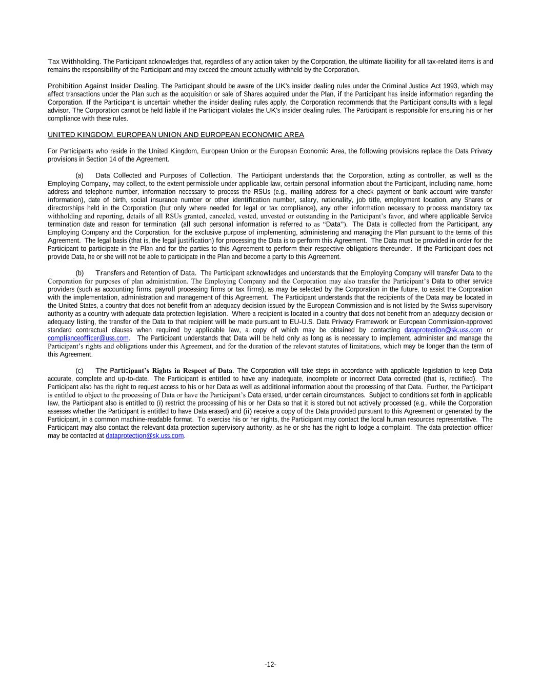 -12- Tax Withholding. The Participant acknowledges that, regardless of any action taken by the Corporation, the ultimate liability for all tax-related items is and remains the responsibility of the Participant and may exceed the amount actually withheld by the Corporation. Prohibition Against Insider Dealing. The Participant should be aware of the UK's insider dealing rules under the Criminal Justice Act 1993, which may affect transactions under the Plan such as the acquisition or sale of Shares acquired under the Plan, if the Participant has inside information regarding the Corporation. If the Participant is uncertain whether the insider dealing rules apply, the Corporation recommends that the Participant consults with a legal advisor. The Corporation cannot be held liable if the Participant violates the UK's insider dealing rules. The Participant is responsible for ensuring his or her compliance with these rules. UNITED KINGDOM, EUROPEAN UNION AND EUROPEAN ECONOMIC AREA For Participants who reside in the United Kingdom, European Union or the European Economic Area, the following provisions replace the Data Privacy provisions in Section 14 of the Agreement. (a) Data Collected and Purposes of Collection. The Participant understands that the Corporation, acting as controller, as well as the Employing Company, may collect, to the extent permissible under applicable law, certain personal information about the Participant, including name, home address and telephone number, information necessary to process the RSUs (e.g., mailing address for a check payment or bank account wire transfer information), date of birth, social insurance number or other identification number, salary, nationality, job title, employment location, any Shares or directorships held in the Corporation (but only where needed for legal or tax compliance), any other information necessary to process mandatory tax withholding and reporting, details of all RSUs granted, canceled, vested, unvested or outstanding in the Participant’s favor, and where applicable Service termination date and reason for termination (all such personal information is referred to as “Data”). The Data is collected from the Participant, any Employing Company and the Corporation, for the exclusive purpose of implementing, administering and managing the Plan pursuant to the terms of this Agreement. The legal basis (that is, the legal justification) for processing the Data is to perform this Agreement. The Data must be provided in order for the Participant to participate in the Plan and for the parties to this Agreement to perform their respective obligations thereunder. If the Participant does not provide Data, he or she will not be able to participate in the Plan and become a party to this Agreement. (b) Transfers and Retention of Data. The Participant acknowledges and understands that the Employing Company will transfer Data to the Corporation for purposes of plan administration. The Employing Company and the Corporation may also transfer the Participant’s Data to other service providers (such as accounting firms, payroll processing firms or tax firms), as may be selected by the Corporation in the future, to assist the Corporation with the implementation, administration and management of this Agreement. The Participant understands that the recipients of the Data may be located in the United States, a country that does not benefit from an adequacy decision issued by the European Commission and is not listed by the Swiss supervisory authority as a country with adequate data protection legislation. Where a recipient is located in a country that does not benefit from an adequacy decision or adequacy listing, the transfer of the Data to that recipient will be made pursuant to EU-U.S. Data Privacy Framework or European Commission-approved standard contractual clauses when required by applicable law, a copy of which may be obtained by contacting dataprotection@sk.uss.com or complianceofficer@uss.com. The Participant understands that Data will be held only as long as is necessary to implement, administer and manage the Participant’s rights and obligations under this Agreement, and for the duration of the relevant statutes of limitations, which may be longer than the term of this Agreement. (c) The Participant’s Rights in Respect of Data. The Corporation will take steps in accordance with applicable legislation to keep Data accurate, complete and up-to-date. The Participant is entitled to have any inadequate, incomplete or incorrect Data corrected (that is, rectified). The Participant also has the right to request access to his or her Data as well as additional information about the processing of that Data. Further, the Participant is entitled to object to the processing of Data or have the Participant’s Data erased, under certain circumstances. Subject to conditions set forth in applicable law, the Participant also is entitled to (i) restrict the processing of his or her Data so that it is stored but not actively processed (e.g., while the Corporation assesses whether the Participant is entitled to have Data erased) and (ii) receive a copy of the Data provided pursuant to this Agreement or generated by the Participant, in a common machine-readable format. To exercise his or her rights, the Participant may contact the local human resources representative. The Participant may also contact the relevant data protection supervisory authority, as he or she has the right to lodge a complaint. The data protection officer may be contacted at dataprotection@sk.uss.com.