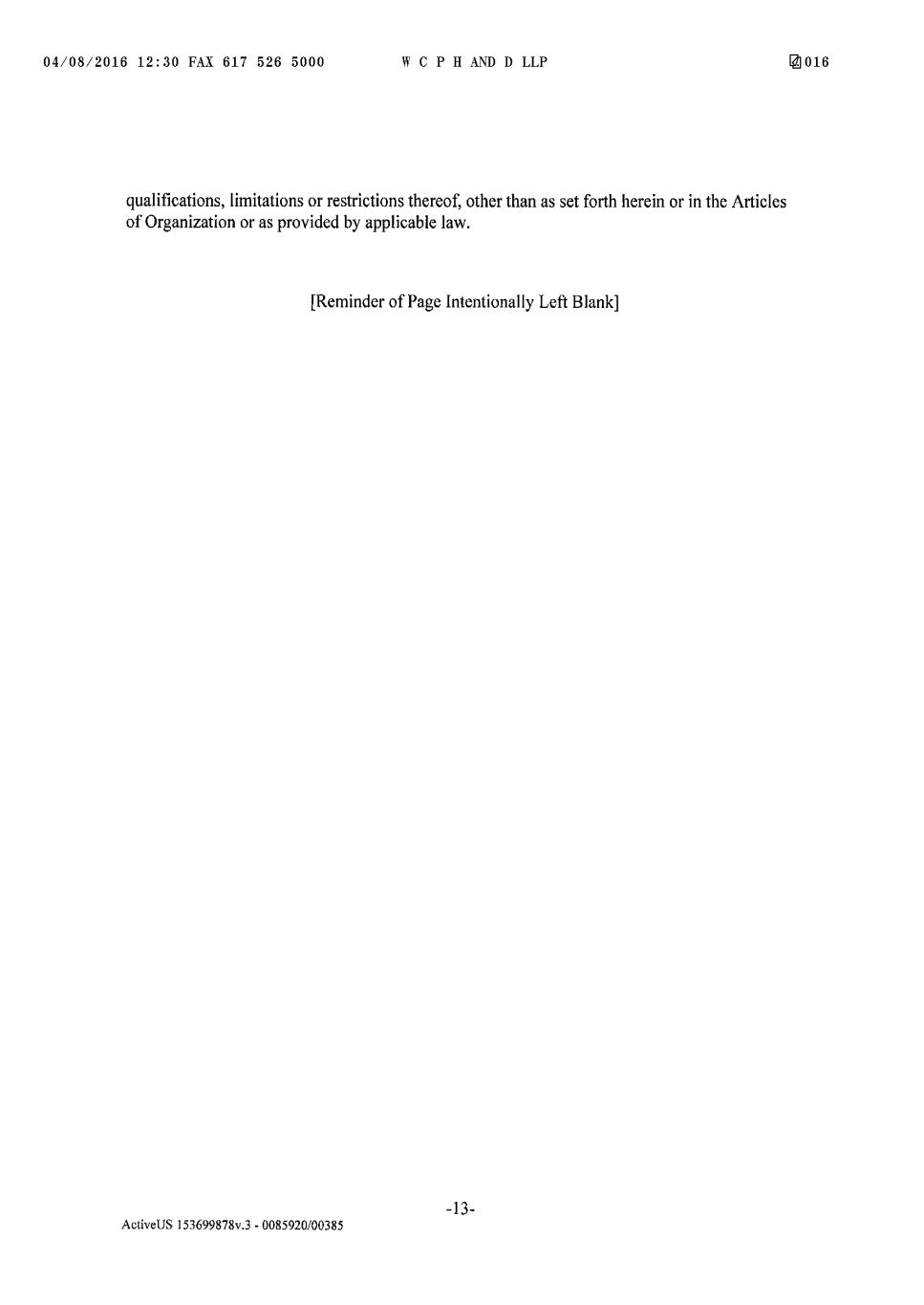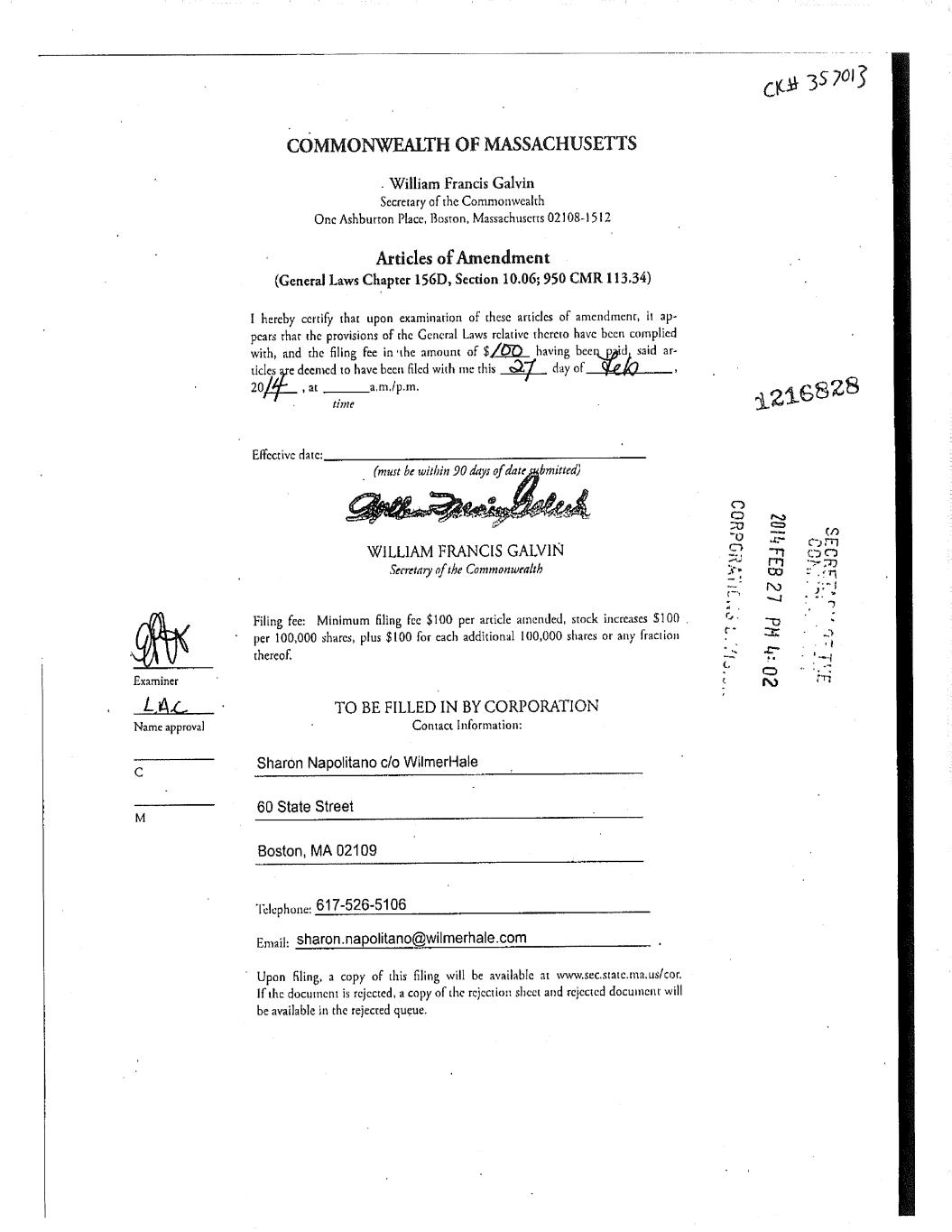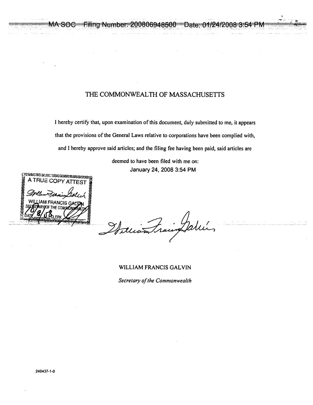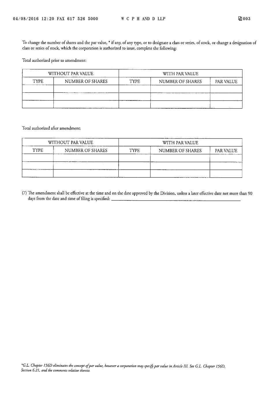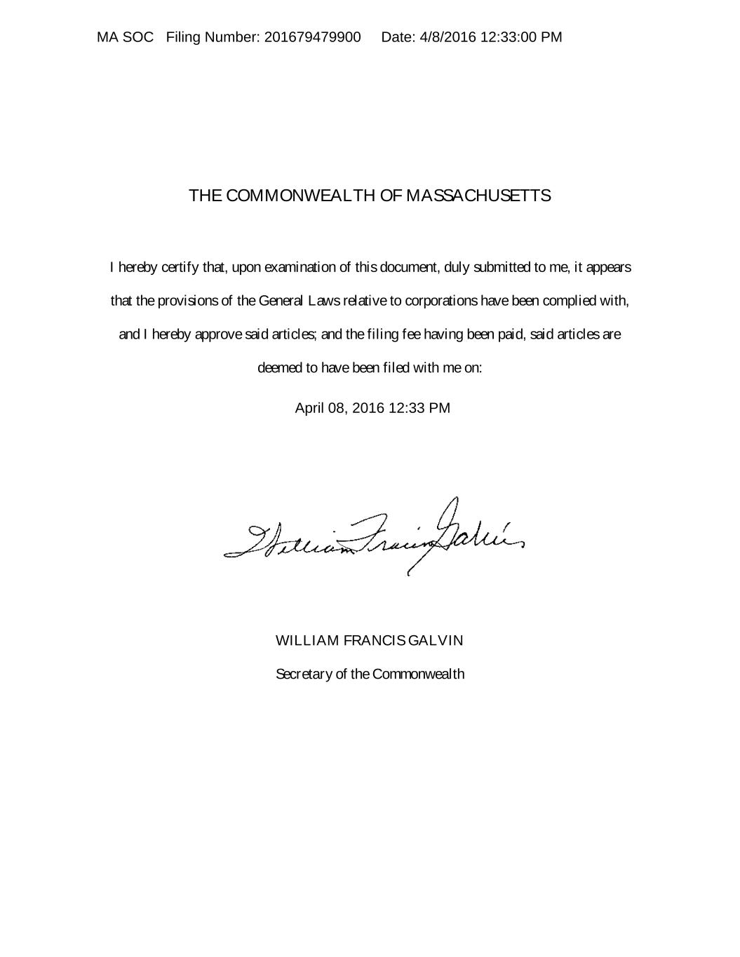 THE COMMONWEALTH OF MASSACHUSETTS I hereby certify that, upon examination of this document, duly submitted to me, it appears that the provisions of the General Laws relative to corporations have been complied with, and I hereby approve said articles; and the filing fee having been paid, said articles are deemed to have been filed with me on: WILLIAM FRANCIS GALVIN Secretary of the Commonwealth April 08, 2016 12:33 PM MA SOC Filing Number: 201679479900 Date: 4/8/2016 12:33:00 PM