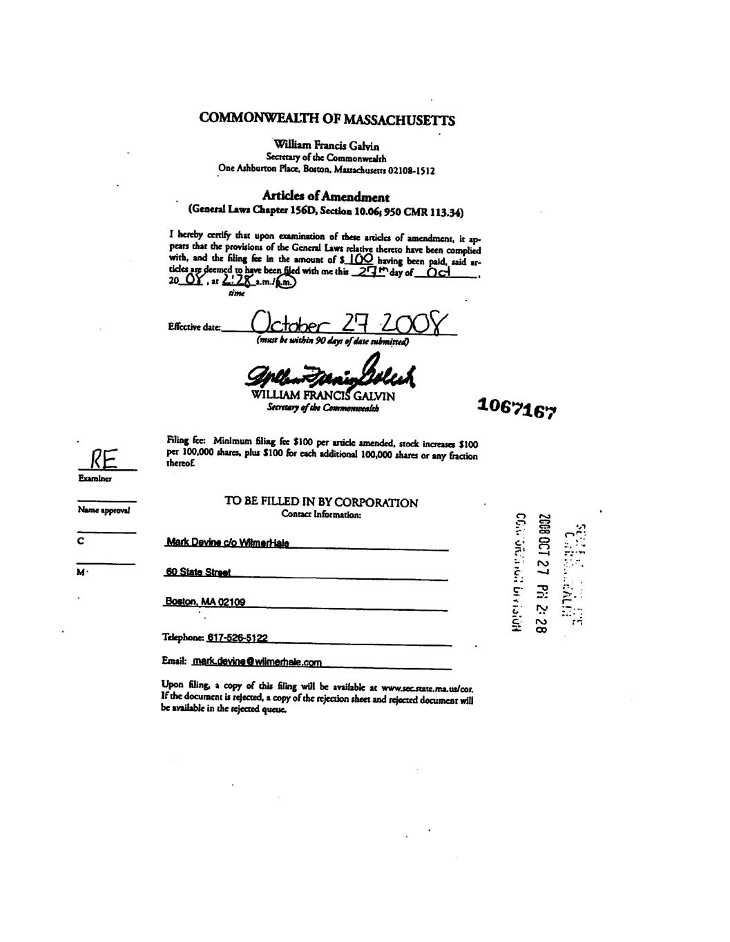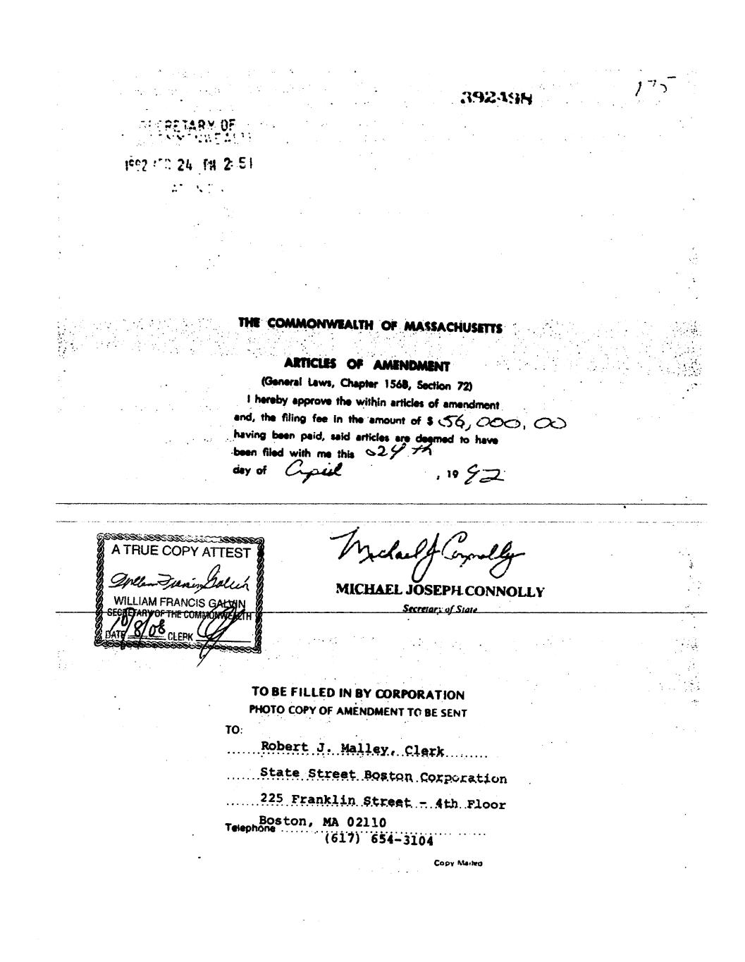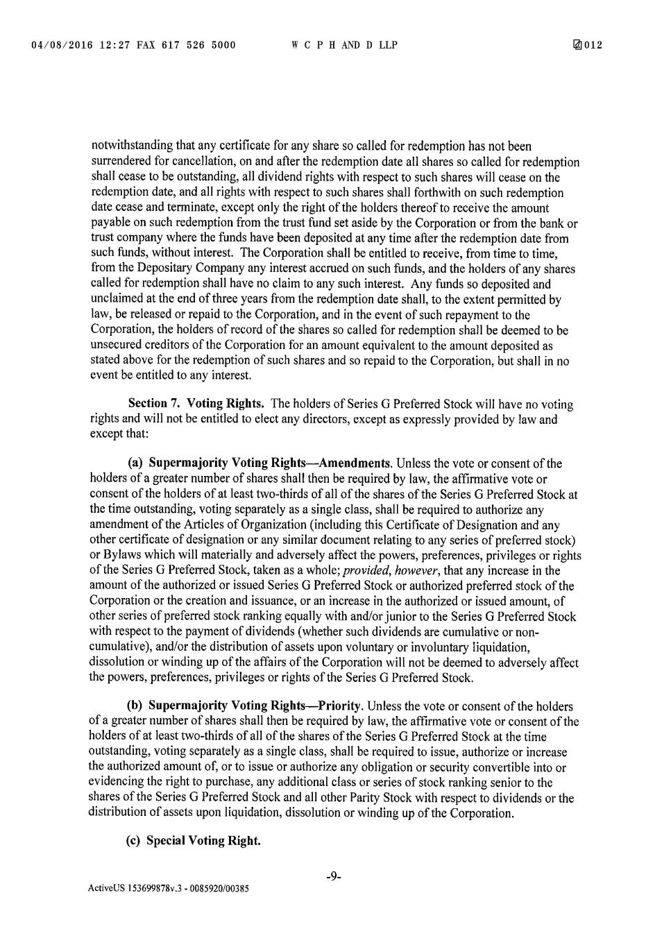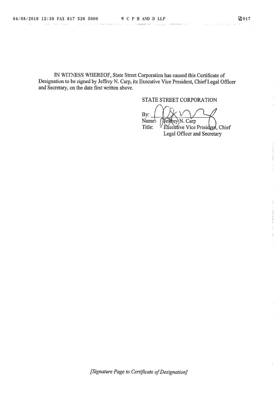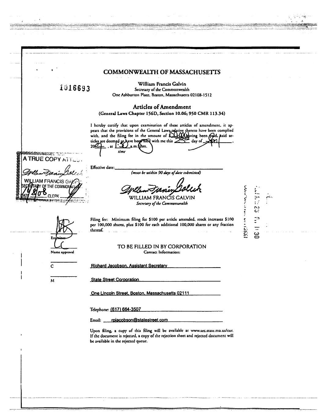 THE COMMONWEALTH OF MASSACHUSETTS I hereby certify that, upon examination of this document, duly submitted to me, it appears that the provisions of the General Laws relative to corporations have been complied with, and I hereby approve said articles; and the filing fee having been paid, said articles are deemed to have been filed with me on: WILLIAM FRANCIS GALVIN Secretary of the Commonwealth April 08, 2016 12:33 PM MA SOC Filing Number: 201679479900 Date: 4/8/2016 12:33:00 PM