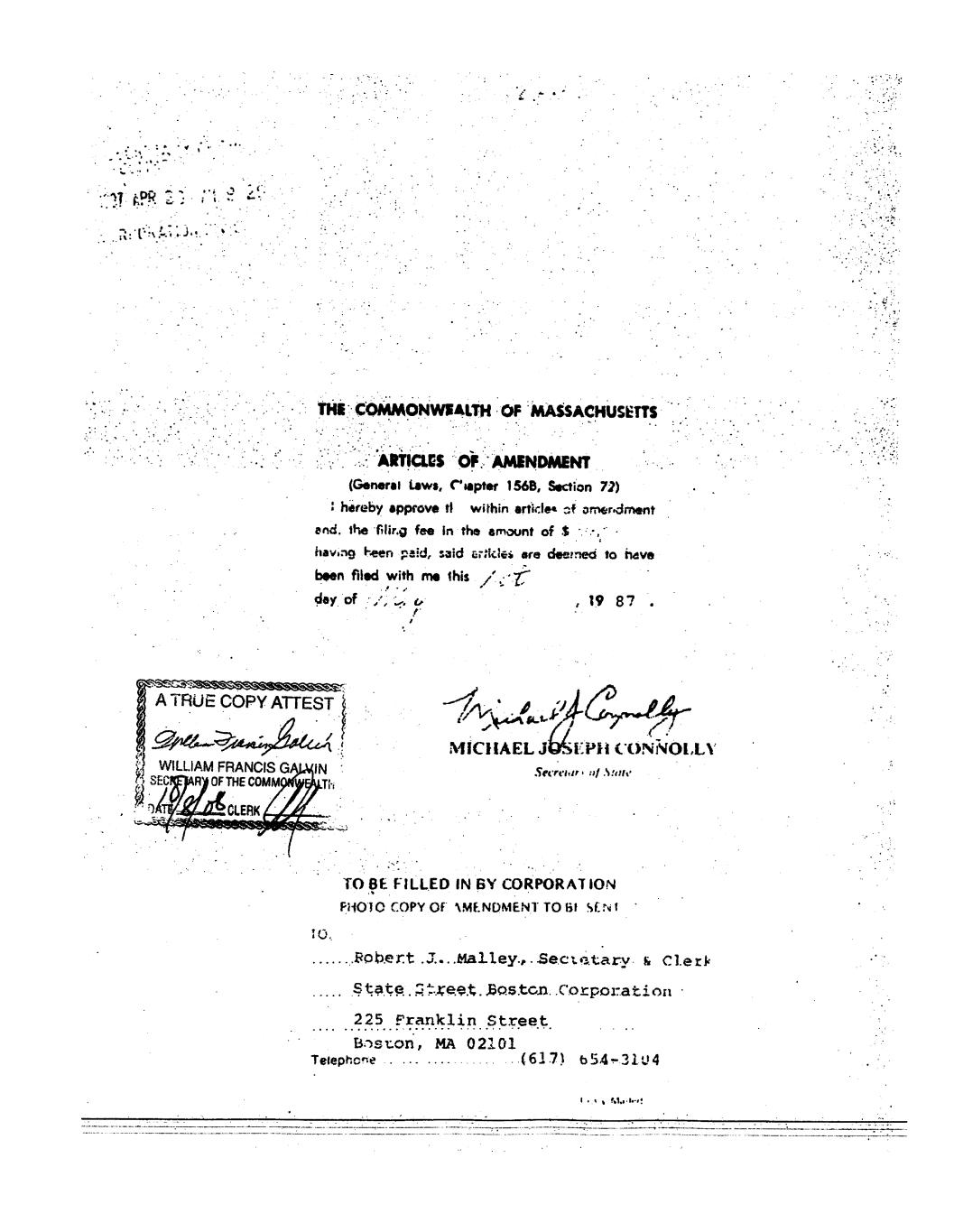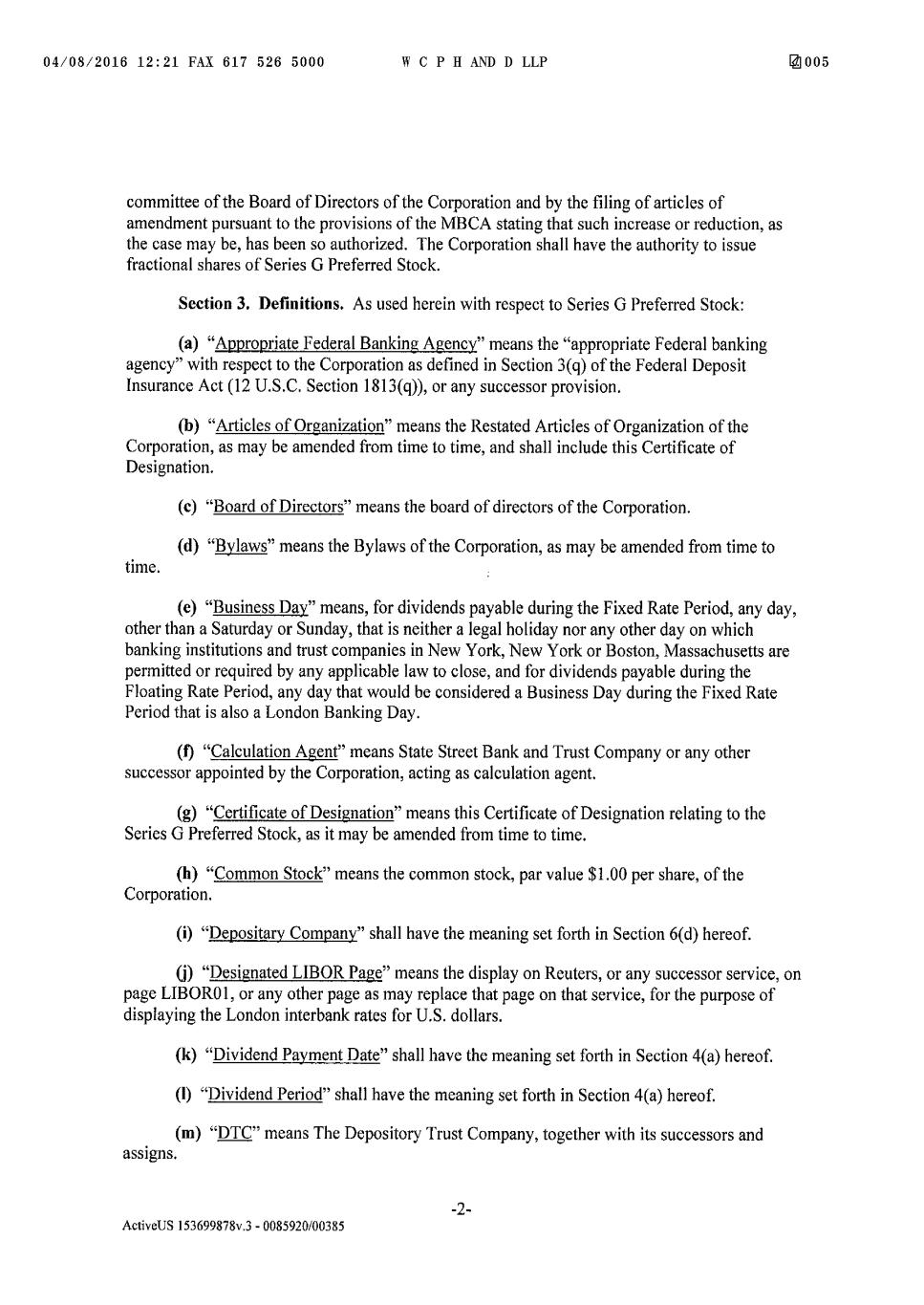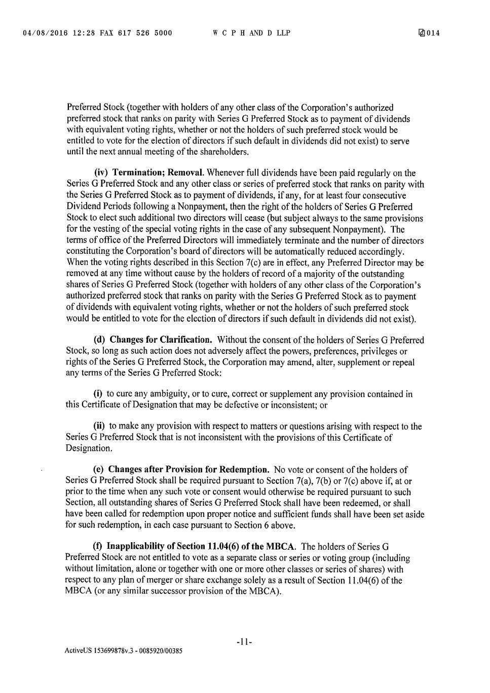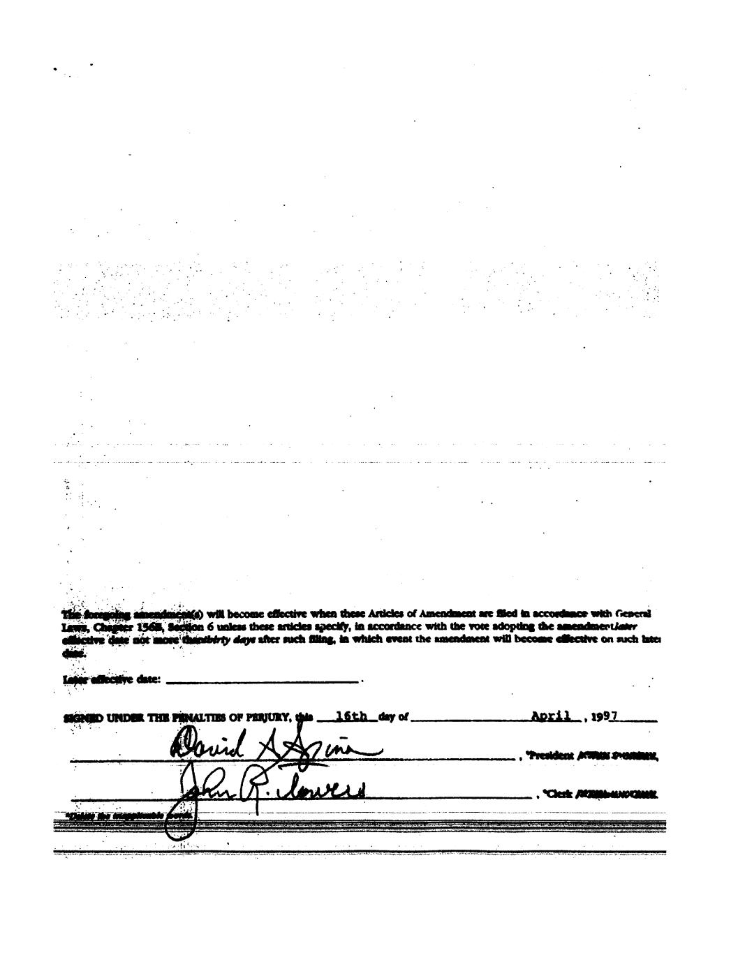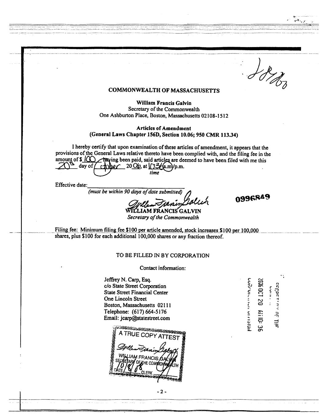 THE COMMONWEALTH OF MASSACHUSETTS I hereby certify that, upon examination of this document, duly submitted to me, it appears that the provisions of the General Laws relative to corporations have been complied with, and I hereby approve said articles; and the filing fee having been paid, said articles are deemed to have been filed with me on: WILLIAM FRANCIS GALVIN Secretary of the Commonwealth April 08, 2016 12:33 PM MA SOC Filing Number: 201679479900 Date: 4/8/2016 12:33:00 PM