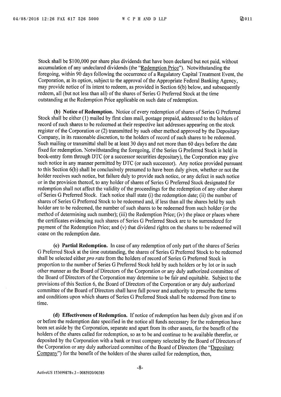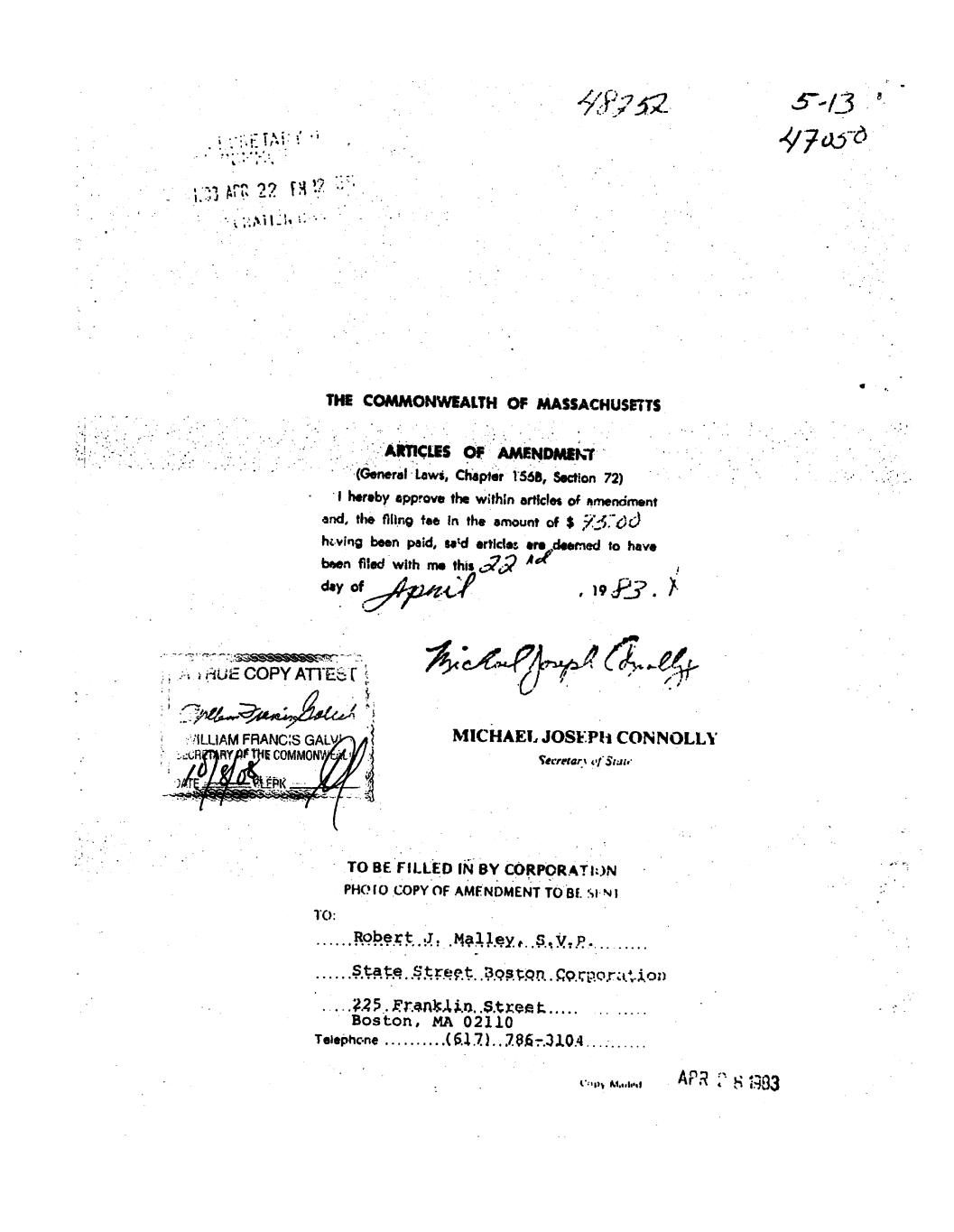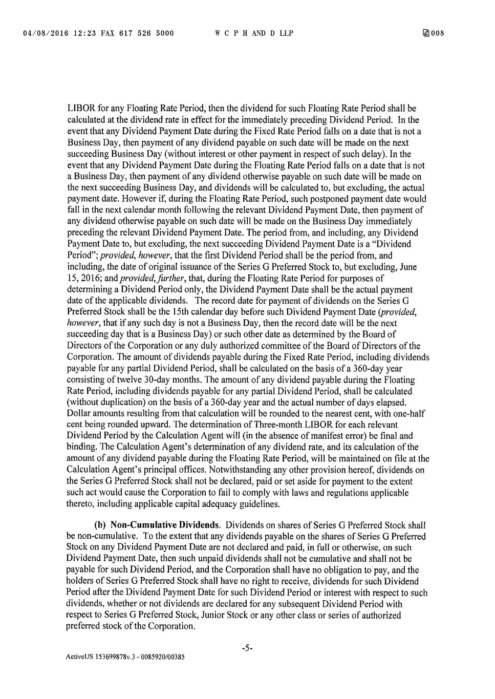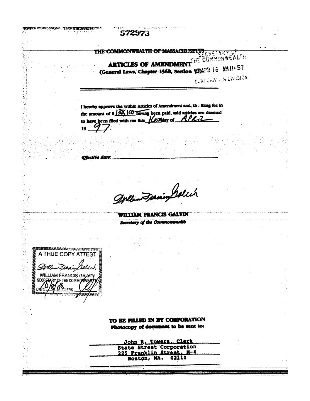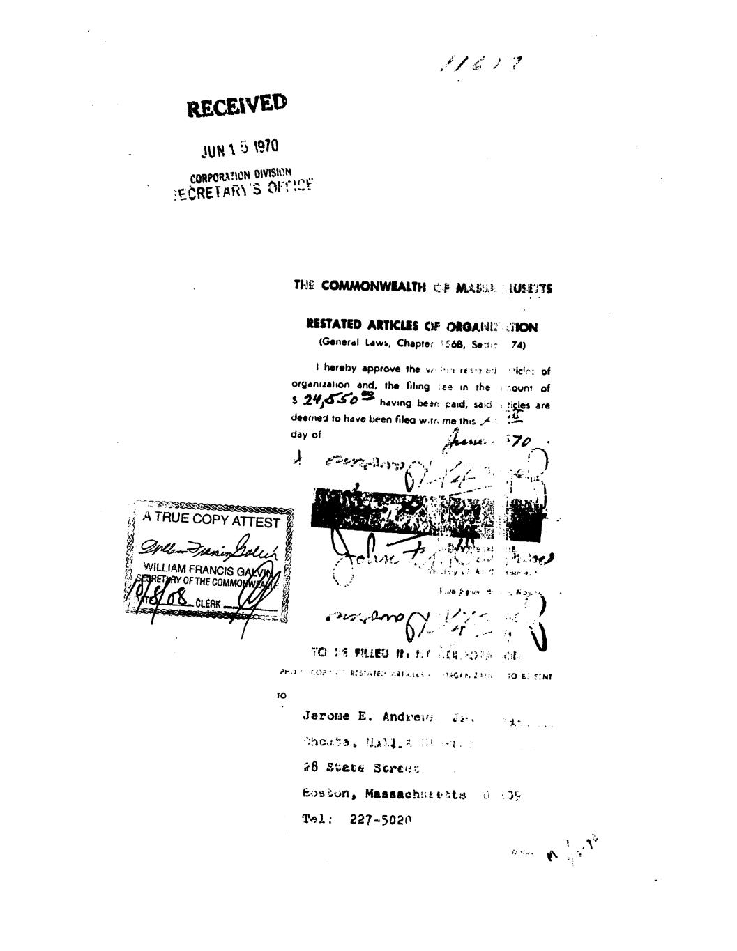 THE COMMONWEALTH OF MASSACHUSETTS I hereby certify that, upon examination of this document, duly submitted to me, it appears that the provisions of the General Laws relative to corporations have been complied with, and I hereby approve said articles; and the filing fee having been paid, said articles are deemed to have been filed with me on: WILLIAM FRANCIS GALVIN Secretary of the Commonwealth April 08, 2016 12:33 PM MA SOC Filing Number: 201679479900 Date: 4/8/2016 12:33:00 PM