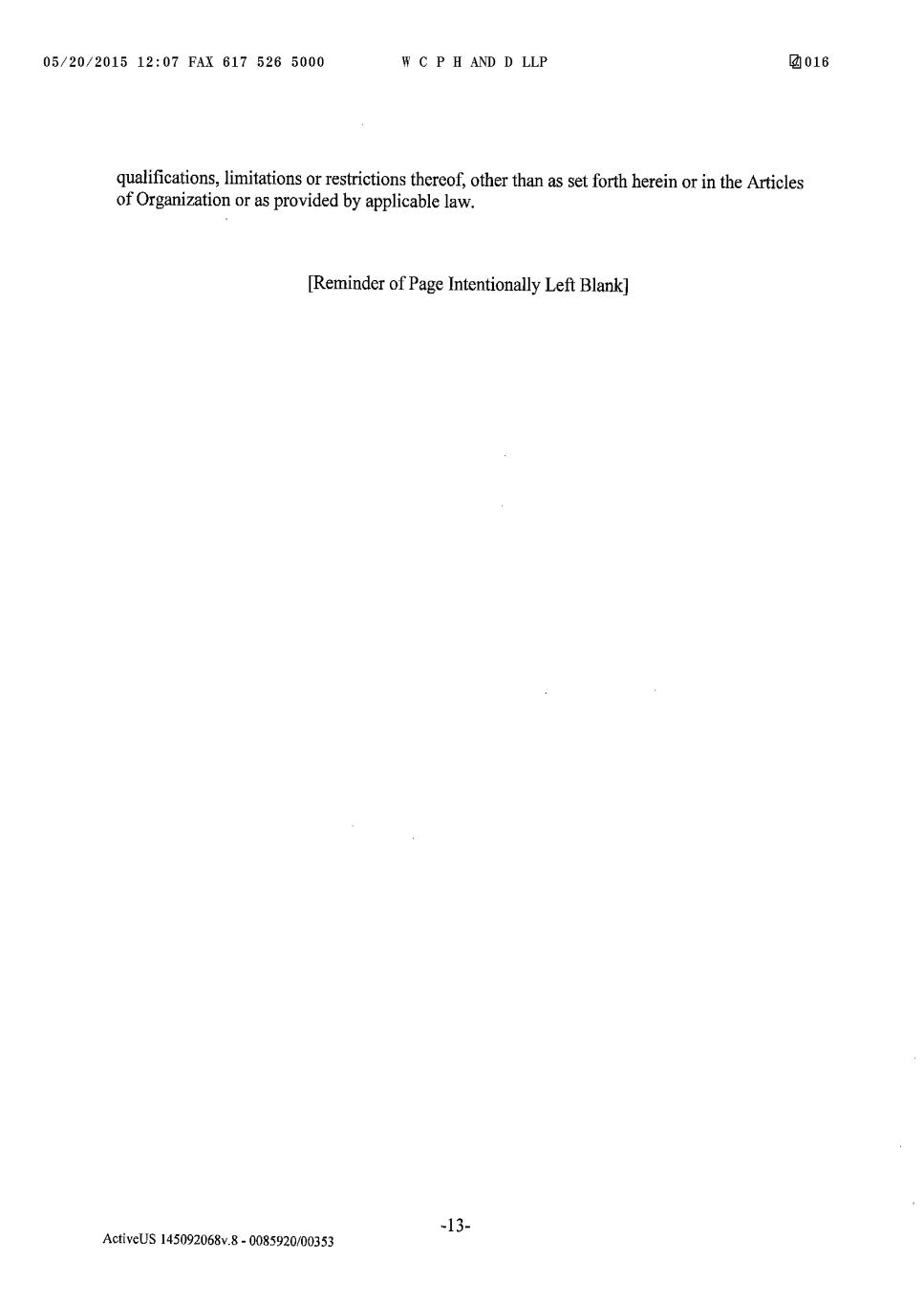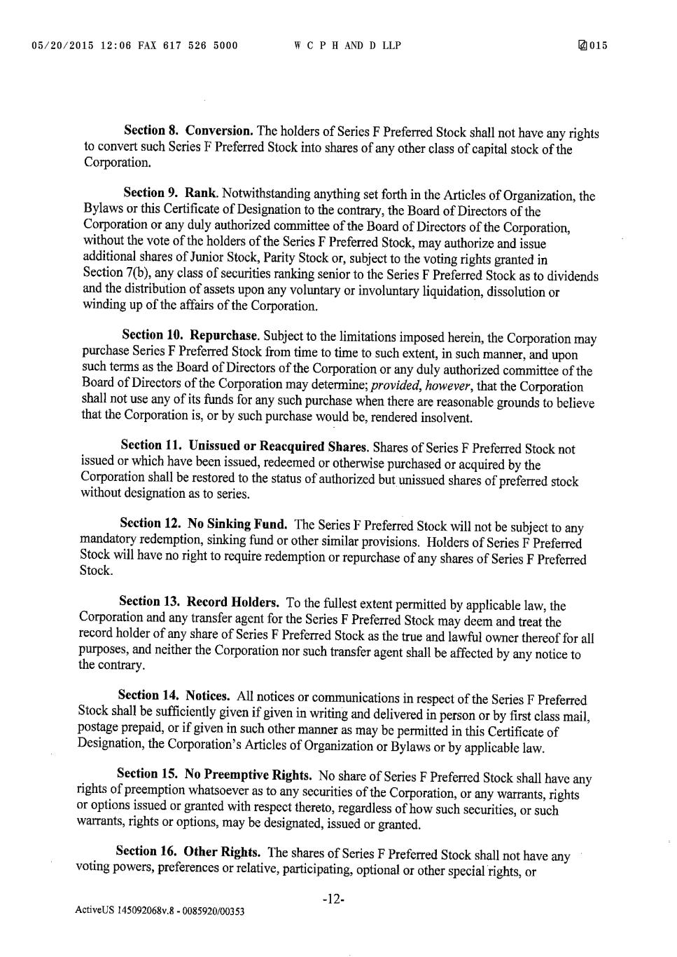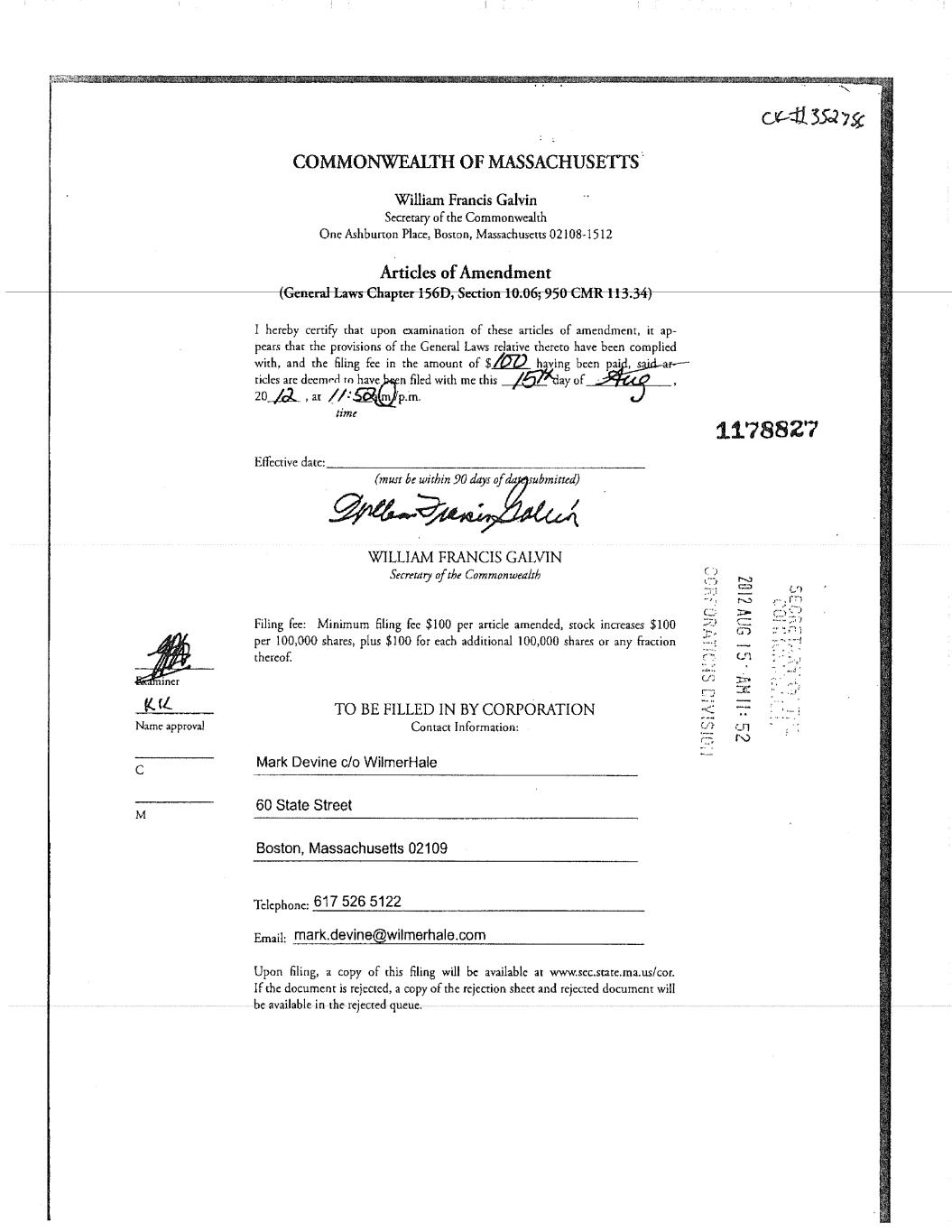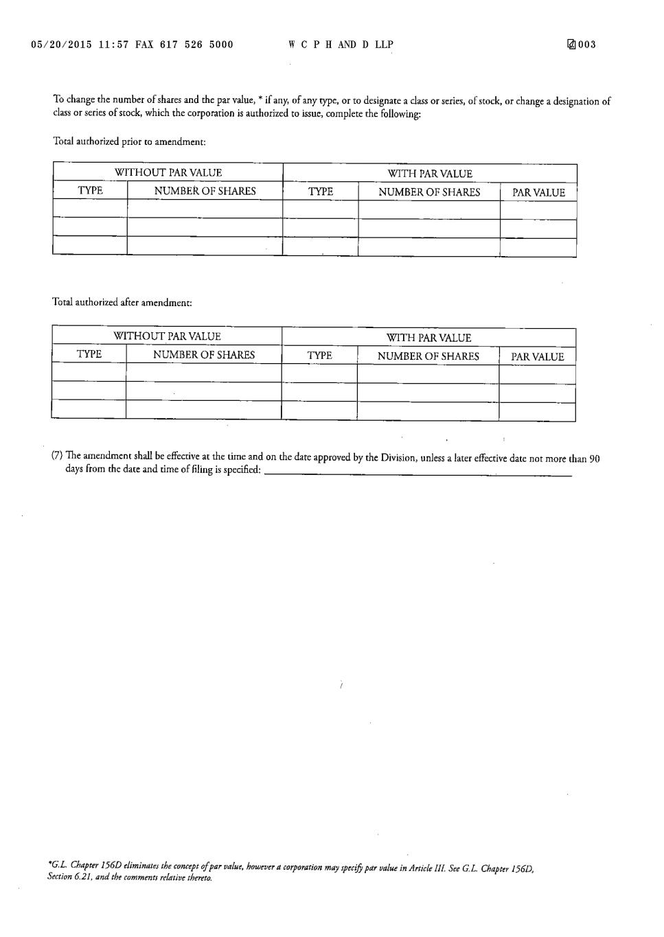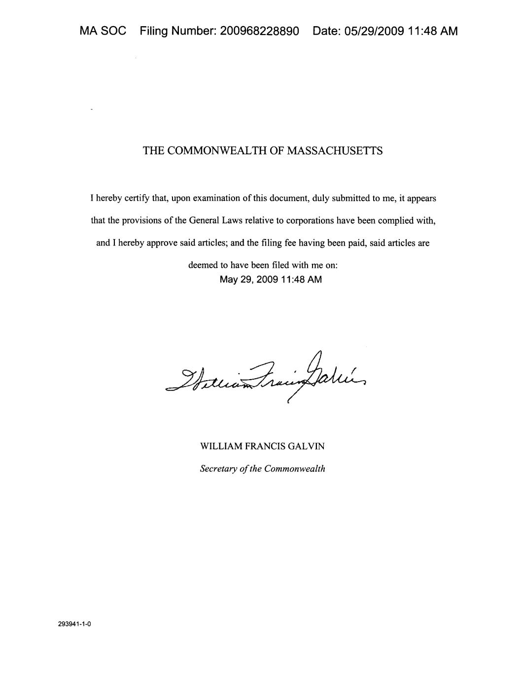 THE COMMONWEALTH OF MASSACHUSETTS I hereby certify that, upon examination of this document, duly submitted to me, it appears that the provisions of the General Laws relative to corporations have been complied with, and I hereby approve said articles; and the filing fee having been paid, said articles are deemed to have been filed with me on: WILLIAM FRANCIS GALVIN Secretary of the Commonwealth May 20, 2015 12:09 PM MA SOC Filing Number: 201532399460 Date: 5/20/2015 12:09:00 PM