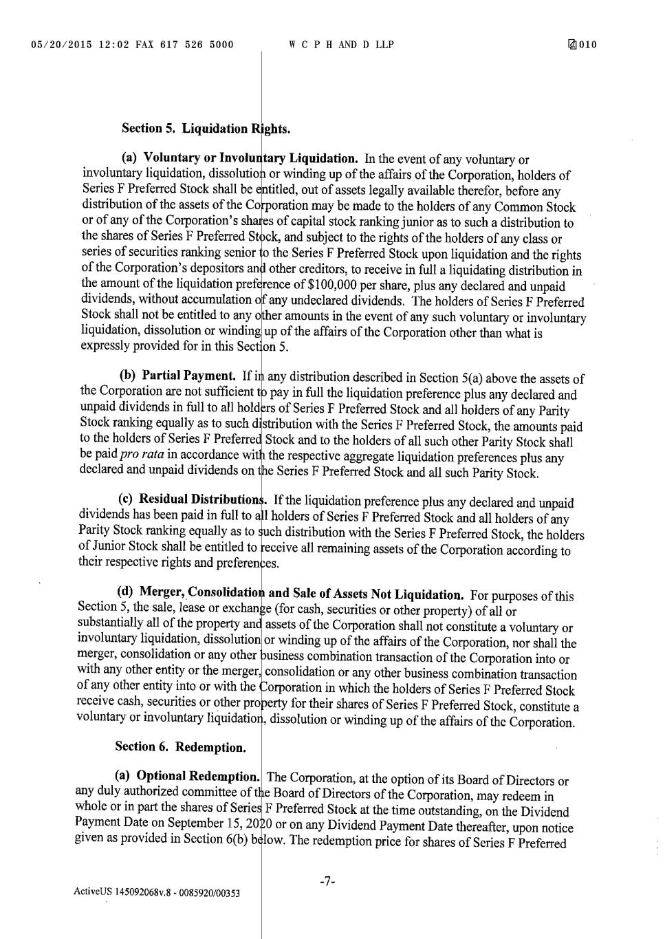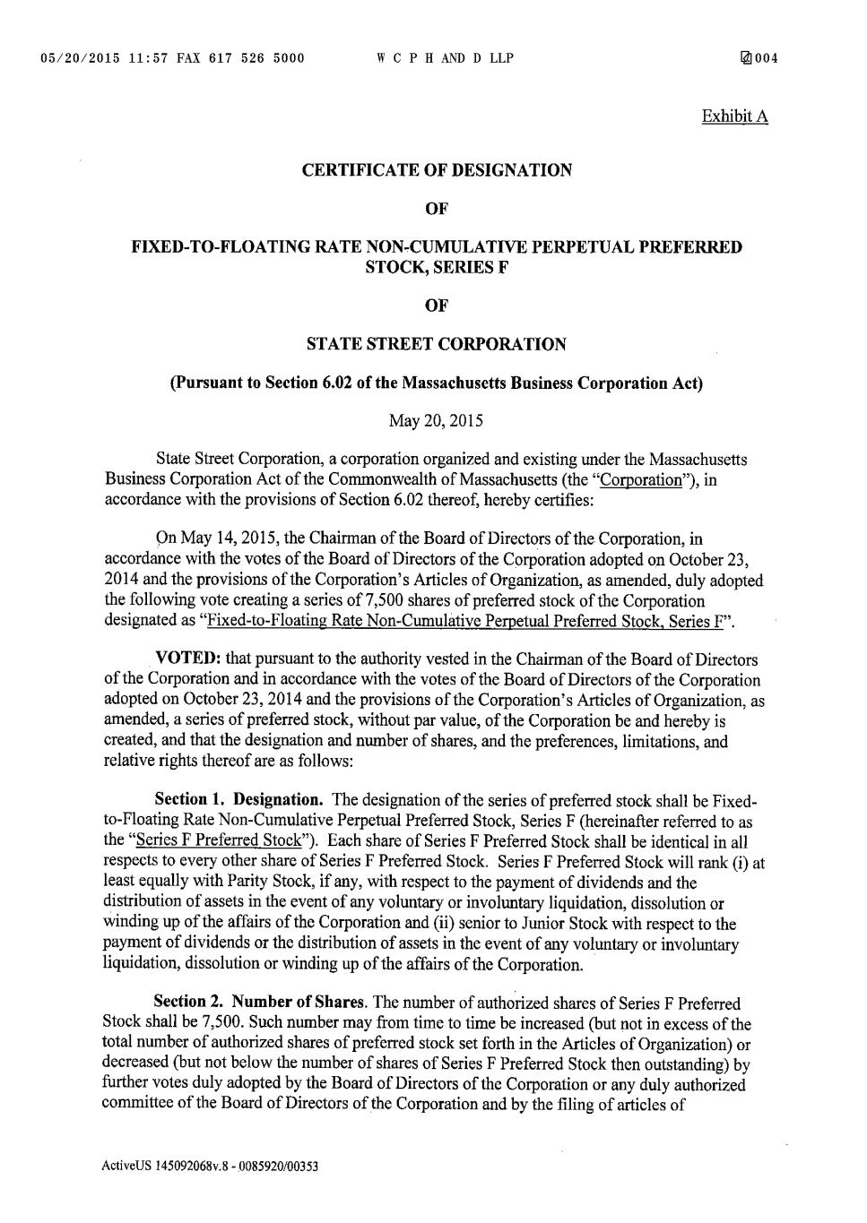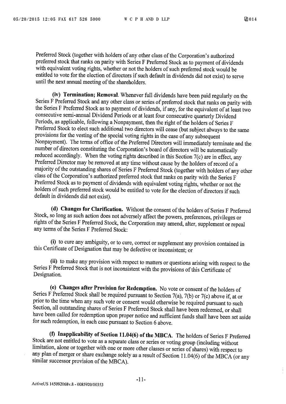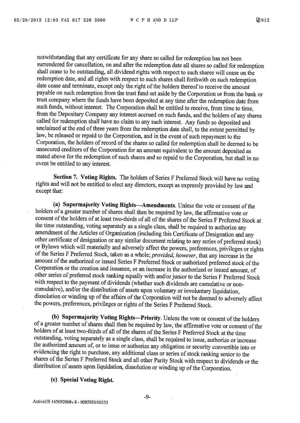 THE COMMONWEALTH OF MASSACHUSETTS I hereby certify that, upon examination of this document, duly submitted to me, it appears that the provisions of the General Laws relative to corporations have been complied with, and I hereby approve said articles; and the filing fee having been paid, said articles are deemed to have been filed with me on: WILLIAM FRANCIS GALVIN Secretary of the Commonwealth May 20, 2015 12:09 PM MA SOC Filing Number: 201532399460 Date: 5/20/2015 12:09:00 PM