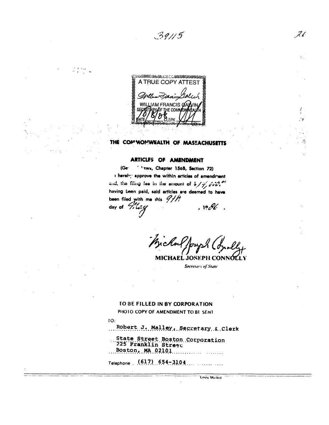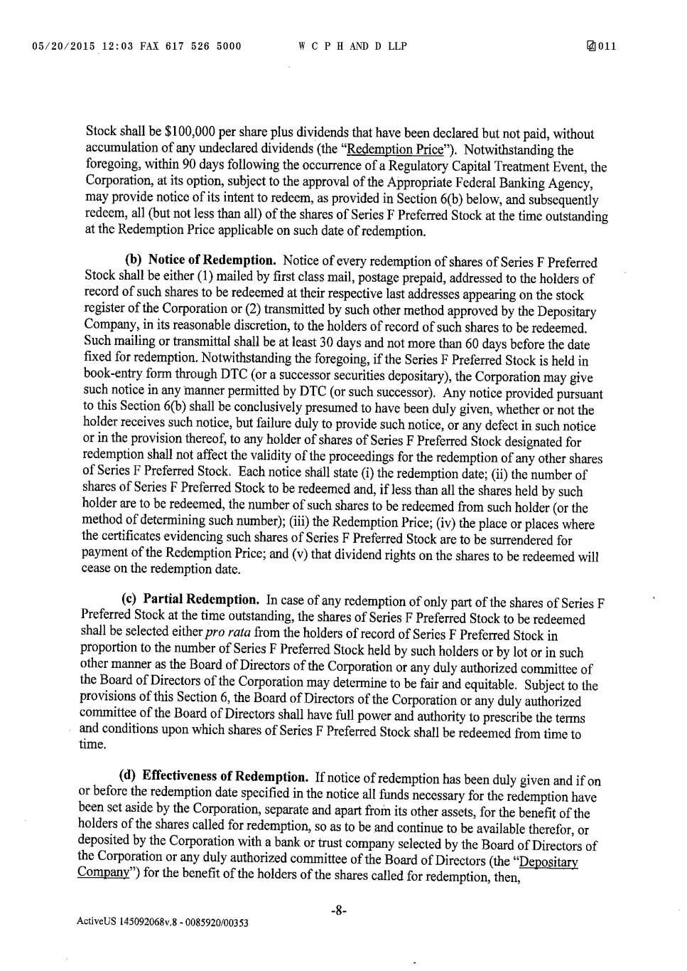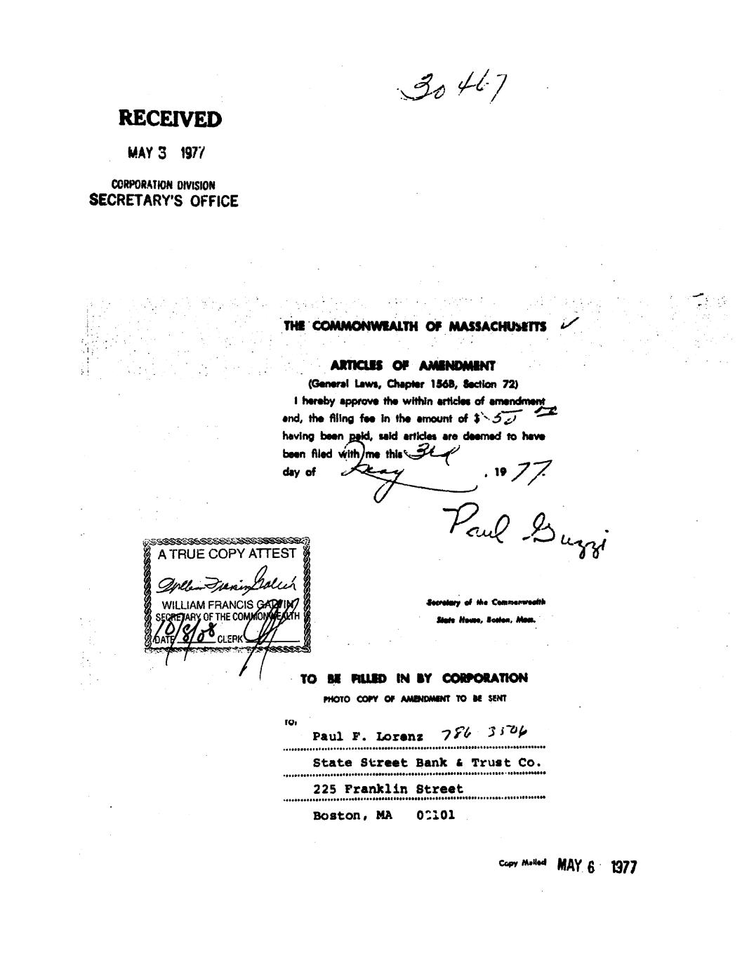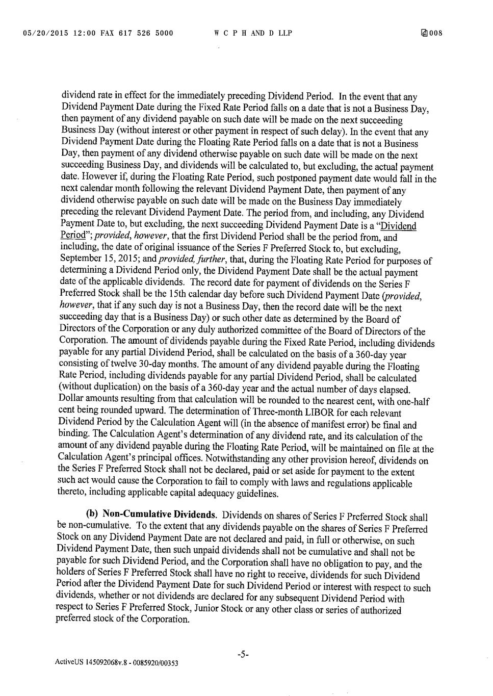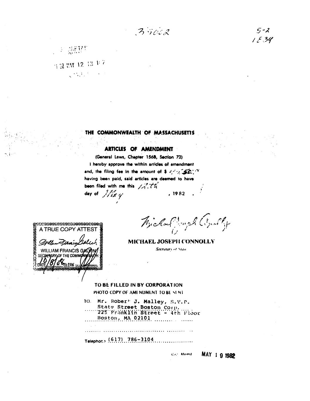 THE COMMONWEALTH OF MASSACHUSETTS I hereby certify that, upon examination of this document, duly submitted to me, it appears that the provisions of the General Laws relative to corporations have been complied with, and I hereby approve said articles; and the filing fee having been paid, said articles are deemed to have been filed with me on: WILLIAM FRANCIS GALVIN Secretary of the Commonwealth May 20, 2015 12:09 PM MA SOC Filing Number: 201532399460 Date: 5/20/2015 12:09:00 PM