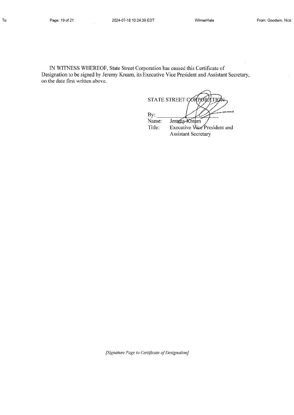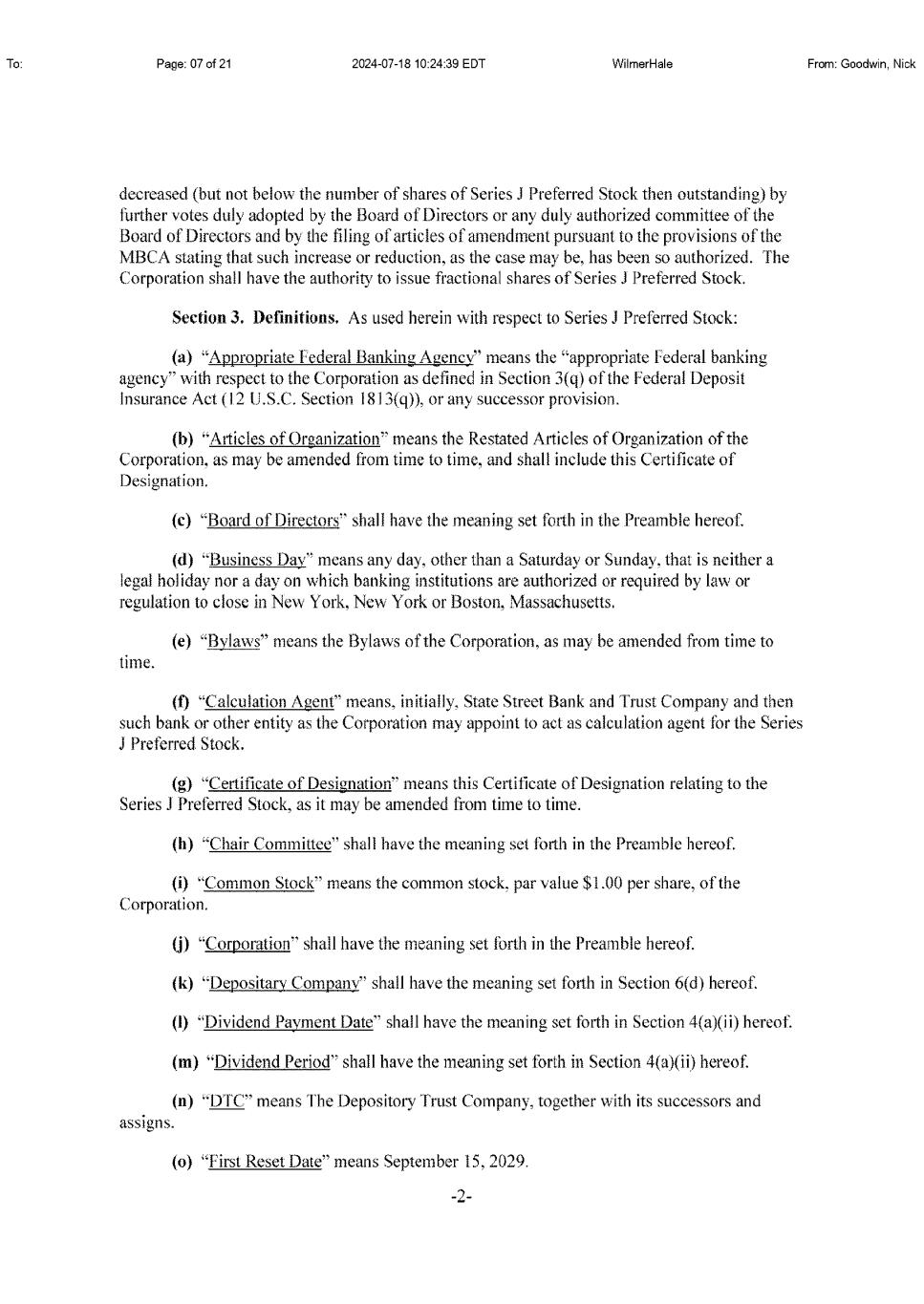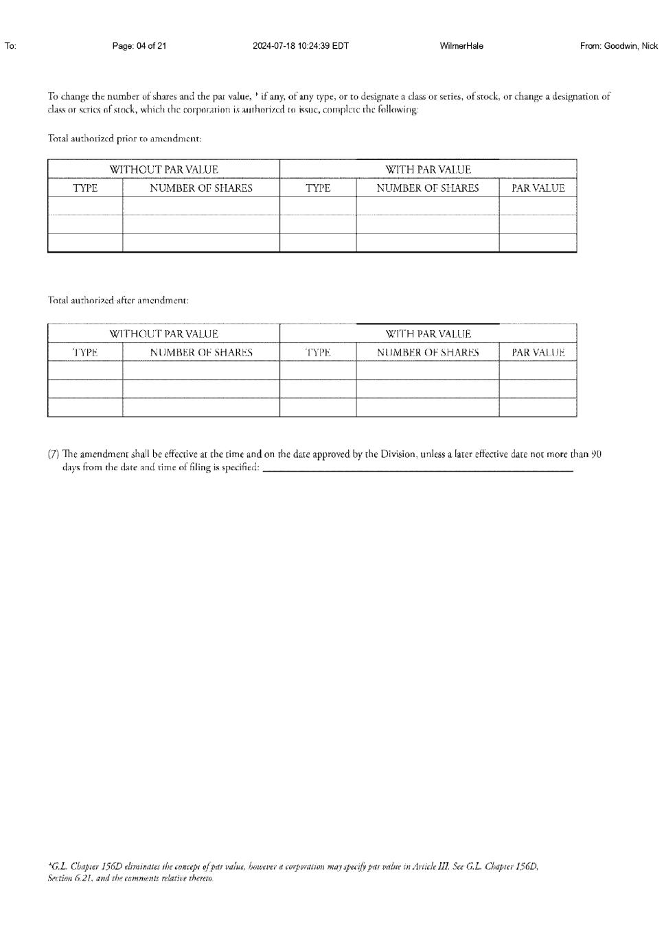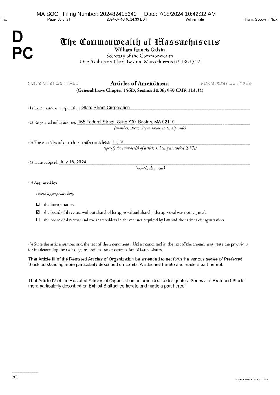 THE COMMONWEALTH OF MASSACHUSETTS I hereby certify that, upon examination of this document, duly submitted to me, it appears that the provisions of the General Laws relative to corporations have been complied with, and I hereby approve said articles; and the filing fee having been paid, said articles are deemed to have been filed with me on: WILLIAM FRANCIS GALVIN Secretary of the Commonwealth July 18, 2024 10:42 AM MA SOC Filing Number: 202482415640 Date: 7/18/2024 10:42:32 AM