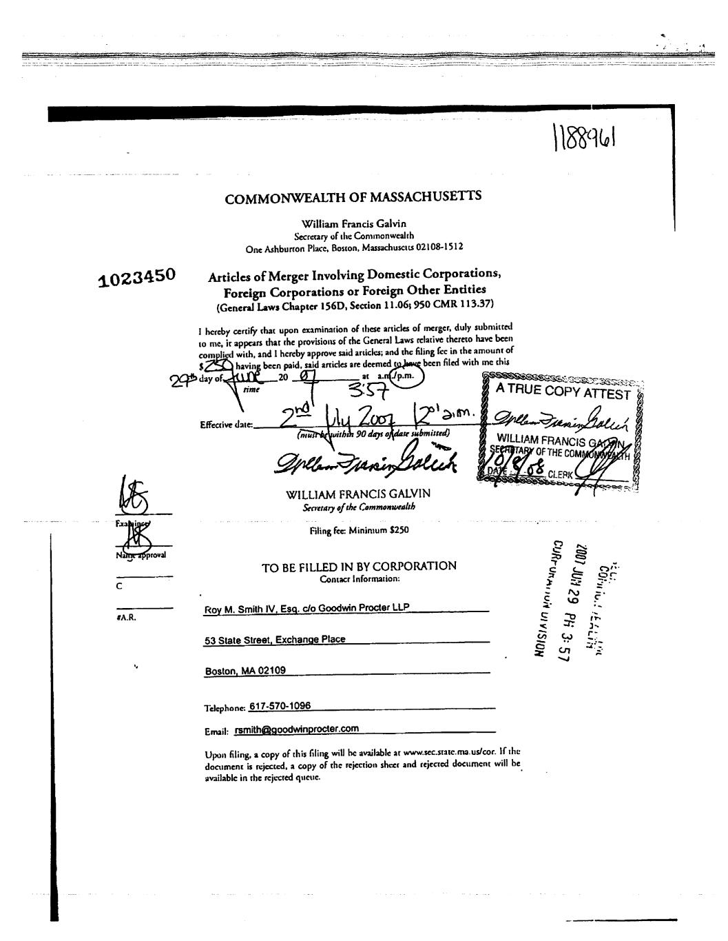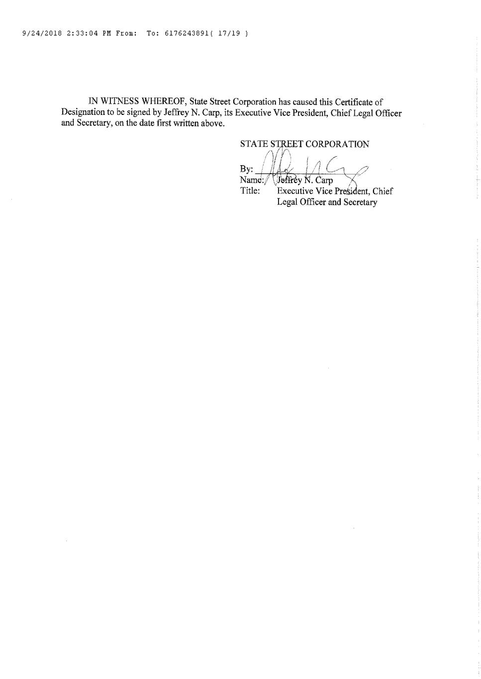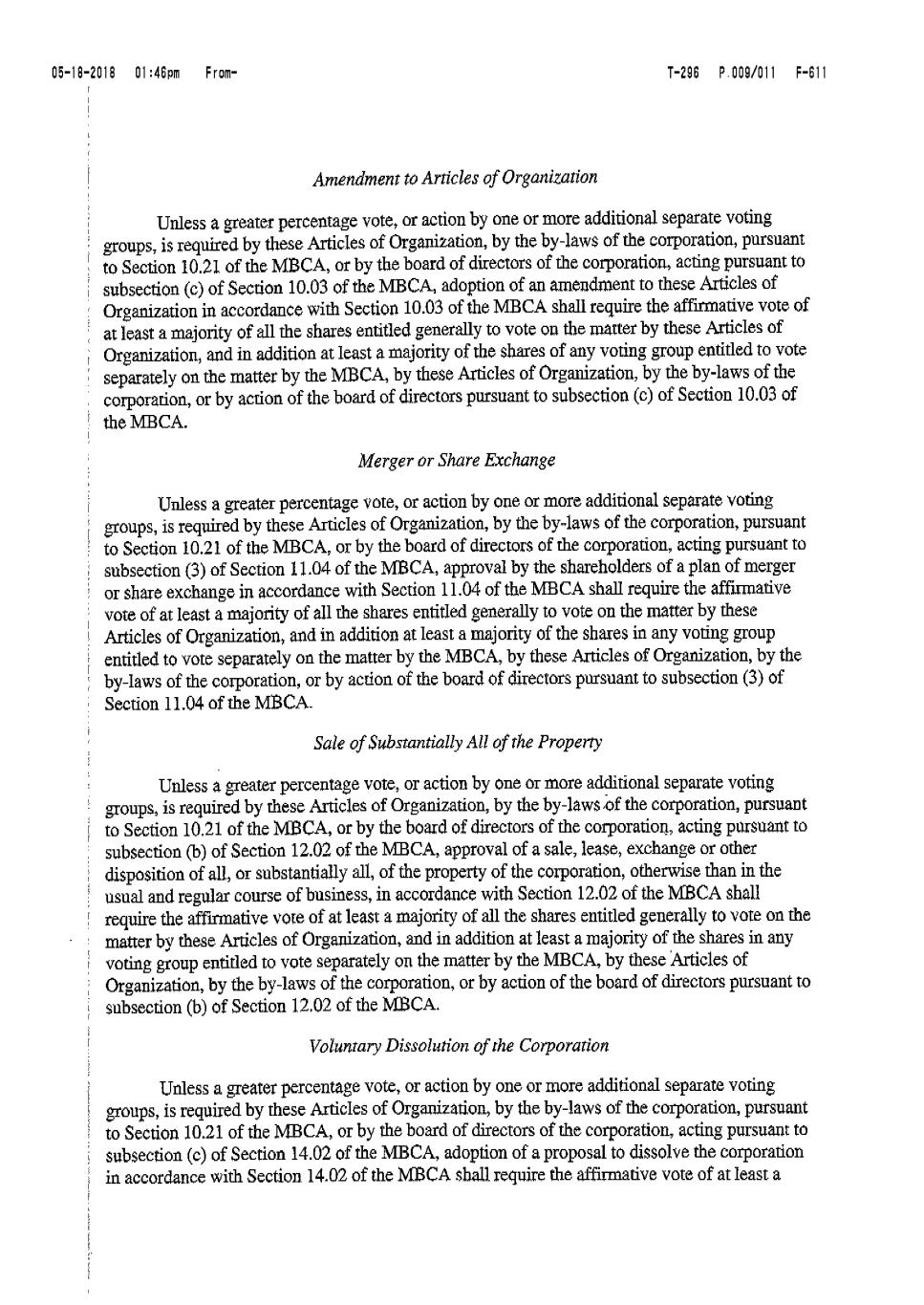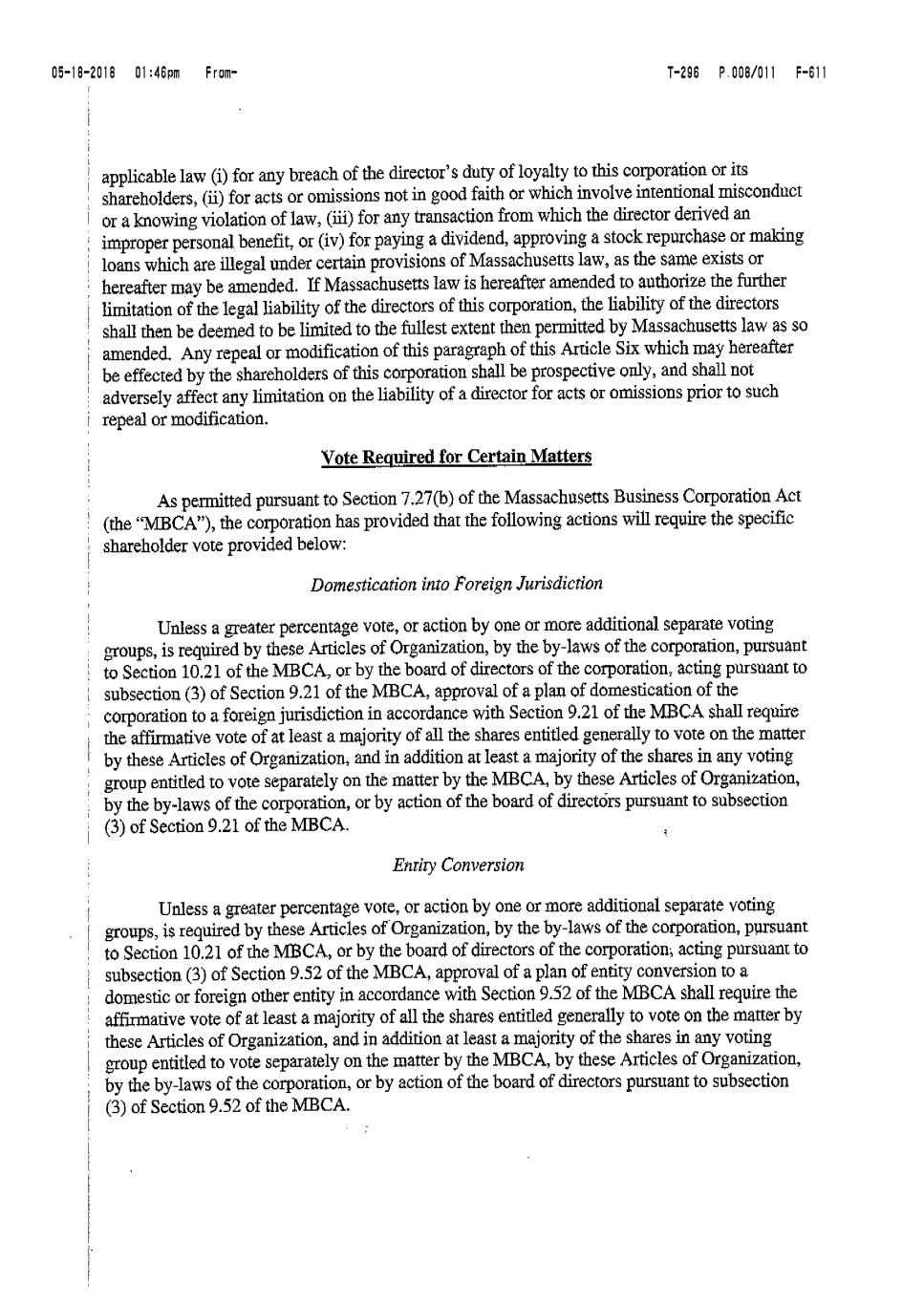 THE COMMONWEALTH OF MASSACHUSETTS I hereby certify that, upon examination of this document, duly submitted to me, it appears that the provisions of the General Laws relative to corporations have been complied with, and I hereby approve said articles; and the filing fee having been paid, said articles are deemed to have been filed with me on: WILLIAM FRANCIS GALVIN Secretary of the Commonwealth May 18, 2018 01:59 PM MA SOC Filing Number: 201809464860 Date: 5/18/2018 1:59:00 PM