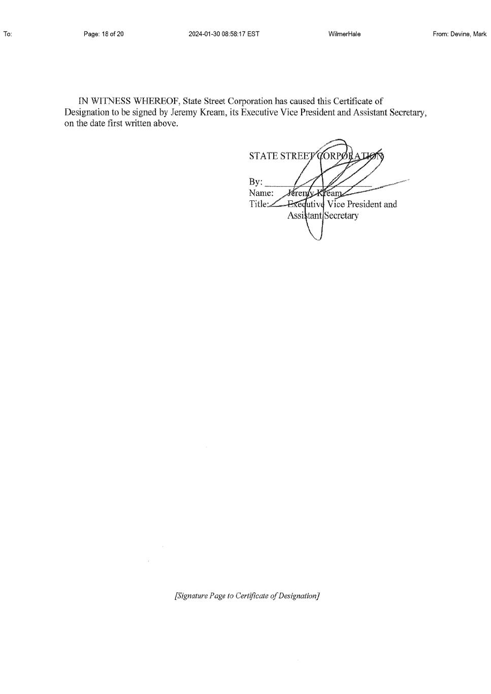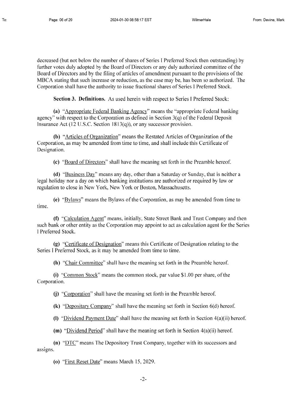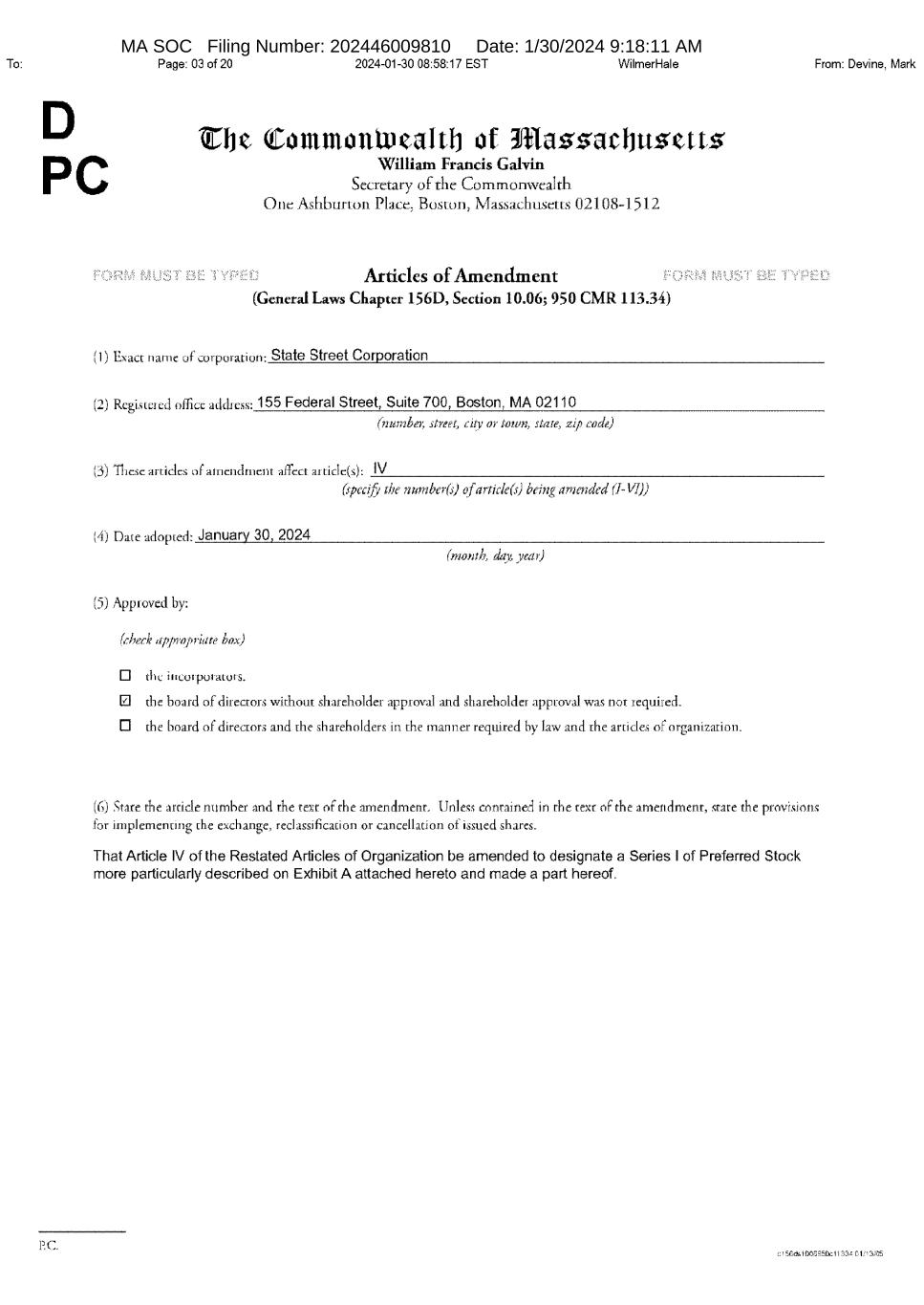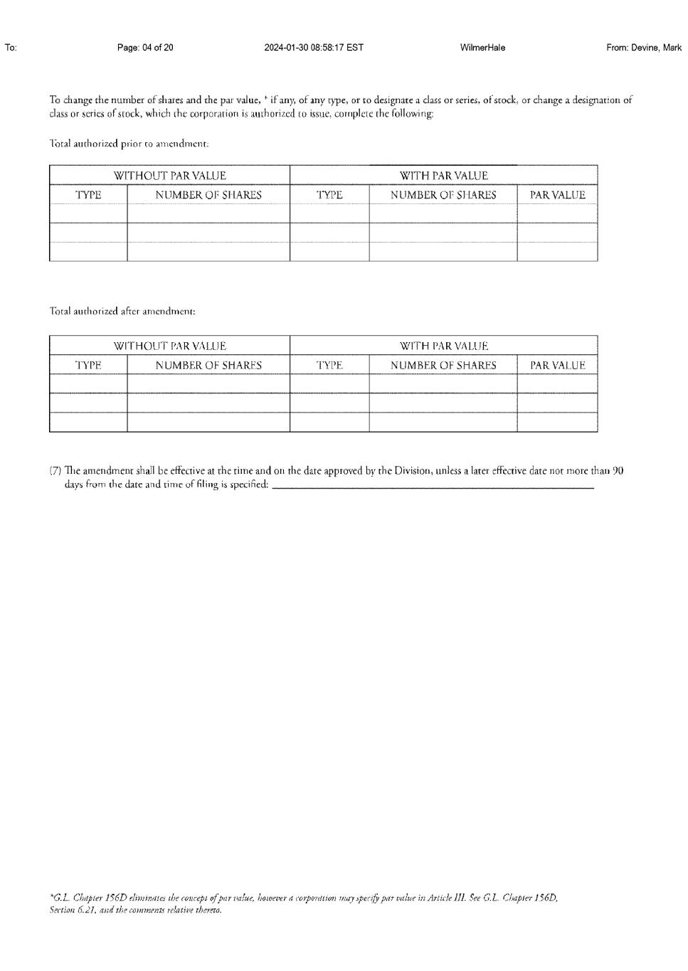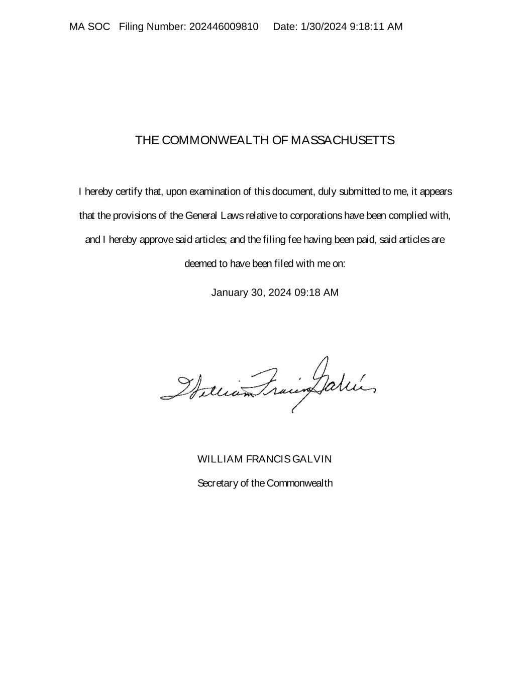 THE COMMONWEALTH OF MASSACHUSETTS I hereby certify that, upon examination of this document, duly submitted to me, it appears that the provisions of the General Laws relative to corporations have been complied with, and I hereby approve said articles; and the filing fee having been paid, said articles are deemed to have been filed with me on: WILLIAM FRANCIS GALVIN Secretary of the Commonwealth January 30, 2024 09:18 AM MA SOC Filing Number: 202446009810 Date: 1/30/2024 9:18:11 AM
