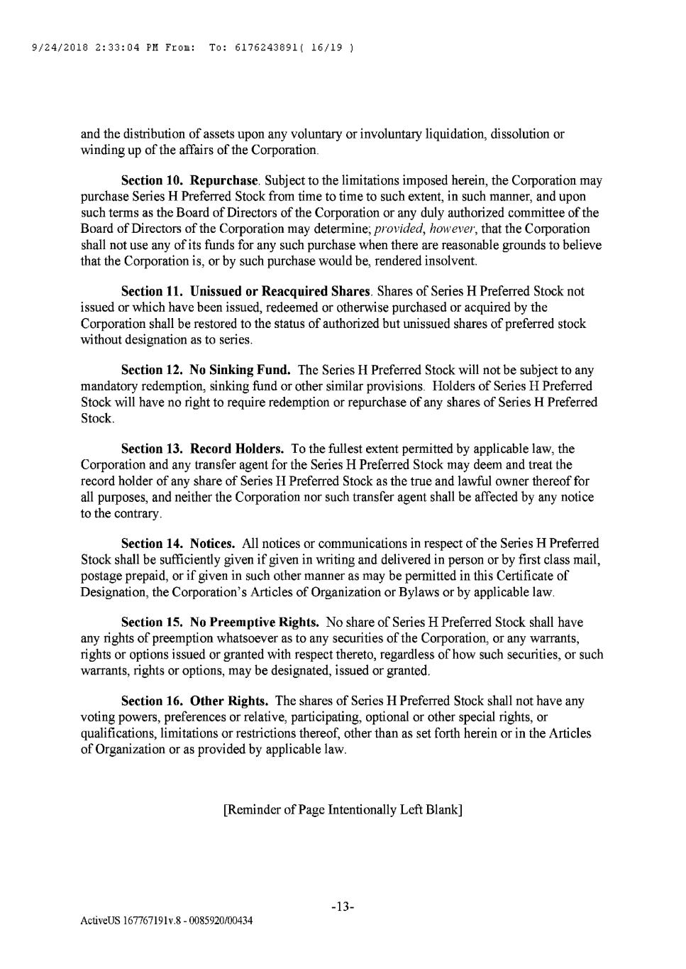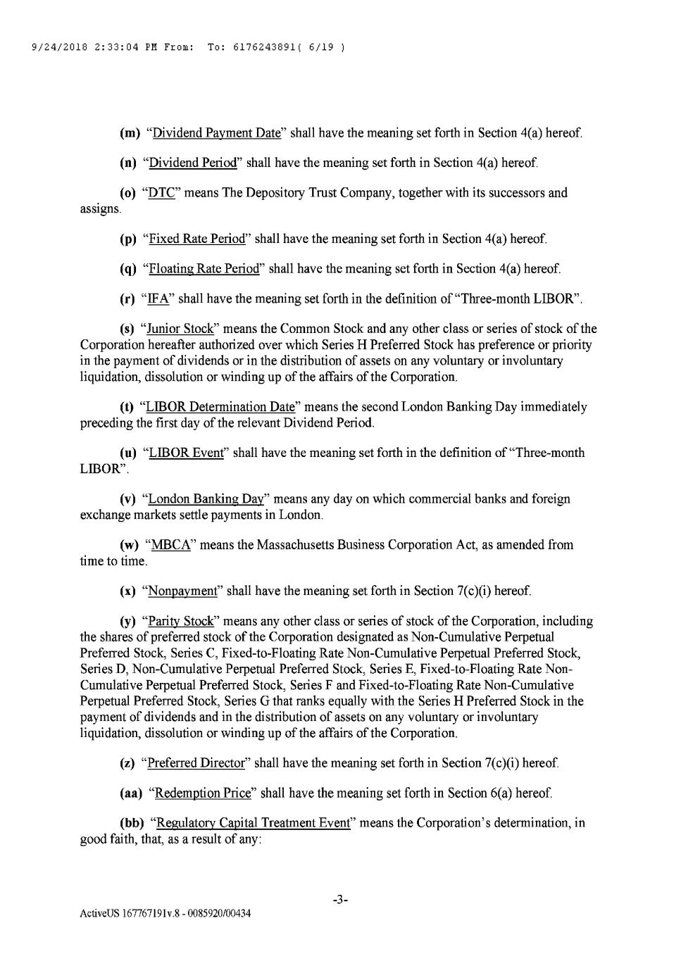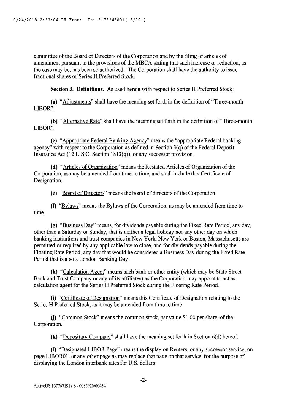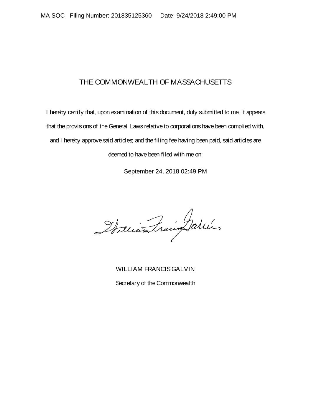 THE COMMONWEALTH OF MASSACHUSETTS I hereby certify that, upon examination of this document, duly submitted to me, it appears that the provisions of the General Laws relative to corporations have been complied with, and I hereby approve said articles; and the filing fee having been paid, said articles are deemed to have been filed with me on: WILLIAM FRANCIS GALVIN Secretary of the Commonwealth September 24, 2018 02:49 PM MA SOC Filing Number: 201835125360 Date: 9/24/2018 2:49:00 PM
