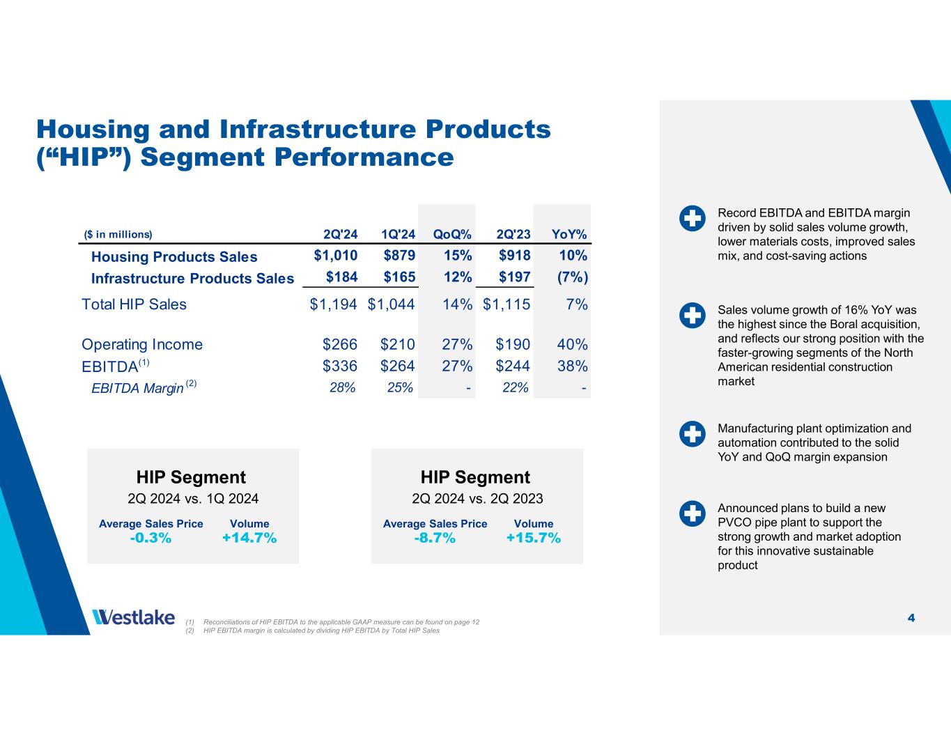 3 Westlake Corporation 2Q 2024 Sales volume grew a solid 12% YoY driven by Pipe & Fittings and Siding & Trim in HIP and chlorovinyls in PEM Average sales price reflected QoQ growth following several quarters of declines, driven by higher PVC resin and polyethylene prices in PEM The recovery in global industrial and manufacturing activity has been slower than in previous cycles, which is impacting PEM sales volume and margins Record HIP EBITDA of $336 million and EBITDA margin of 28%(2) Westlake 2Q 2024 vs. 1Q 2024 Average Sales Price +2.3% Volume +5.5% Westlake 2Q 2024 vs. 2Q 2023 Average Sales Price -13.7% Volume +12.4% 2Q'24 1Q'24 QoQ% 2Q'23 YoY% $3,207 $2,975 8% $3,251 (1%) $406 $223 82% $396 3% Performance and Essential Materials $391 $253 55% $435 (10%) Housing and Infrastructure Products $336 $264 27% $244 38% Corporate $17 $29 - $11 - $744 $546 36% $690 8% Operating Income Sales EBITDA(1) ($ in millions) (1) Reconciliations of EBITDA, Performance and Essential Materials EBITDA, Housing and Infrastructure Products EBITDA and Corporate EBITDA to the applicable GAAP measures can be found on pages 11 and 12 (2) HIP EBITDA margin is calculated by dividing HIP EBITDA by Total HIP Sales
