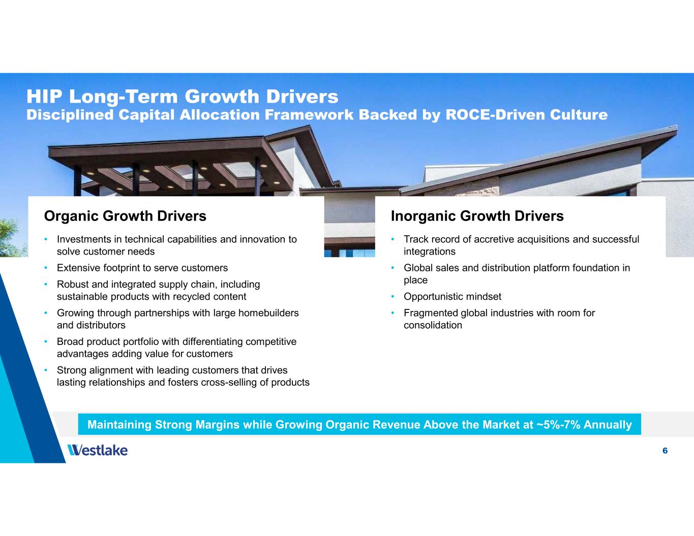 5 Housing and Infrastructure Products Update 2 Repair & remodel activity provided steady growth driven by large number of homes in prime remodel age, healthy home equity levels, homeowners with low-rate mortgages remaining in place, and significant backlog of projects 3 While our order books remain solid, unusually wet and hot weather conditions in many parts of North America combined with the recent slowdown in U.S. housing starts and remodeling activity could have an impact on our sales volume in the second half of 2024 4 The breadth of our footprint and expansive product offerings provide customers the branded products they need to execute their growth plans and provided the product cross-selling and product suite sales opportunities that helped drive our record second quarter operating income 1 Longer-term housing fundamentals remain strong due to decade-plus of under-building, increasingly favorable demographics and increasing popularity of remote work