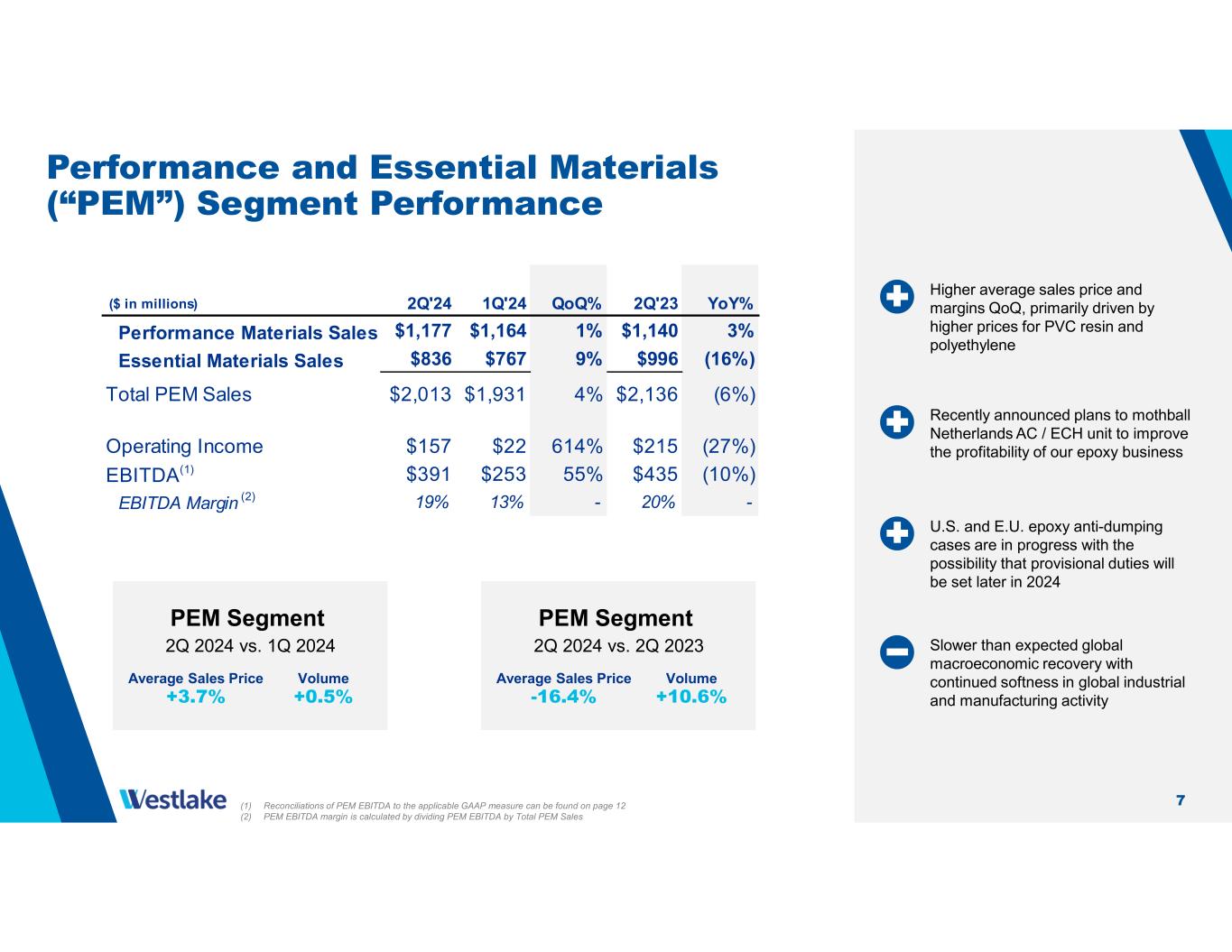 2 Second Quarter 2024 Highlights 2Q 2024 Financial Results Record HIP segment earnings with improving PEM segment profitability • Jean-Marc Gilson named President and CEO; Albert Chao appointed Executive Chairman • Housing and Infrastructure Products (HIP) reported records in income from operations of $266 million, EBITDA of $336 million and EBITDA margin(2) of 28% • Performance and Essential Materials (PEM) EBITDA margin(3) increased to 19% from 13% in 1Q 2024 driven by a 4% increase in average sales price • Recently announced mothballing of operations at our European AC / ECH unit to reduce costs and improve performance in our epoxy business • 2Q cost savings of $50 million ($85 million YTD) towards our 2024 target of $125 – $150 million • Investment-grade credit rating with $3.0 billion of cash and equivalents $3.2B Net Sales 8% increase vs. 1Q $313M Net Income 80% increase vs. 1Q $744M EBITDA(1) 36% increase vs. 1Q $2.40 Net Income Per Share $237M Net Cash Provided by Operating Activities $3.0B Cash and Equivalents (1) Reconciliation of EBITDA to Net Income, Income from Operations and Net Cash Provided by Operating Activities can be found on page 11 (2) HIP EBITDA margin is calculated by dividing HIP EBITDA by Total HIP Sales (3) PEM EBITDA margin is calculated by dividing PEM EBITDA by Total PEM Sales