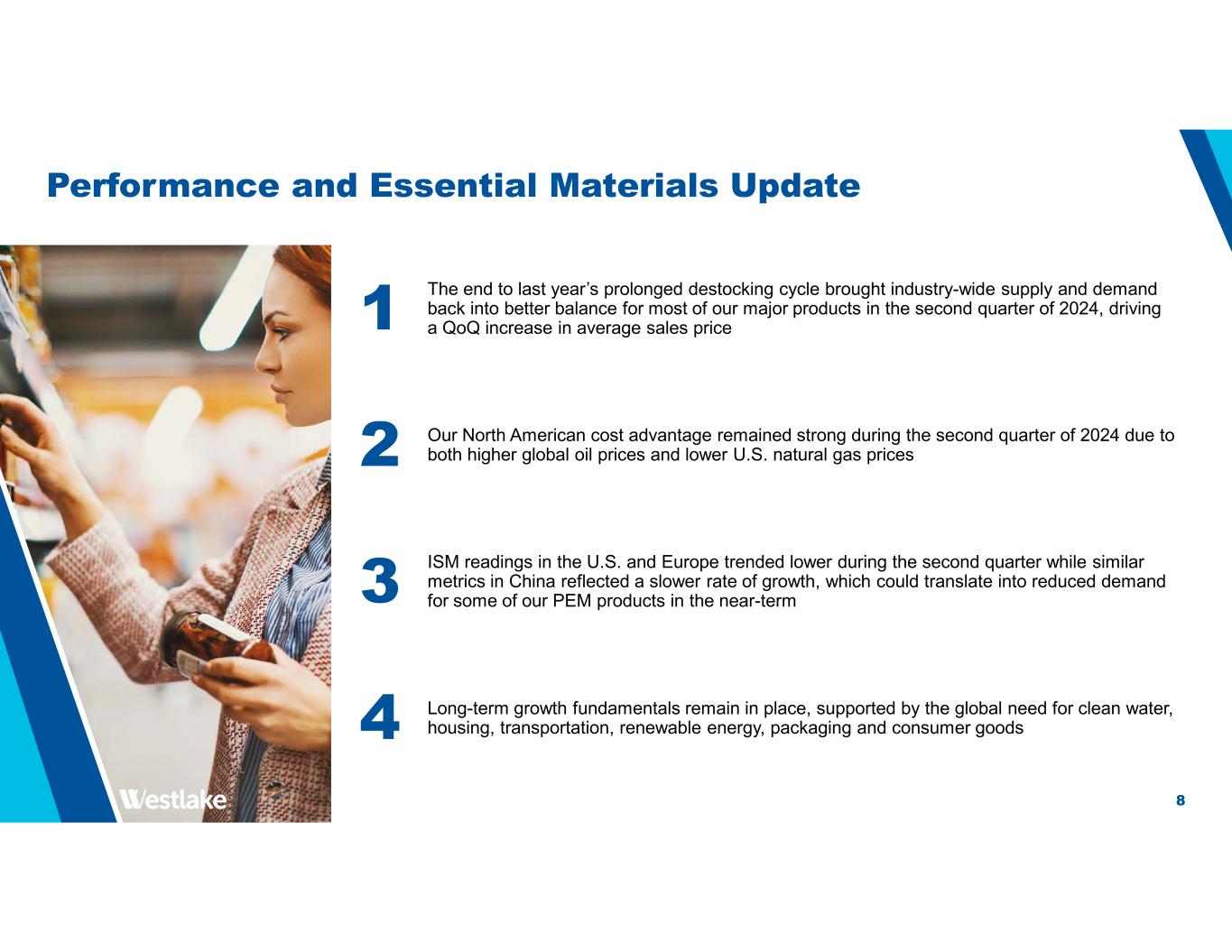 8 Performance and Essential Materials Update 2 Our North American cost advantage remained strong during the second quarter of 2024 due to both higher global oil prices and lower U.S. natural gas prices 3 ISM readings in the U.S. and Europe trended lower during the second quarter while similar metrics in China reflected a slower rate of growth, which could translate into reduced demand for some of our PEM products in the near-term 4 Long-term growth fundamentals remain in place, supported by the global need for clean water, housing, transportation, renewable energy, packaging and consumer goods 1 The end to last year’s prolonged destocking cycle brought industry-wide supply and demand back into better balance for most of our major products in the second quarter of 2024, driving a QoQ increase in average sales price