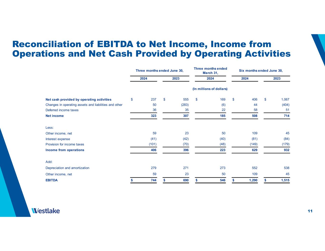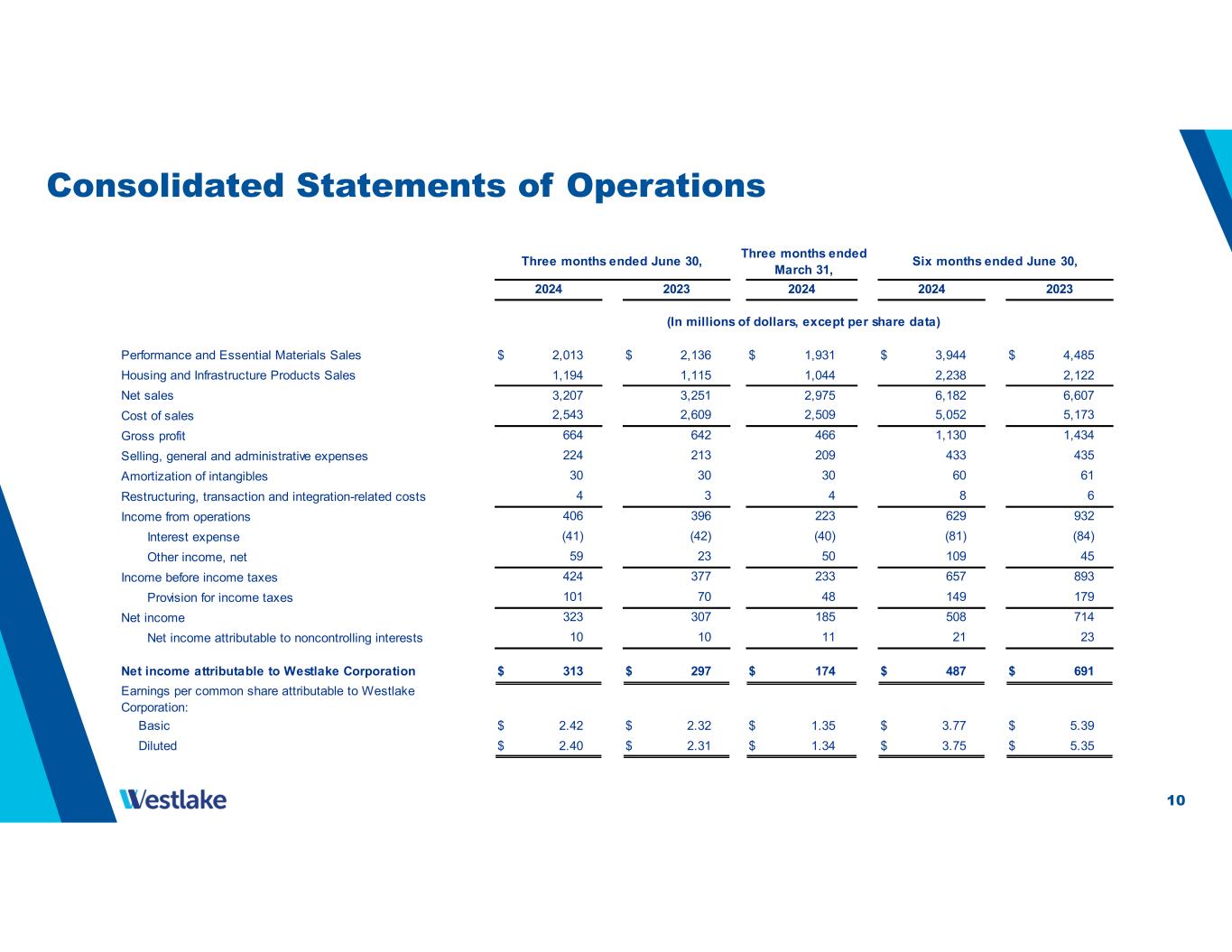 10 Consolidated Statements of Operations Performance and Essential Materials Sales $ 2,013 $ 2,136 $ 1,931 $ 3,944 $ 4,485 Housing and Infrastructure Products Sales 1,194 1,115 1,044 2,238 2,122 Net sales 3,207 3,251 2,975 6,182 6,607 Cost of sales Gross profit Selling, general and administrative expenses Amortization of intangibles Restructuring, transaction and integration-related costs Income from operations Interest expense Other income, net Income before income taxes Provision for income taxes Net income Net income attributable to noncontrolling interests Net income attributable to Westlake Corporation $ 313 $ 297 $ 174 $ 487 $ 691 Earnings per common share attributable to Westlake Corporation: Basic $ 2.42 $ 2.32 $ 1.35 $ 3.77 $ 5.39 Diluted $ 2.40 $ 2.31 $ 1.34 $ 3.75 $ 5.35 Three months ended June 30, Six months ended June 30, Three months ended March 31, 664 642 1,130 1,434 2024 2,509 466 2,543 2,609 5,052 5,173 2024 224 213 433 435 209 30 30 60 61 30 4 3 8 6 406 396 629 932 (41) (42) (81) (84) 307 508 714 424 377 657 893 59 23 109 45 323 185 70 149 179 4 223 (40) 50 2023 2024 2023 (In millions of dollars, except per share data) 233 48 101 10 21 23 11 10