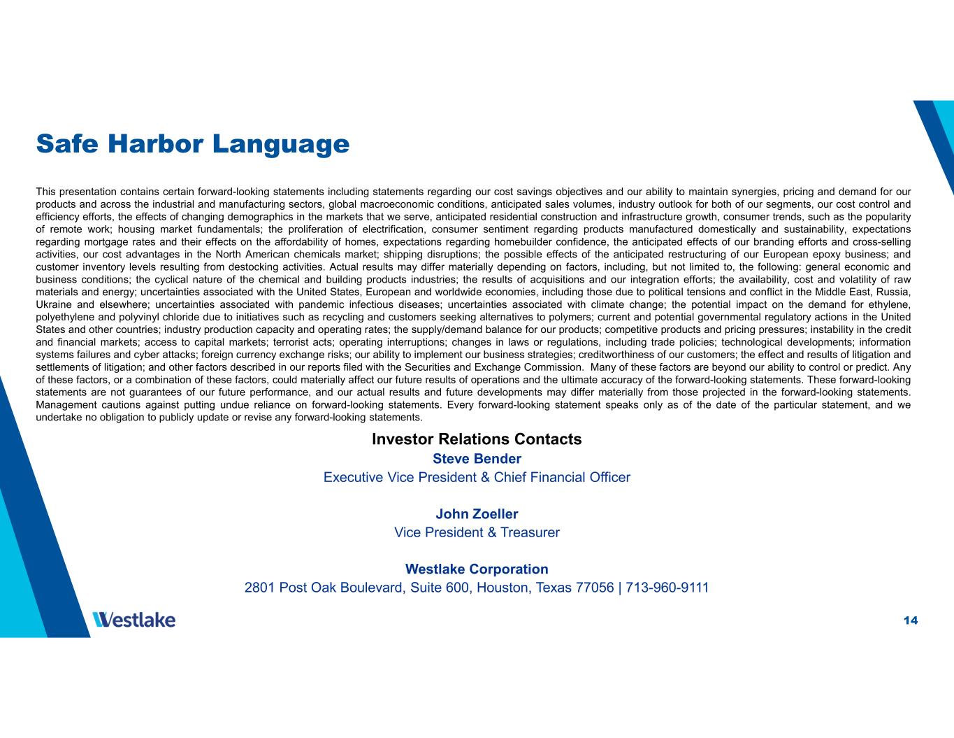 14 Safe Harbor Language This presentation contains certain forward-looking statements including statements regarding our cost savings objectives and our ability to maintain synergies, pricing and demand for our products and across the industrial and manufacturing sectors, global macroeconomic conditions, anticipated sales volumes, industry outlook for both of our segments, our cost control and efficiency efforts, the effects of changing demographics in the markets that we serve, anticipated residential construction and infrastructure growth, consumer trends, such as the popularity of remote work; housing market fundamentals; the proliferation of electrification, consumer sentiment regarding products manufactured domestically and sustainability, expectations regarding mortgage rates and their effects on the affordability of homes, expectations regarding homebuilder confidence, the anticipated effects of our branding efforts and cross-selling activities, our cost advantages in the North American chemicals market; shipping disruptions; the possible effects of the anticipated restructuring of our European epoxy business; and customer inventory levels resulting from destocking activities. Actual results may differ materially depending on factors, including, but not limited to, the following: general economic and business conditions; the cyclical nature of the chemical and building products industries; the results of acquisitions and our integration efforts; the availability, cost and volatility of raw materials and energy; uncertainties associated with the United States, European and worldwide economies, including those due to political tensions and conflict in the Middle East, Russia, Ukraine and elsewhere; uncertainties associated with pandemic infectious diseases; uncertainties associated with climate change; the potential impact on the demand for ethylene, polyethylene and polyvinyl chloride due to initiatives such as recycling and customers seeking alternatives to polymers; current and potential governmental regulatory actions in the United States and other countries; industry production capacity and operating rates; the supply/demand balance for our products; competitive products and pricing pressures; instability in the credit and financial markets; access to capital markets; terrorist acts; operating interruptions; changes in laws or regulations, including trade policies; technological developments; information systems failures and cyber attacks; foreign currency exchange risks; our ability to implement our business strategies; creditworthiness of our customers; the effect and results of litigation and settlements of litigation; and other factors described in our reports filed with the Securities and Exchange Commission. Many of these factors are beyond our ability to control or predict. Any of these factors, or a combination of these factors, could materially affect our future results of operations and the ultimate accuracy of the forward-looking statements. These forward-looking statements are not guarantees of our future performance, and our actual results and future developments may differ materially from those projected in the forward-looking statements. Management cautions against putting undue reliance on forward-looking statements. Every forward-looking statement speaks only as of the date of the particular statement, and we undertake no obligation to publicly update or revise any forward-looking statements. Investor Relations Contacts Steve Bender Executive Vice President & Chief Financial Officer John Zoeller Vice President & Treasurer Westlake Corporation 2801 Post Oak Boulevard, Suite 600, Houston, Texas 77056 | 713-960-9111