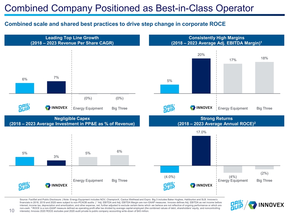 Dramatic Increase In Profitability and Free Cash Flow Synergies drive immediate accretion; complementary portfolios provide further upside 1 1 2023 Adjusted EBITDA Per Share ($/share) 2023 Adjusted EBITDA Margin 26% $3.84 $3.24 21% $2.80 18% 12% $1.71 DRQ Combined Combined Targ Ups et Up ide side DRQ Combined Combined Target Upside Company Company + Run- Company Company + Upside Rate Cost Run Rate Cost Synergies Synergies 2023 Free Cash Flow Per Share ($/share) 2023 Earnings Per Share ($/share) $1.04 $1.73 $0.87 $1.44 $0.52 $1.10 $(0.70) $0.02 DRQ Combined Combined Target DRQ Combined Combined Target Upside Upside Company Company + Upside Company Company + Upside Run Rate Cost Run Rate Cost Synergies Synergies Note: Metrics include $30 million of run rate pre-tax synergies and assume a 21% tax rate. Financial metrics exclude potential impact of purchase price adjustments. Adj. EBITDA, Adj. EBITDA Margin, and Free Cash Flow are non-GAAP measures. We define Dril-Quip and Combined Company Adj. EBITDA margin as Adj. EBITDA divided by Revenue. We define Dril-Quip and Combined Company Free Cash Flow as Cash Flow from Operations less capex.¹Dril-Quip 2023 Adj. EBITDA is pro forma for full year impact of Great North. 9