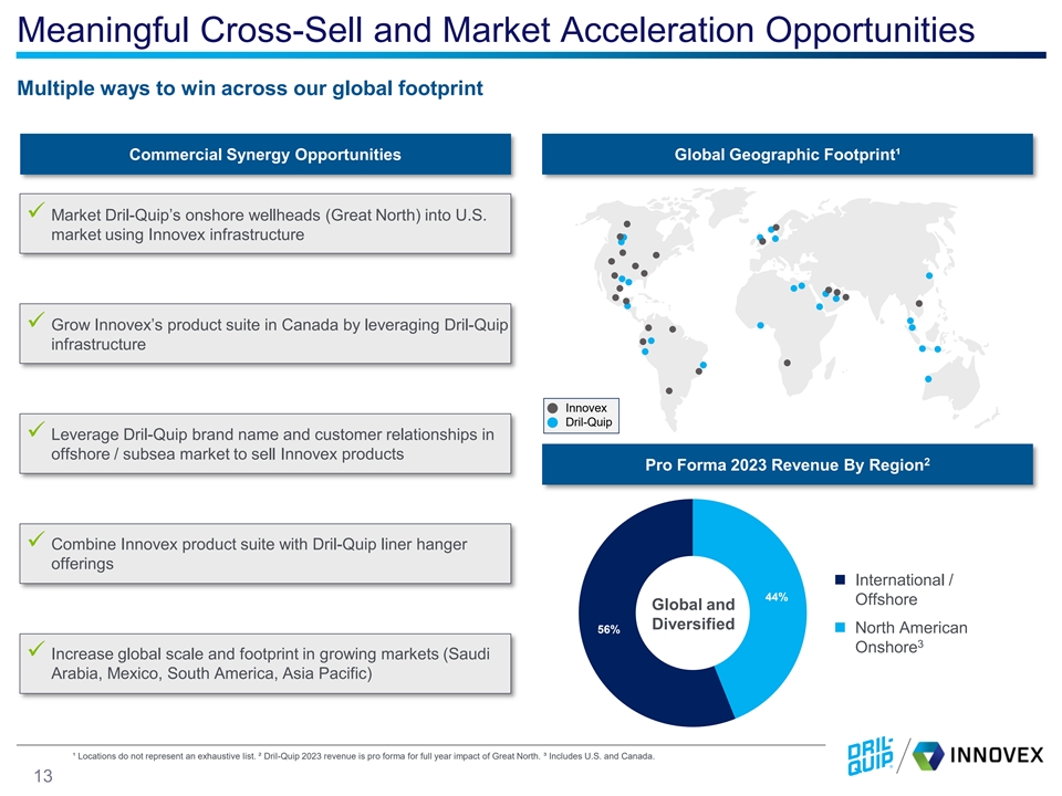 Offshore Portfolio: Highly-Engineered Mission-Critical Products … And Expands Subsea Wellbore Capabilities and Product Offering 1 Core products represent ~4% of the cost of an average offshore well Complementary Business Model Combined Company Deepwater Subsea Wellbore Portfolio ✓ Big Impact, Small Ticket ✓ Single use / consumable products ✓ Sustained growth in high moat markets Subsea Wellheads ✓ >50% revenue from products with top-3 market position Growth Accelerants ✓ Package Innovex’s casing mounted equipment with Dril-Quip’s deepwater liners, wellheads and connectors Deepwater Centralization Technologies ✓ Leverage combined footprint in the Middle East to drive faster growth High Performance Casing Connectors Expandable Liner Hangers Conventional Liner Hangers Deepwater Cementing Tool Systems SwivelMaster ¹ AFE excludes subsea production systems. 12