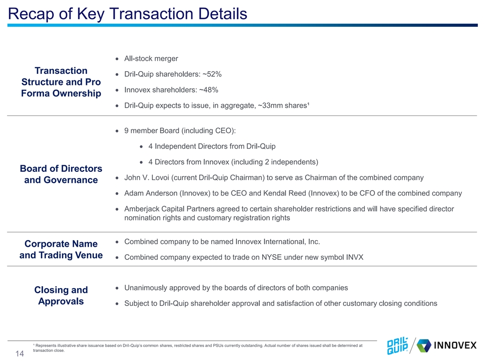 Meaningful Cross-Sell and Market Acceleration Opportunities Multiple ways to win across our global footprint Commercial Synergy Opportunities Global Geographic Footprint¹ ✓ Market Dril-Quip’s onshore wellheads (Great North) into U.S. market using Innovex infrastructure ✓ Grow Innovex’s product suite in Canada by leveraging Dril-Quip infrastructure Innovex Dril-Quip ✓ Leverage Dril-Quip brand name and customer relationships in offshore / subsea market to sell Innovex products 2 Pro Forma 2023 Revenue By Region ✓ Combine Innovex product suite with Dril-Quip liner hanger offerings ◼ International / 44% Offshore Global and Diversified 56%◼ North American 3 Onshore ✓ Increase global scale and footprint in growing markets (Saudi Arabia, Mexico, South America, Asia Pacific) ¹ Locations do not represent an exhaustive list. ² Dril-Quip 2023 revenue is pro forma for full year impact of Great North. ³ Includes U.S. and Canada. 13