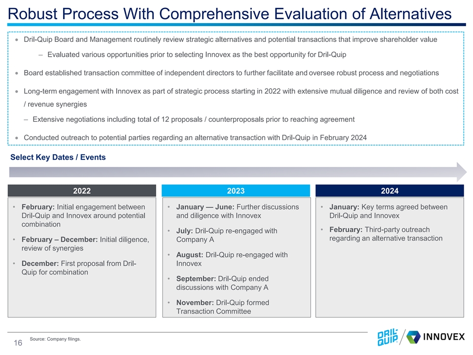 Compelling Relative Valuation and Pro Forma Ownership 1 Heads Up Contribution Heads Up Contribution Equity Contribution Dril-Quip Innovex 23% 77% 29% 71% 2022A EBITDA 30 102 2 31% 69% 2023A EBITDA 39% 61% 59 132 2 31% 69% 39% 61% LTM EBITDA 57 128 30% 70% 30% 70% LTM OCF 38 89 11% 89% 11% 89% LTM FCF 10 78 Pro-Forma 52% Ownership 1 Source: Company filings, Factset. Market data as of 3/15/2024.Note: LTM period is defined as 6/30/2023 – 6/30/2024. Relative Contribution percentages are 2 grossed up by heads up contribution percentage and adjusted for the net debt contributed by each of Dril-Quip and Innovex. Dril-Quip 2023 and LTM Adj. EBITDA and Revenue is pro forma for full year impact of Great North. Adj. EBITDA is a non-GAAP measure – please see reconciliation in appendix. 15