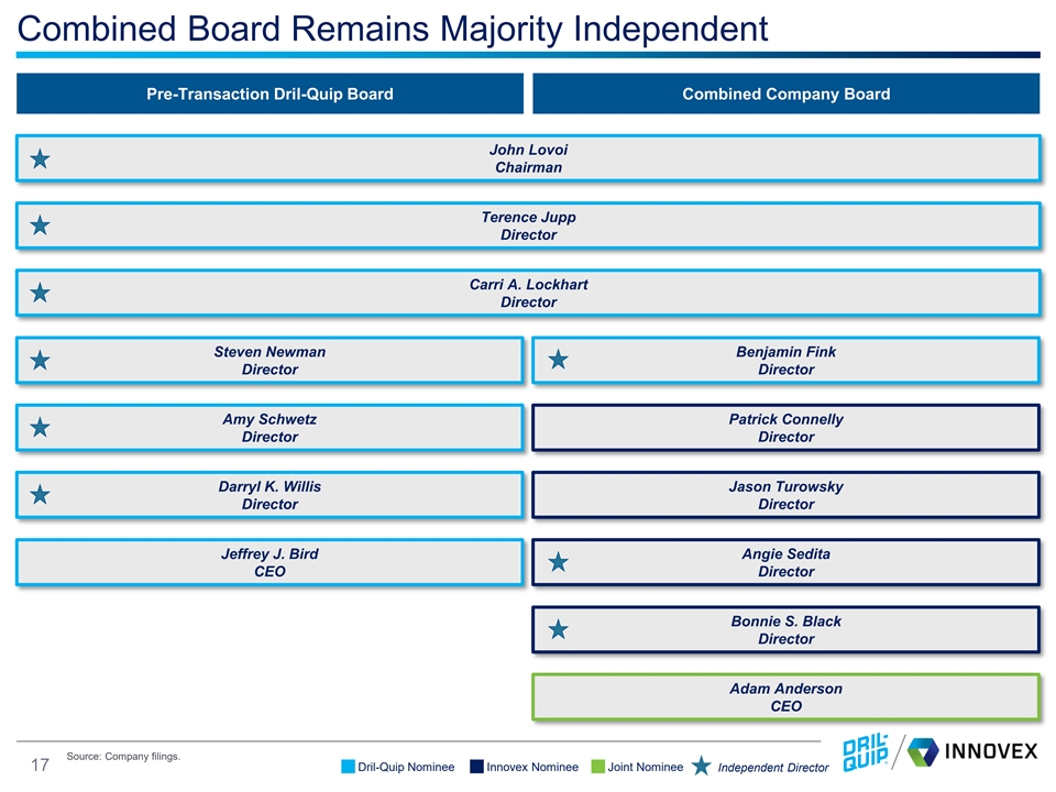 Robust Process With Comprehensive Evaluation of Alternatives • Dril-Quip Board and Management routinely review strategic alternatives and potential transactions that improve shareholder value – Evaluated various opportunities prior to selecting Innovex as the best opportunity for Dril-Quip • Board established transaction committee of independent directors to further facilitate and oversee robust process and negotiations • Long-term engagement with Innovex as part of strategic process starting in 2022 with extensive mutual diligence and review of both cost / revenue synergies – Extensive negotiations including total of 12 proposals / counterproposals prior to reaching agreement • Conducted outreach to potential parties regarding an alternative transaction with Dril-Quip in February 2024 Select Key Dates / Events 2022 2023 2024 • February: Initial engagement between • January — June: Further discussions • January: Key terms agreed between Dril-Quip and Innovex around potential and diligence with Innovex Dril-Quip and Innovex combination • February: Third-party outreach • July: Dril-Quip re-engaged with regarding an alternative transaction • February – December: Initial diligence, Company A review of synergies • August: Dril-Quip re-engaged with • December: First proposal from Dril- Innovex Quip for combination • September: Dril-Quip ended discussions with Company A • November: Dril-Quip formed Transaction Committee Source: Company filings. 16