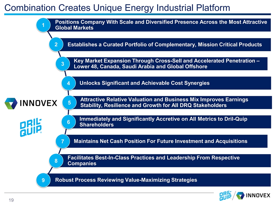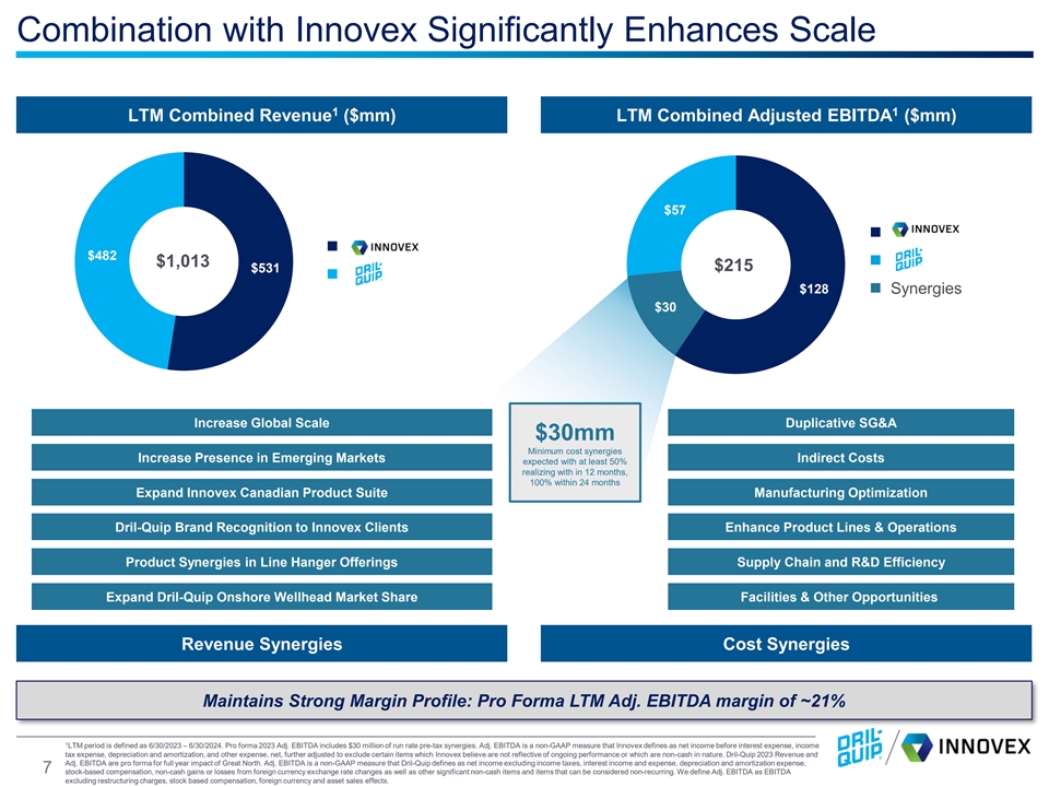 Combination Creates Unique Energy Industrial Platform Positions Company With Scale and Diversified Presence Across the Most Attractive 1 Global Markets 2 Establishes a Curated Portfolio of Complementary, Mission Critical Products Key Market Expansion Through Cross-Sell and Accelerated Penetration – 3 Lower 48, Canada, Saudi Arabia and Global Offshore Unlocks Significant and Achievable Cost Synergies 4 Attractive Relative Valuation and Business Mix Improves Earnings 5 Stability, Resilience and Growth for All DRQ Stakeholders Immediately and Significantly Accretive on All Metrics to Dril-Quip 6 Shareholders Maintains Net Cash Position For Future Investment and Acquisitions 7 Facilitates Best-In-Class Practices and Leadership From Respective 8 Companies Robust Process Reviewing Value-Maximizing Strategies 9 6
