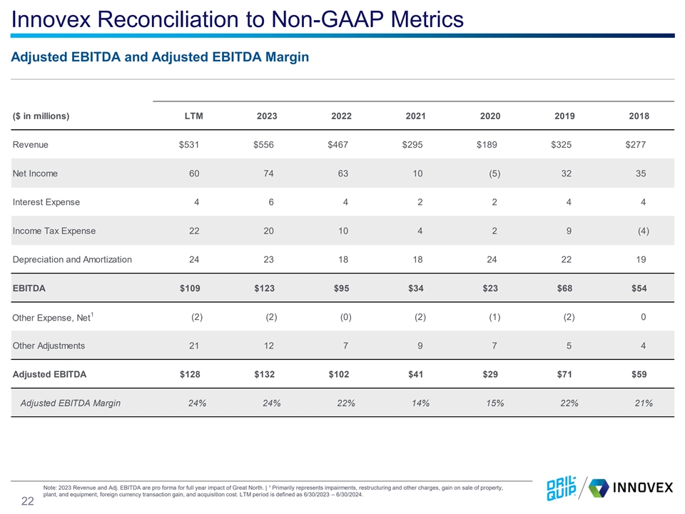 Dril-Quip Reconciliation to Non-GAAP Metrics Adjusted EBITDA and Adjusted EBITDA Margin ($ in millions) LTM 2023 2022 2021 2020 2019 2018 Revenue $482 $478 $362 $323 $365 $415 $385 Net Income (27) 1 (2) (128) (31) 2 (96) Interest Expense (8) (8) (4) 0 (2) (8) (8) Income Tax Expense 10 13 6 3 (31) 9 (19) Depreciation and Amortization 33 30 29 30 32 34 35 1 37 13 (10) 28 50 1 91 Other Expense, Net Stock Based Compensation 12 11 10 15 13 16 13 Adjusted EBITDA $57 $59 $30 ($52) $32 $54 $17 Adjusted EBITDA Margin 12% 12% 8% (16%) 9% 13% 5% Note: 2023 Revenue and Adj. EBITDA are pro forma for full year impact of Great North. | ¹ Primarily represents impairments, restructuring and other charges, gain on sale of property, plant, and equipment, foreign currency transaction gain, and acquisition cost. LTM period is defined as 6/30/2023 – 6/30/2024. 21