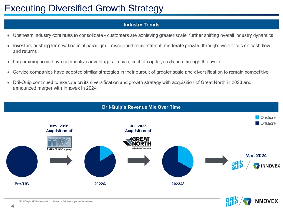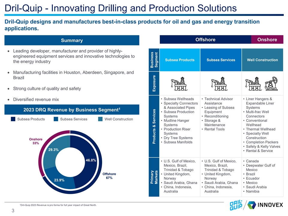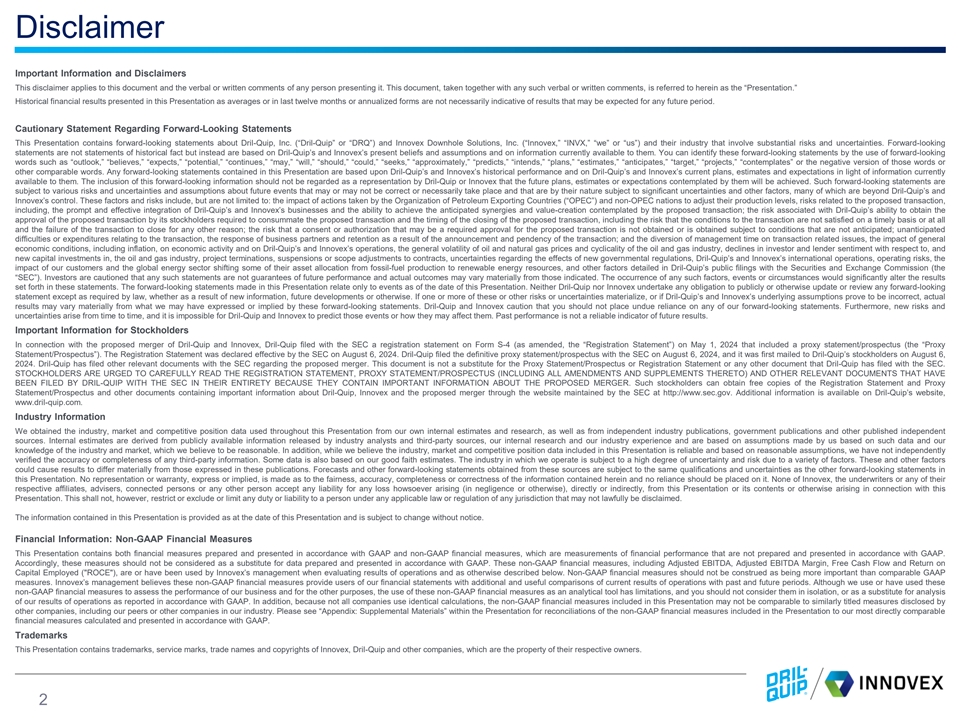 Disclaimer Important Information and Disclaimers This disclaimer applies to this document and the verbal or written comments of any person presenting it. This document, taken together with any such verbal or written comments, is referred to herein as the “Presentation.” Historical financial results presented in this Presentation as averages or in last twelve months or annualized forms are not necessarily indicative of results that may be expected for any future period. Cautionary Statement Regarding Forward-Looking Statements This Presentation contains forward-looking statements about Dril-Quip, Inc. (“Dril-Quip” or “DRQ”) and Innovex Downhole Solutions, Inc. (“Innovex,” “INVX,” “we” or “us”) and their industry that involve substantial risks and uncertainties. Forward-looking statements are not statements of historical fact but instead are based on Dril-Quip’s and Innovex’s present beliefs and assumptions and on information currently available to them. You can identify these forward-looking statements by the use of forward-looking words such as “outlook,” “believes,” “expects,” “potential,” “continues,” “may,” “will,” “should,” “could,” “seeks,” “approximately,” “predicts,” “intends,” “plans,” “estimates,” “anticipates,” “target,” “projects,” “contemplates” or the negative version of those words or other comparable words. Any forward-looking statements contained in this Presentation are based upon Dril-Quip’s and Innovex’s historical performance and on Dril-Quip’s and Innovex’s current plans, estimates and expectations in light of information currently available to them. The inclusion of this forward-looking information should not be regarded as a representation by Dril-Quip or Innovex that the future plans, estimates or expectations contemplated by them will be achieved. Such forward-looking statements are subject to various risks and uncertainties and assumptions about future events that may or may not be correct or necessarily take place and that are by their nature subject to significant uncertainties and other factors, many of which are beyond Dril-Quip’s and Innovex’s control. These factors and risks include, but are not limited to: the impact of actions taken by the Organization of Petroleum Exporting Countries (“OPEC”) and non-OPEC nations to adjust their production levels, risks related to the proposed transaction, including, the prompt and effective integration of Dril-Quip’s and Innovex’s businesses and the ability to achieve the anticipated synergies and value-creation contemplated by the proposed transaction; the risk associated with Dril-Quip’s ability to obtain the approval of the proposed transaction by its stockholders required to consummate the proposed transaction and the timing of the closing of the proposed transaction, including the risk that the conditions to the transaction are not satisfied on a timely basis or at all and the failure of the transaction to close for any other reason; the risk that a consent or authorization that may be a required approval for the proposed transaction is not obtained or is obtained subject to conditions that are not anticipated; unanticipated difficulties or expenditures relating to the transaction, the response of business partners and retention as a result of the announcement and pendency of the transaction; and the diversion of management time on transaction related issues, the impact of general economic conditions, including inflation, on economic activity and on Dril-Quip’s and Innovex’s operations, the general volatility of oil and natural gas prices and cyclicality of the oil and gas industry, declines in investor and lender sentiment with respect to, and new capital investments in, the oil and gas industry, project terminations, suspensions or scope adjustments to contracts, uncertainties regarding the effects of new governmental regulations, Dril-Quip’s and Innovex’s international operations, operating risks, the impact of our customers and the global energy sector shifting some of their asset allocation from fossil-fuel production to renewable energy resources, and other factors detailed in Dril-Quip’s public filings with the Securities and Exchange Commission (the “SEC”). Investors are cautioned that any such statements are not guarantees of future performance and actual outcomes may vary materially from those indicated. The occurrence of any such factors, events or circumstances would significantly alter the results set forth in these statements. The forward-looking statements made in this Presentation relate only to events as of the date of this Presentation. Neither Dril-Quip nor Innovex undertake any obligation to publicly or otherwise update or review any forward-looking statement except as required by law, whether as a result of new information, future developments or otherwise. If one or more of these or other risks or uncertainties materialize, or if Dril-Quip’s and Innovex’s underlying assumptions prove to be incorrect, actual results may vary materially from what we may have expressed or implied by these forward-looking statements. Dril-Quip and Innovex caution that you should not place undue reliance on any of our forward-looking statements. Furthermore, new risks and uncertainties arise from time to time, and it is impossible for Dril-Quip and Innovex to predict those events or how they may affect them. Past performance is not a reliable indicator of future results. Important Information for Stockholders In connection with the proposed merger of Dril-Quip and Innovex, Dril-Quip filed with the SEC a registration statement on Form S-4 (as amended, the “Registration Statement”) on May 1, 2024 that included a proxy statement/prospectus (the “Proxy Statement/Prospectus”). The Registration Statement was declared effective by the SEC on August 6, 2024. Dril-Quip 