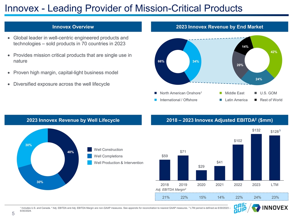 Executing Diversified Growth Strategy Industry Trends • Upstream industry continues to consolidate - customers are achieving greater scale, further shifting overall industry dynamics • Investors pushing for new financial paradigm – disciplined reinvestment, moderate growth, through-cycle focus on cash flow and returns • Larger companies have competitive advantages – scale, cost of capital, resilience through the cycle • Service companies have adopted similar strategies in their pursuit of greater scale and diversification to remain competitive • Dril-Quip continued to execute on its diversification and growth strategy with acquisition of Great North in 2023 and announced merger with Innovex in 2024 Dril-Quip’s Revenue Mix Over Time Onshore Offshore Nov. 2016 Jul. 2023 Acquisition of Acquisition of Mar. 2024 1 Pre-TIW 2022A 2023A 1 Dril-Quip 2023 Revenue is pro forma for full year impact of Great North. 4