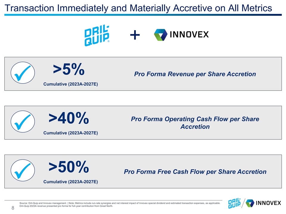 Combination with Innovex Significantly Enhances Scale 1 1 LTM Combined Revenue ($mm) LTM Combined Adjusted EBITDA ($mm) $57 ◼ Innovex ◼ Innovex $482 $1,013 ◼ Dril-Quip $215 $531 ◼ Dril-Quip $128 ◼ Synergies $30 Increase Global Scale Duplicative SG&A $30mm Minimum cost synergies Increase Presence in Emerging Markets Indirect Costs expected with at least 50% realizing with in 12 months, 100% within 24 months Expand Innovex Canadian Product Suite Manufacturing Optimization Dril-Quip Brand Recognition to Innovex Clients Enhance Product Lines & Operations Product Synergies in Line Hanger Offerings Supply Chain and R&D Efficiency Expand Dril-Quip Onshore Wellhead Market Share Facilities & Other Opportunities Revenue Synergies Cost Synergies Maintains Strong Margin Profile: Pro Forma LTM Adj. EBITDA margin of ~21% 1 LTM period is defined as 6/30/2023 – 6/30/2024. Pro forma 2023 Adj. EBITDA includes $30 million of run rate pre-tax synergies. Adj. EBITDA is a non-GAAP measure that Innovex defines as net income before interest expense, income tax expense, depreciation and amortization, and other expense, net, further adjusted to exclude certain items which Innovex believe are not reflective of ongoing performance or which are non-cash in nature. Dril-Quip 2023 Revenue and Adj. EBITDA are pro forma for full year impact of Great North. Adj. EBITDA is a non-GAAP measure that Dril-Quip defines as net income excluding income taxes, interest income and expense, depreciation and amortization expense, 7 stock-based compensation, non-cash gains or losses from foreign currency exchange rate changes as well as other significant non-cash items and items that can be considered non-recurring. We define Adj. EBITDA as EBITDA excluding restructuring charges, stock based compensation, foreign currency and asset sales effects.