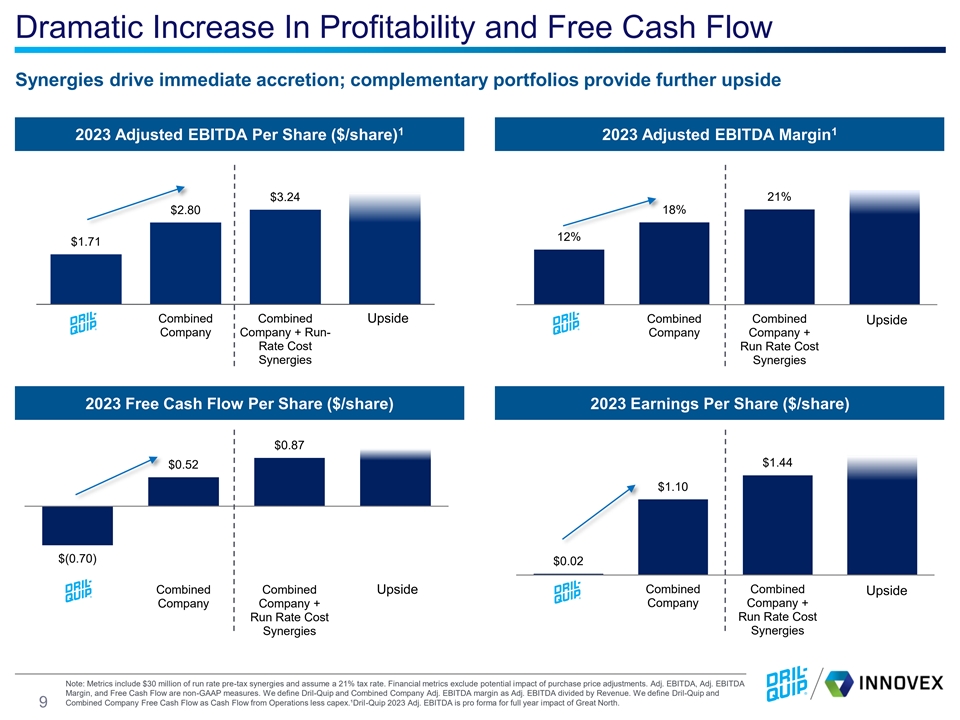 Transaction Immediately and Materially Accretive on All Metrics + >5% Pro Forma Revenue per Share Accretion P Cumulative (2023A-2027E) Pro Forma Operating Cash Flow per Share >40% Accretion P Cumulative (2023A-2027E) >50% Pro Forma Free Cash Flow per Share Accretion P Cumulative (2023A-2027E) Source: Dril-Quip and Innovex management. | Note: Metrics include run-rate synergies and net interest impact of Innovex special dividend and estimated transaction expenses, as applicable. Dril-Quip 2023A revenue presented pro forma for full-year contribution from Great North. 8