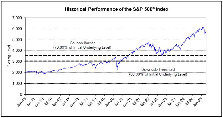 The following graph sets forth the historical performance of the SPX Index from January 2, 2015 through April 4, 2025, based on the daily Closing Levels of the SPX Index. The Closing Level of the SPX Index on April 4, 2025 was 5,074.08. The dotted lines represent the Coupon Barrier and the Downside Threshold of 3,551.86 and 3,044.45, respectively, which are equal to 70.00% and 60.00%, respectively, of the Initial Underlying Level of the SPX Index.