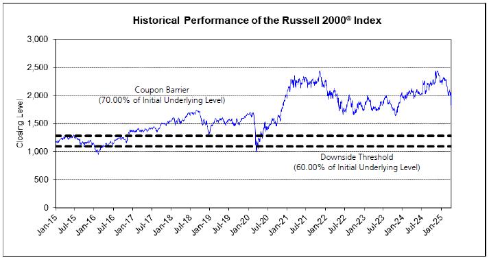 The following graph sets forth the historical performance of the RTY Index from January 2, 2015 through April 4, 2025, based on the daily Closing Levels of the RTY Index. The Closing Level of the RTY Index on April 4, 2025 was 1,827.032. The dotted lines represent the Coupon Barrier and the Downside Threshold of 1,278.922 and 1,096.219, respectively, which are equal to 70.00% and 60.00%, respectively, of the Initial Underlying Level of the RTY Index.