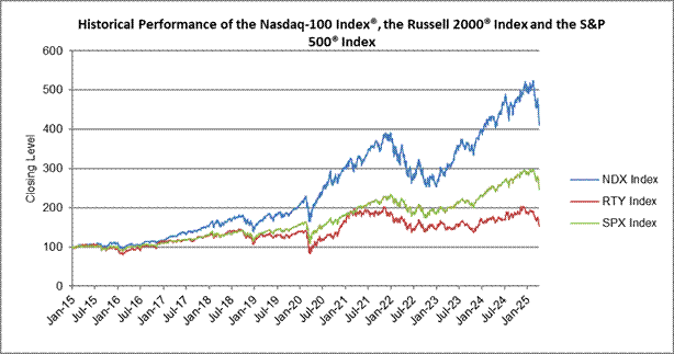 The following graph sets forth the historical performances of the Nasdaq-100 Index®, the Russell 2000® Index and the S&P 500® Index from January 2, 2015 through April 4, 2025, based on the daily Closing Levels of the Underlyings. For comparison purposes, each Underlying has been normalized to have a Closing Level of 100.00 on January 2, 2015 by dividing the Closing Level of that Underlying on each day by the Closing Level of that Underlying on January 2, 2015 and multiplying by 100.00.