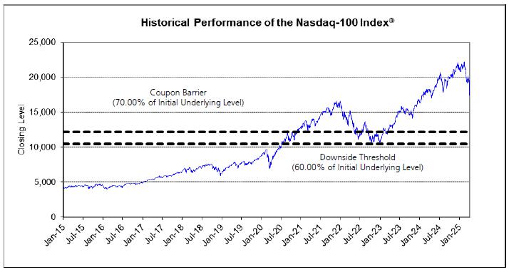 The following graph sets forth the historical performance of the NDX Index from January 2, 2015 through April 4, 2025, based on the daily Closing Levels of the NDX Index. The Closing Level of the NDX Index on April 4, 2025 was 17,397.70. The dotted lines represent the Coupon Barrier and the Downside Threshold of 12,178.39 and 10,438.62, respectively, which are equal to 70.00% and 60.00%, respectively, of the Initial Underlying Level of the NDX Index.
