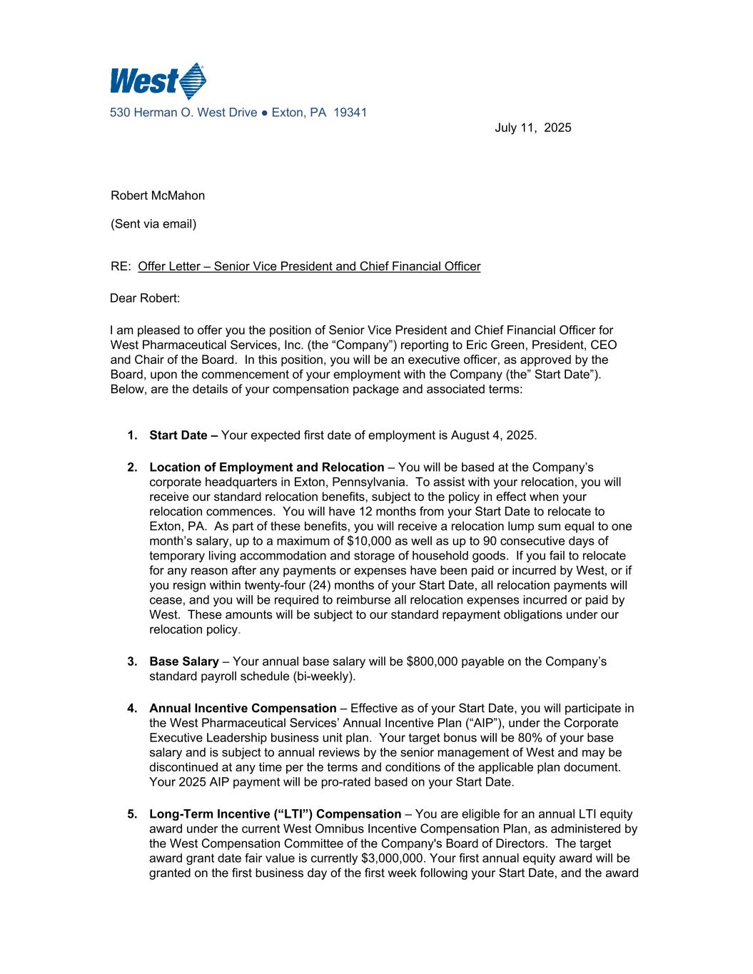 530 Herman O. West Drive ● Exton, PA 19341 July 11, 2025 Robert McMahon (Sent via email) RE: Offer Letter – Senior Vice President and Chief Financial Officer Dear Robert: I am pleased to offer you the position of Senior Vice President and Chief Financial Officer for West Pharmaceutical Services, Inc. (the “Company”) reporting to Eric Green, President, CEO and Chair of the Board. In this position, you will be an executive officer, as approved by the Board, upon the commencement of your employment with the Company (the” Start Date”). Below, are the details of your compensation package and associated terms: 1. Start Date – Your expected first date of employment is August 4, 2025. 2. Location of Employment and Relocation – You will be based at the Company’s corporate headquarters in Exton, Pennsylvania. To assist with your relocation, you will receive our standard relocation benefits, subject to the policy in effect when your relocation commences. You will have 12 months from your Start Date to relocate to Exton, PA. As part of these benefits, you will receive a relocation lump sum equal to one month’s salary, up to a maximum of $10,000 as well as up to 90 consecutive days of temporary living accommodation and storage of household goods. If you fail to relocate for any reason after any payments or expenses have been paid or incurred by West, or if you resign within twenty-four (24) months of your Start Date, all relocation payments will cease, and you will be required to reimburse all relocation expenses incurred or paid by West. These amounts will be subject to our standard repayment obligations under our relocation policy. 3. Base Salary – Your annual base salary will be $800,000 payable on the Company’s standard payroll schedule (bi-weekly). 4. Annual Incentive Compensation – Effective as of your Start Date, you will participate in the West Pharmaceutical Services’ Annual Incentive Plan (“AIP”), under the Corporate Executive Leadership business unit plan. Your target bonus will be 80% of your base salary and is subject to annual reviews by the senior management of West and may be discontinued at any time per the terms and conditions of the applicable plan document. Your 2025 AIP payment will be pro-rated based on your Start Date. 5. Long-Term Incentive (“LTI”) Compensation – You are eligible for an annual LTI equity award under the current West Omnibus Incentive Compensation Plan, as administered by the West Compensation Committee of the Company's Board of Directors. The target award grant date fair value is currently $3,000,000. Your first annual equity award will be granted on the first business day of the first week following your Start Date, and the award