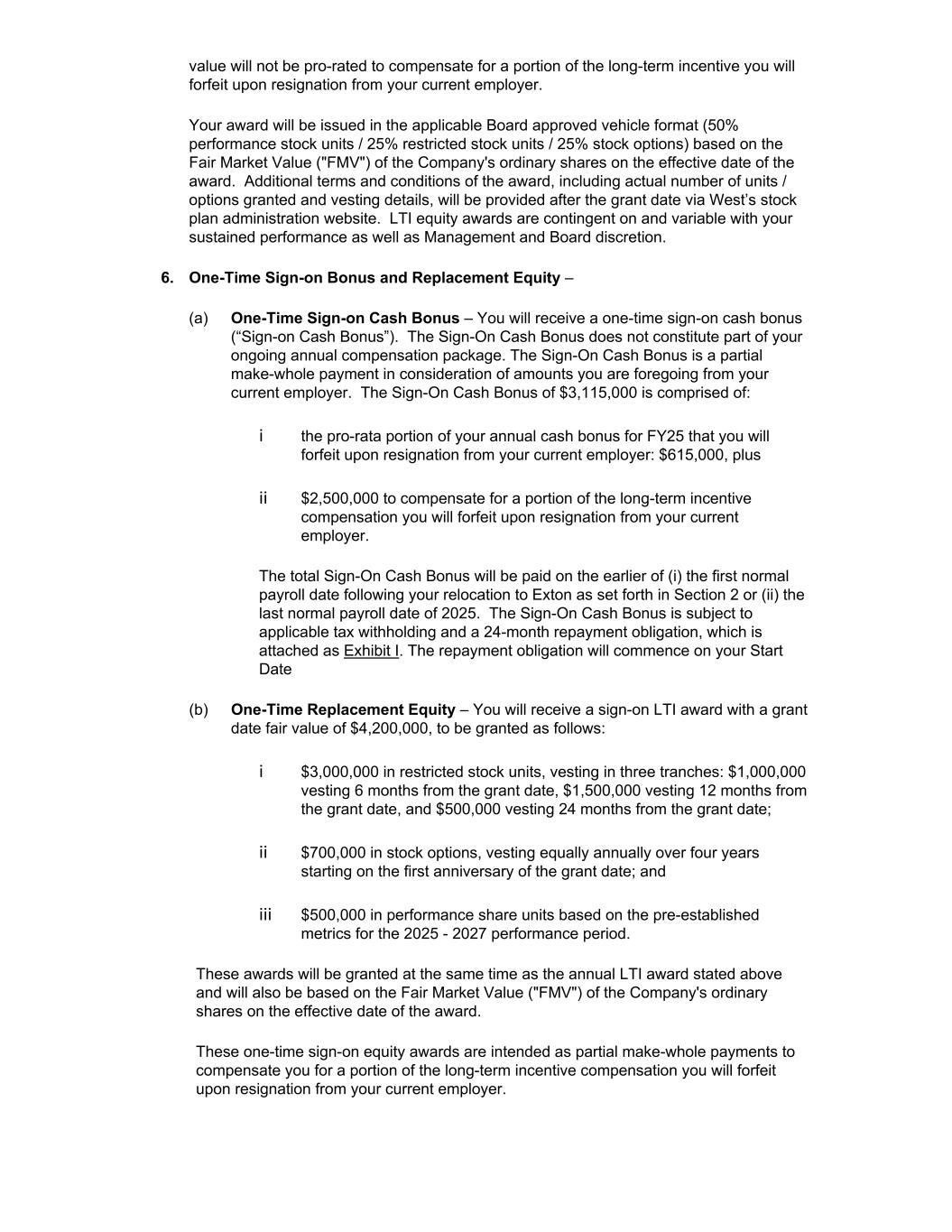 value will not be pro-rated to compensate for a portion of the long-term incentive you will forfeit upon resignation from your current employer. Your award will be issued in the applicable Board approved vehicle format (50% performance stock units / 25% restricted stock units / 25% stock options) based on the Fair Market Value ("FMV") of the Company's ordinary shares on the effective date of the award. Additional terms and conditions of the award, including actual number of units / options granted and vesting details, will be provided after the grant date via West’s stock plan administration website. LTI equity awards are contingent on and variable with your sustained performance as well as Management and Board discretion. 6. One-Time Sign-on Bonus and Replacement Equity – (a) One-Time Sign-on Cash Bonus – You will receive a one-time sign-on cash bonus (“Sign-on Cash Bonus”). The Sign-On Cash Bonus does not constitute part of your ongoing annual compensation package. The Sign-On Cash Bonus is a partial make-whole payment in consideration of amounts you are foregoing from your current employer. The Sign-On Cash Bonus of $3,115,000 is comprised of: i the pro-rata portion of your annual cash bonus for FY25 that you will forfeit upon resignation from your current employer: $615,000, plus ii $2,500,000 to compensate for a portion of the long-term incentive compensation you will forfeit upon resignation from your current employer. The total Sign-On Cash Bonus will be paid on the earlier of (i) the first normal payroll date following your relocation to Exton as set forth in Section 2 or (ii) the last normal payroll date of 2025. The Sign-On Cash Bonus is subject to applicable tax withholding and a 24-month repayment obligation, which is attached as Exhibit I. The repayment obligation will commence on your Start Date (b) One-Time Replacement Equity – You will receive a sign-on LTI award with a grant date fair value of $4,200,000, to be granted as follows: i $3,000,000 in restricted stock units, vesting in three tranches: $1,000,000 vesting 6 months from the grant date, $1,500,000 vesting 12 months from the grant date, and $500,000 vesting 24 months from the grant date; ii $700,000 in stock options, vesting equally annually over four years starting on the first anniversary of the grant date; and iii $500,000 in performance share units based on the pre-established metrics for the 2025 - 2027 performance period. These awards will be granted at the same time as the annual LTI award stated above and will also be based on the Fair Market Value ("FMV") of the Company's ordinary shares on the effective date of the award. These one-time sign-on equity awards are intended as partial make-whole payments to compensate you for a portion of the long-term incentive compensation you will forfeit upon resignation from your current employer.