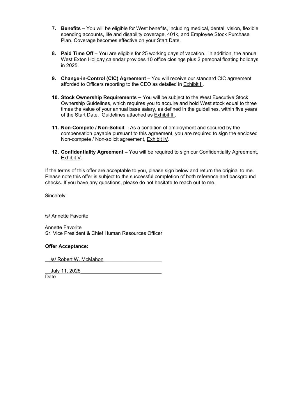 7. Benefits – You will be eligible for West benefits, including medical, dental, vision, flexible spending accounts, life and disability coverage, 401k, and Employee Stock Purchase Plan. Coverage becomes effective on your Start Date. 8. Paid Time Off – You are eligible for 25 working days of vacation. In addition, the annual West Exton Holiday calendar provides 10 office closings plus 2 personal floating holidays in 2025. 9. Change-in-Control (CIC) Agreement – You will receive our standard CIC agreement afforded to Officers reporting to the CEO as detailed in Exhibit II. 10. Stock Ownership Requirements – You will be subject to the West Executive Stock Ownership Guidelines, which requires you to acquire and hold West stock equal to three times the value of your annual base salary, as defined in the guidelines, within five years of the Start Date. Guidelines attached as Exhibit III. 11. Non-Compete / Non-Solicit – As a condition of employment and secured by the compensation payable pursuant to this agreement, you are required to sign the enclosed Non-compete / Non-solicit agreement, Exhibit IV. 12. Confidentiality Agreement – You will be required to sign our Confidentiality Agreement, Exhibit V. If the terms of this offer are acceptable to you, please sign below and return the original to me. Please note this offer is subject to the successful completion of both reference and background checks. If you have any questions, please do not hesitate to reach out to me. Sincerely, /s/ Annette Favorite Annette Favorite Sr. Vice President & Chief Human Resources Officer Offer Acceptance: __/s/ Robert W. McMahon_____________________ __July 11, 2025_____________________________ Date